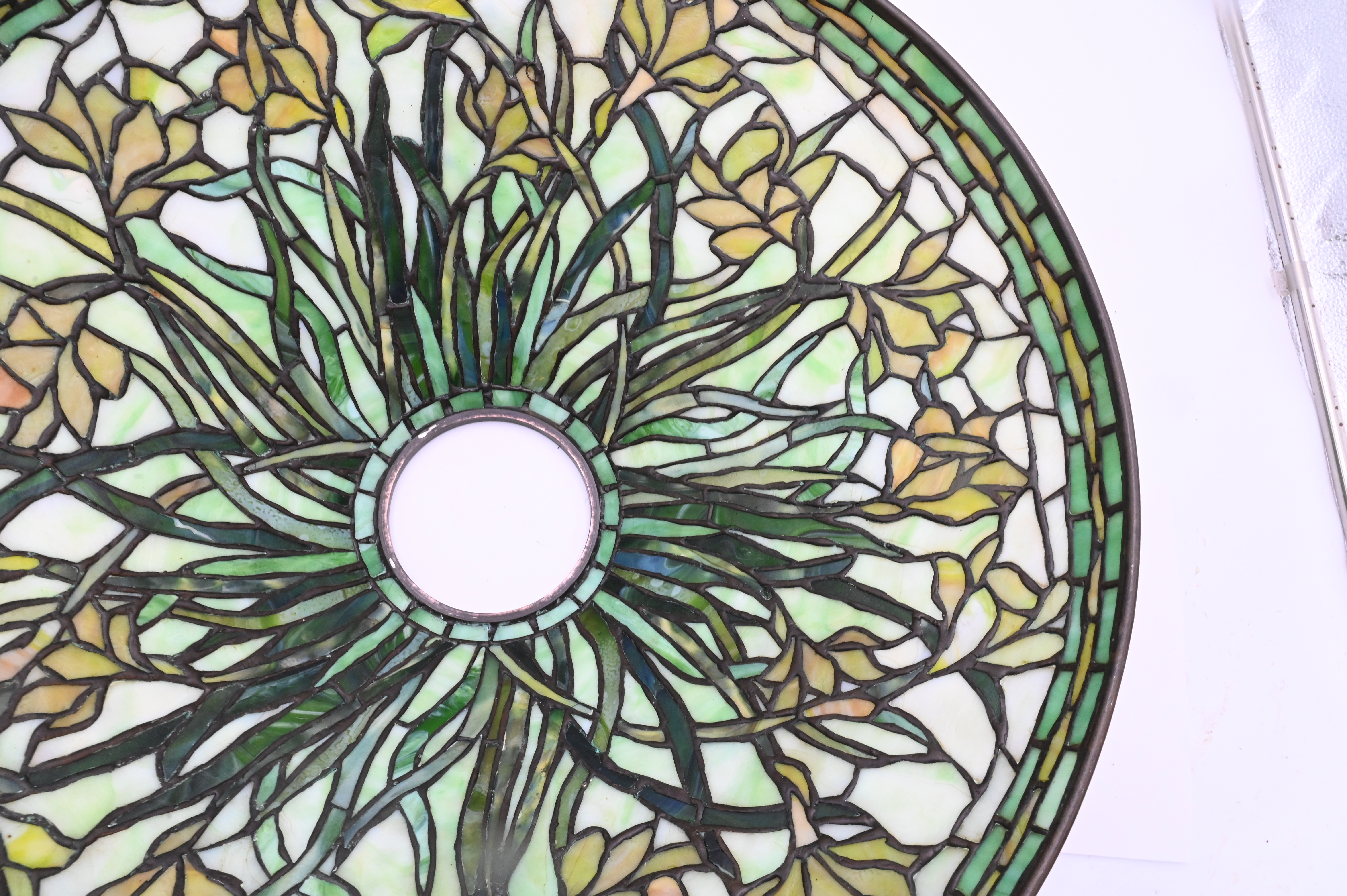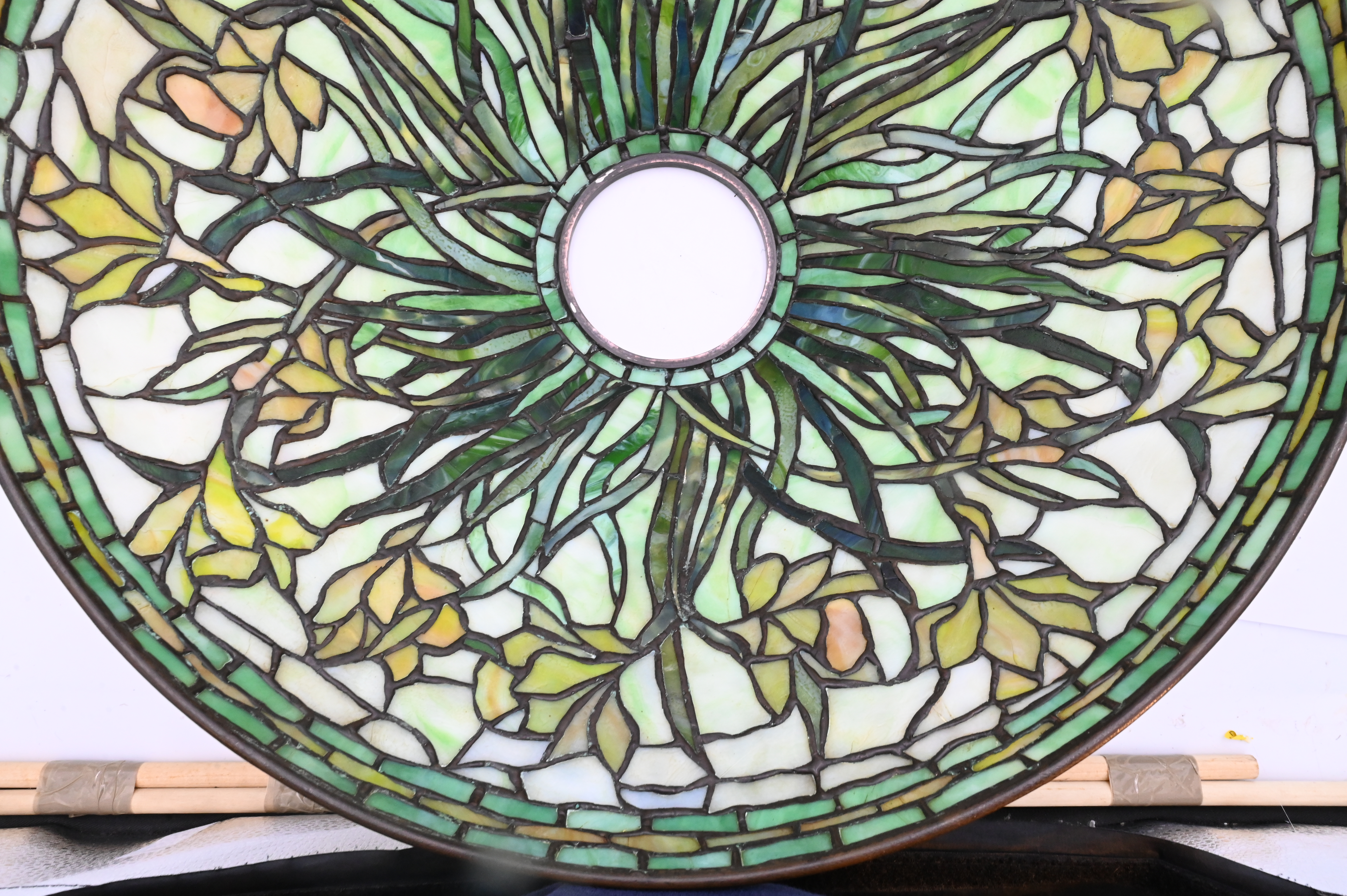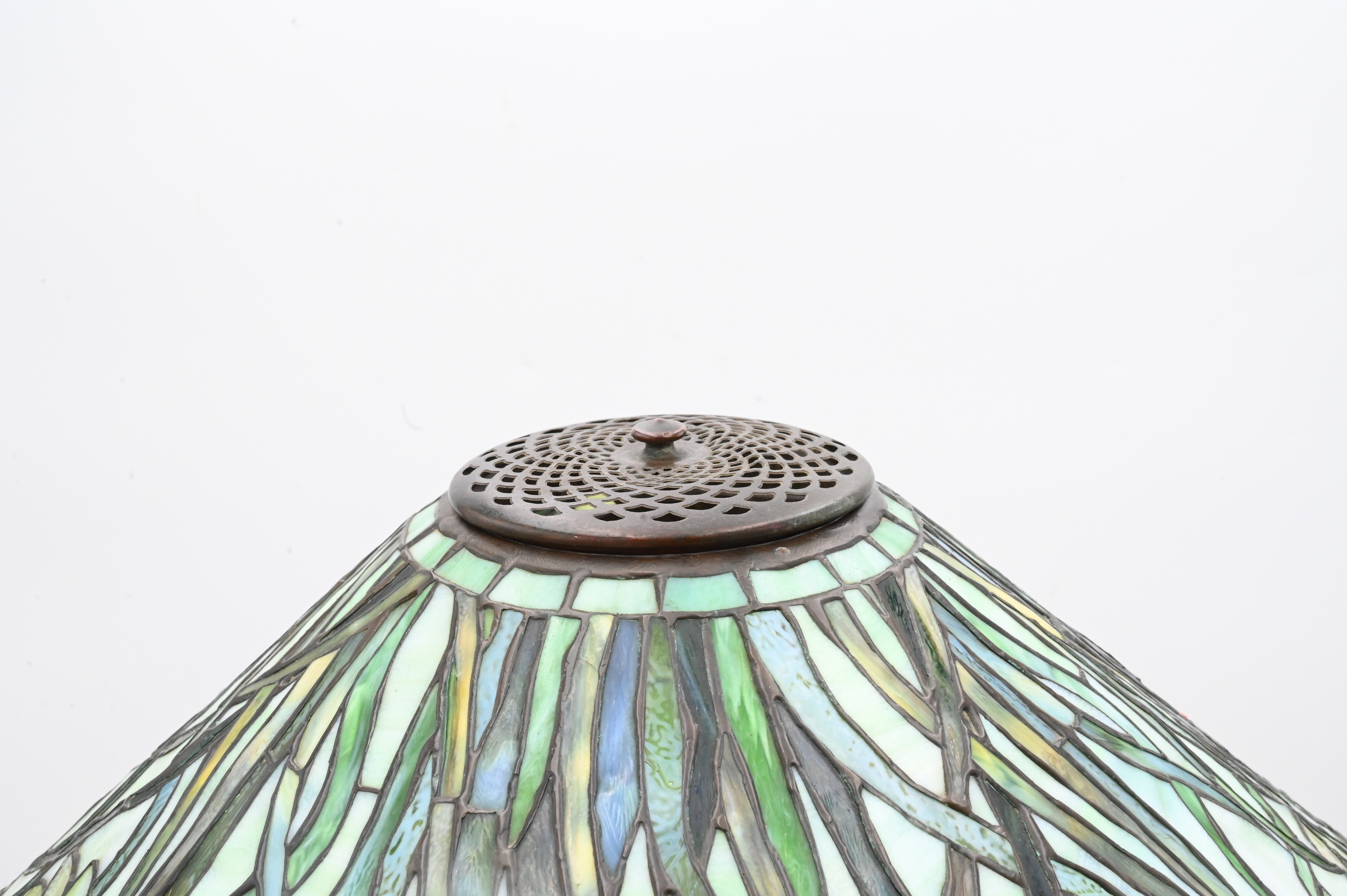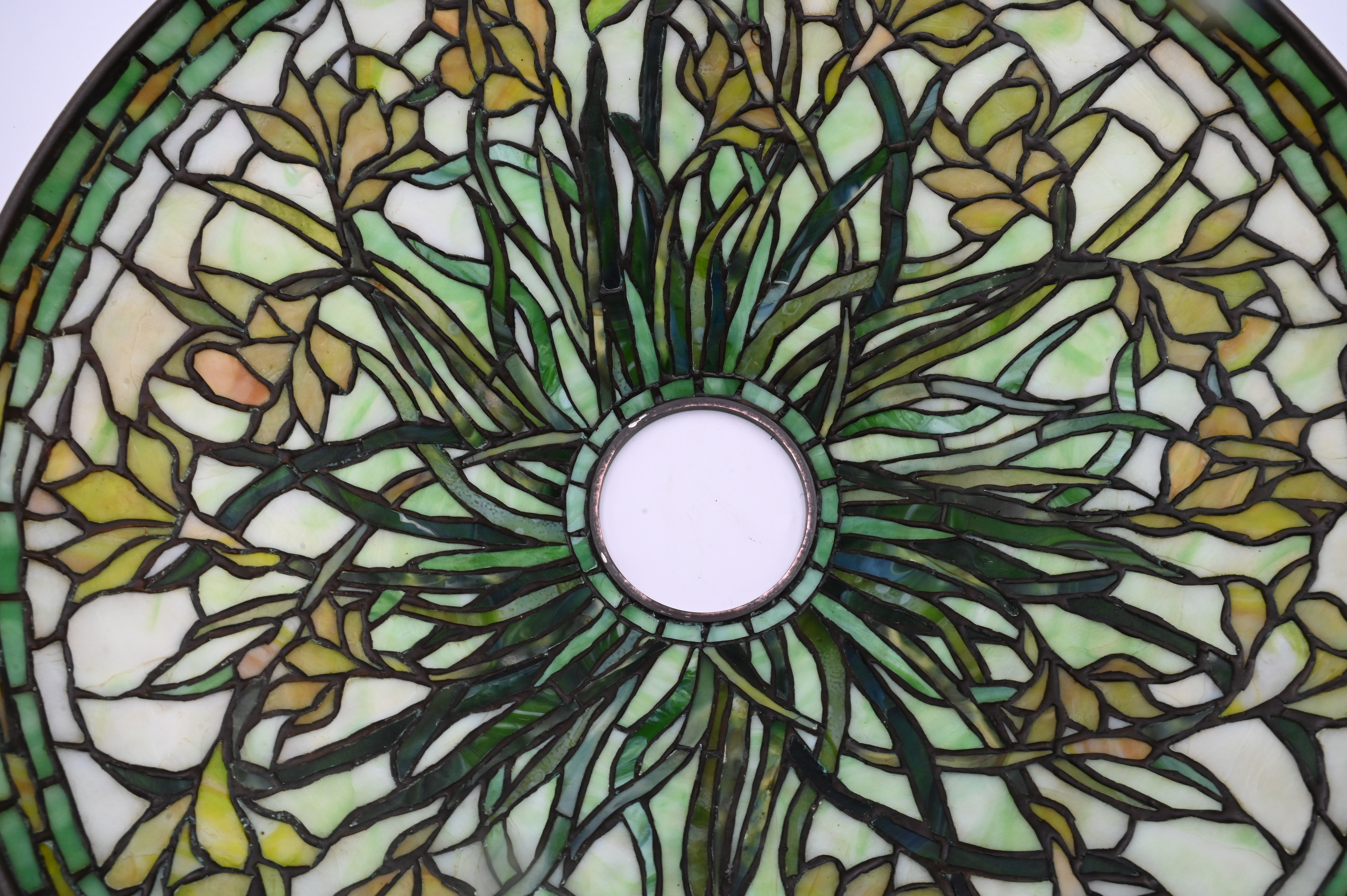 Tiffany Studios Daffodil Table Lamp, having daffodil leaded glass shade marked “Tiffany Studios, New York” over four sockets on bronze base marked “Tiffany Studios, New York, 1807”, height 25 1/2 inches, shade diameter 19 1/2 inches, presents well, shade sits slightly off kilter, shade with approximately 10 very small cracks, slight wear to top cap.
