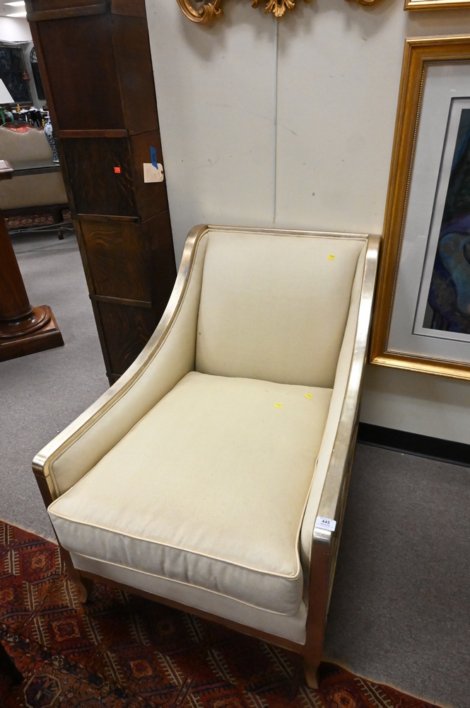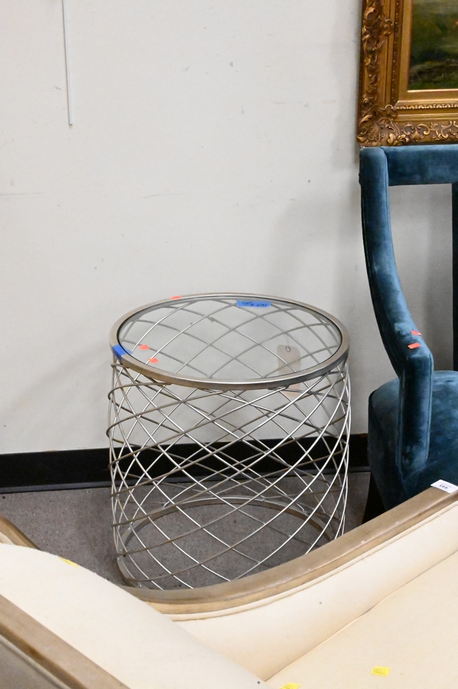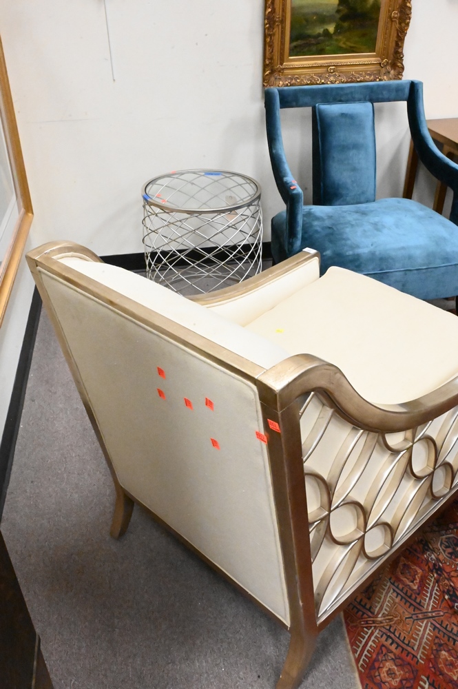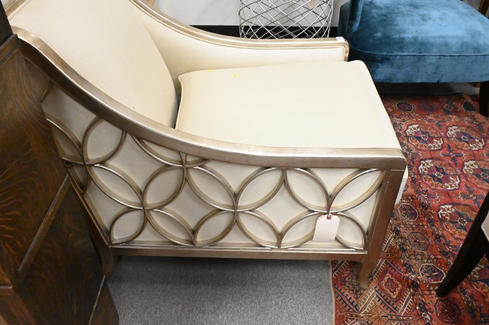 Two Piece Lot, to include silvered frame Caracole Social Butterfly chair, along with silvered round glass top side table.