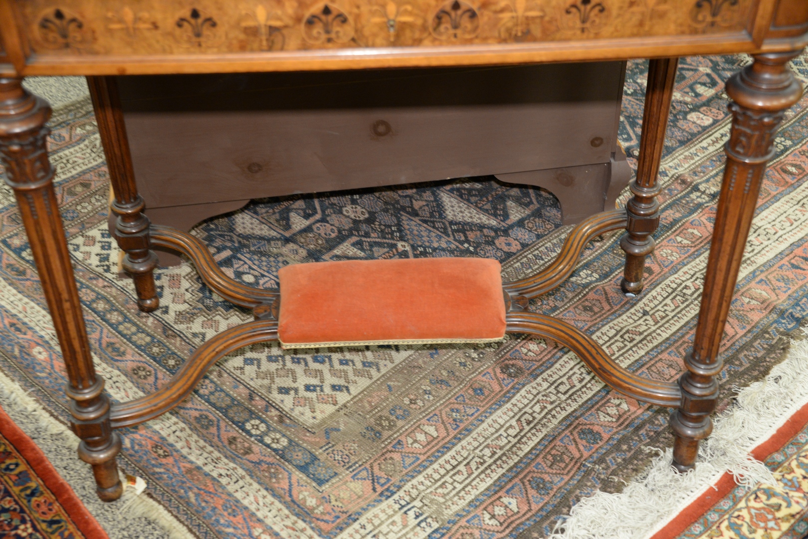 with two doors over two drawers over pull-out writing surface set on fluted legs with stretcher base, top and pullout drawers with fleur de lis inlays