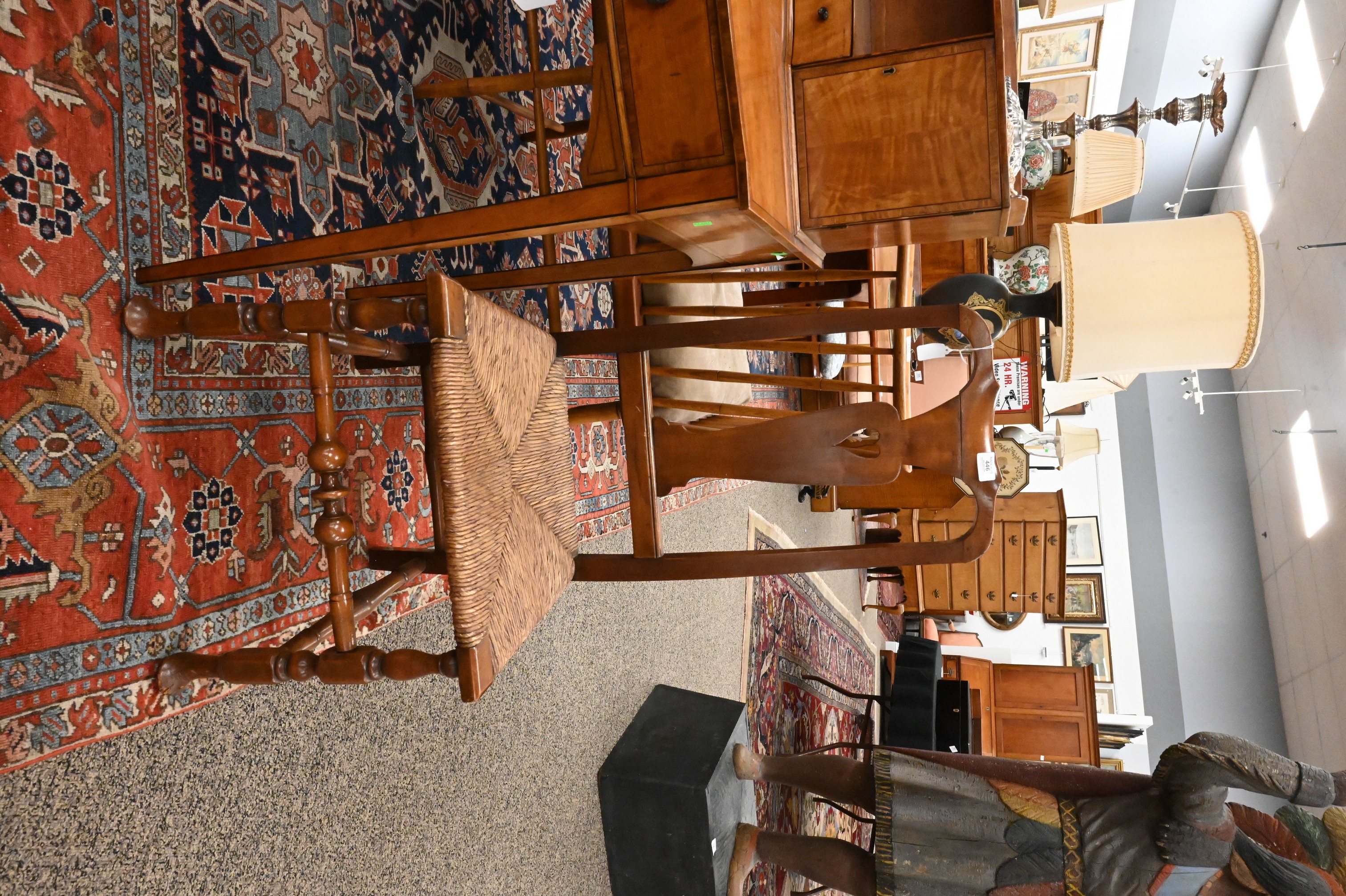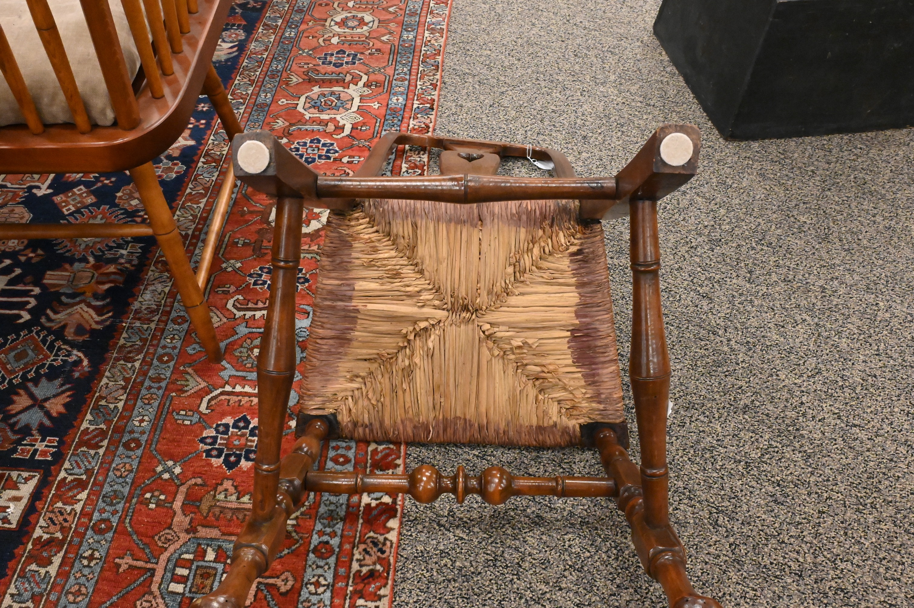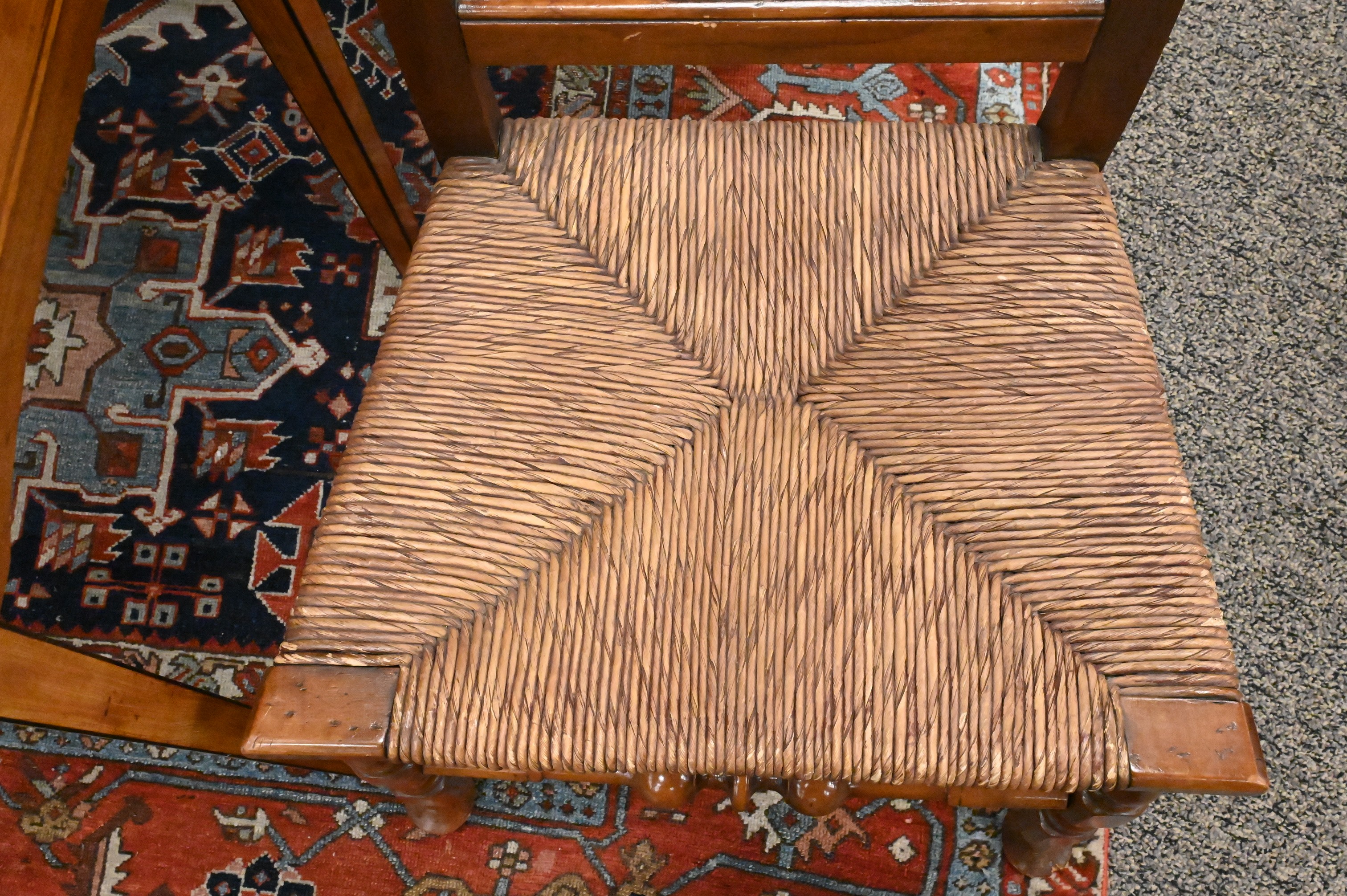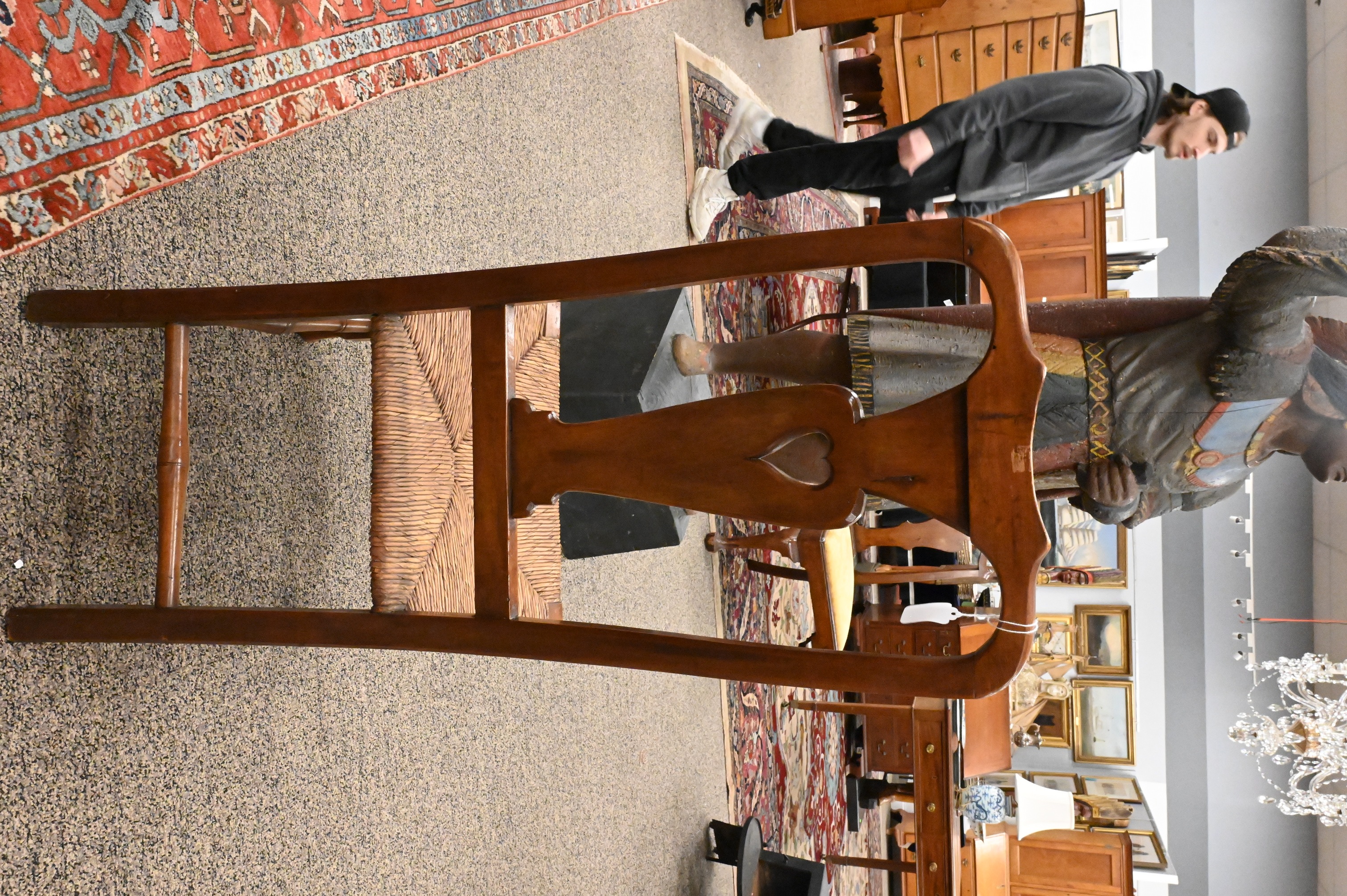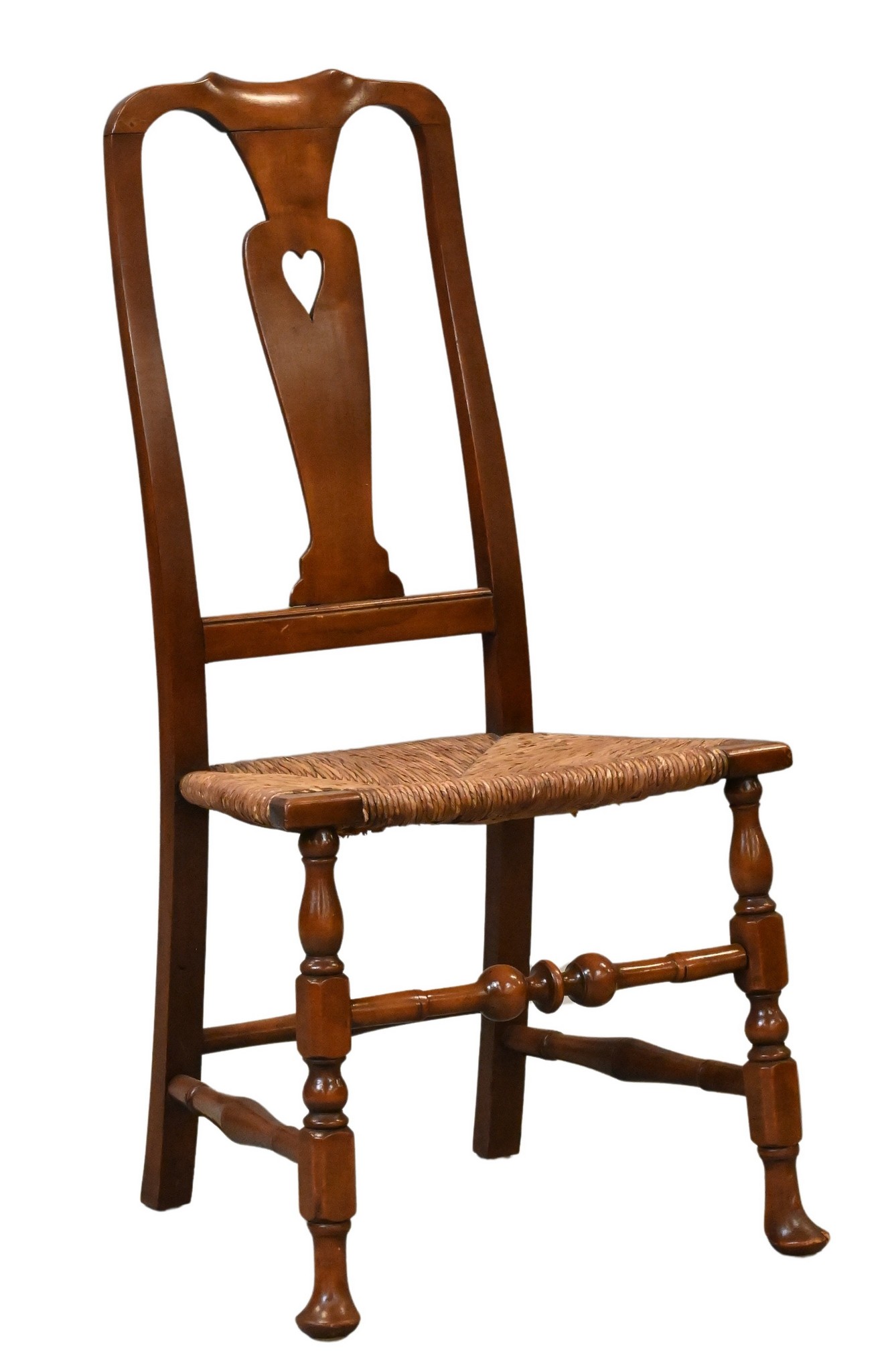 vasiform splat pierced with a heart over a rush-filled seat, turned legs and pad feet, 18th century