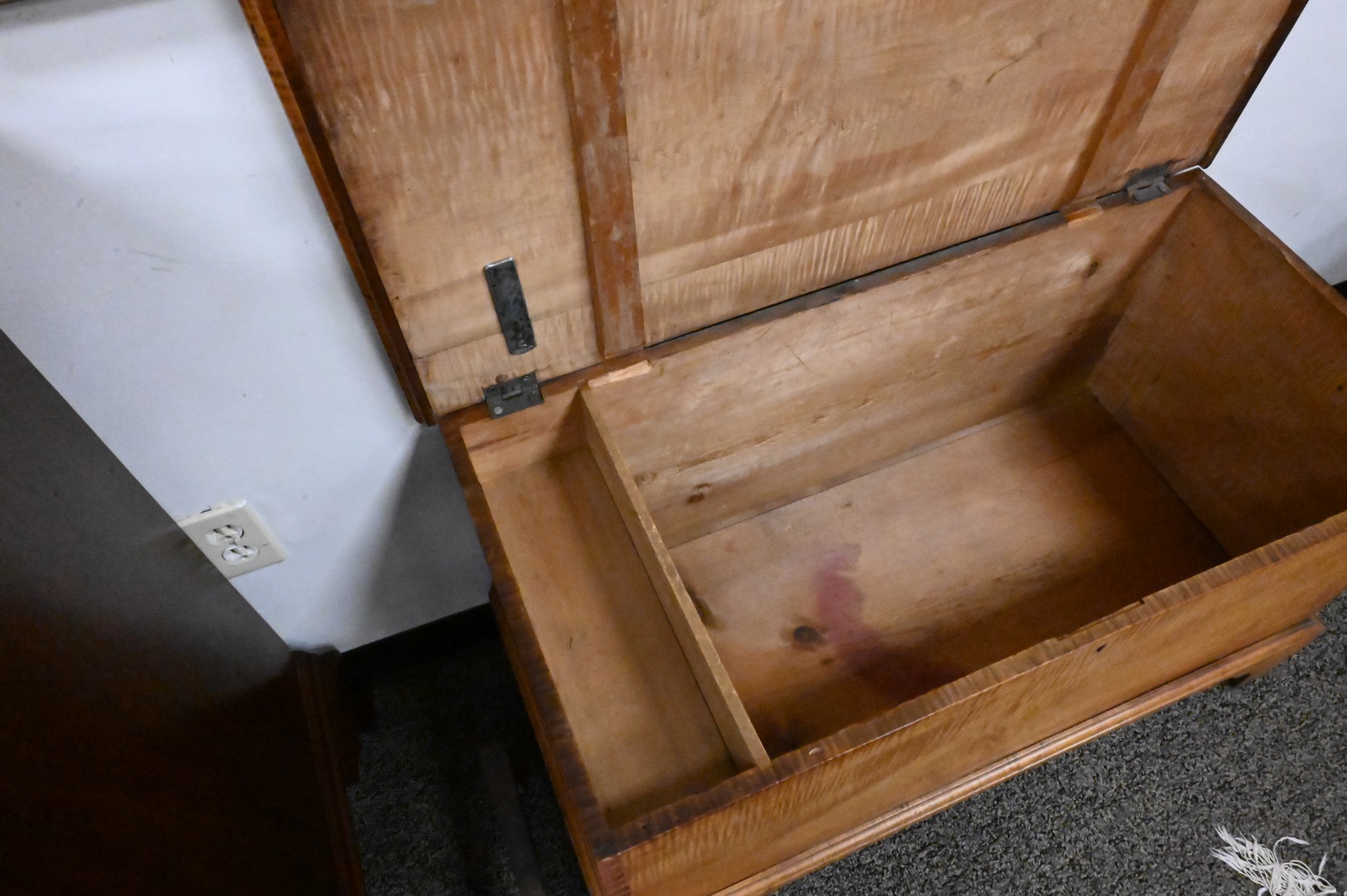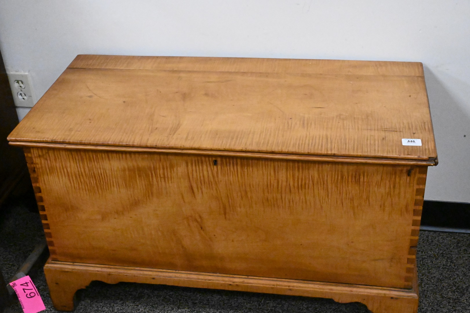 Chippendale Tiger Maple Lift Top Chest, on bracket feet, height 21 inches, top 17″ x 36″. Provenance: Estate of Peter Tillou, Litchfield, Connecticut.