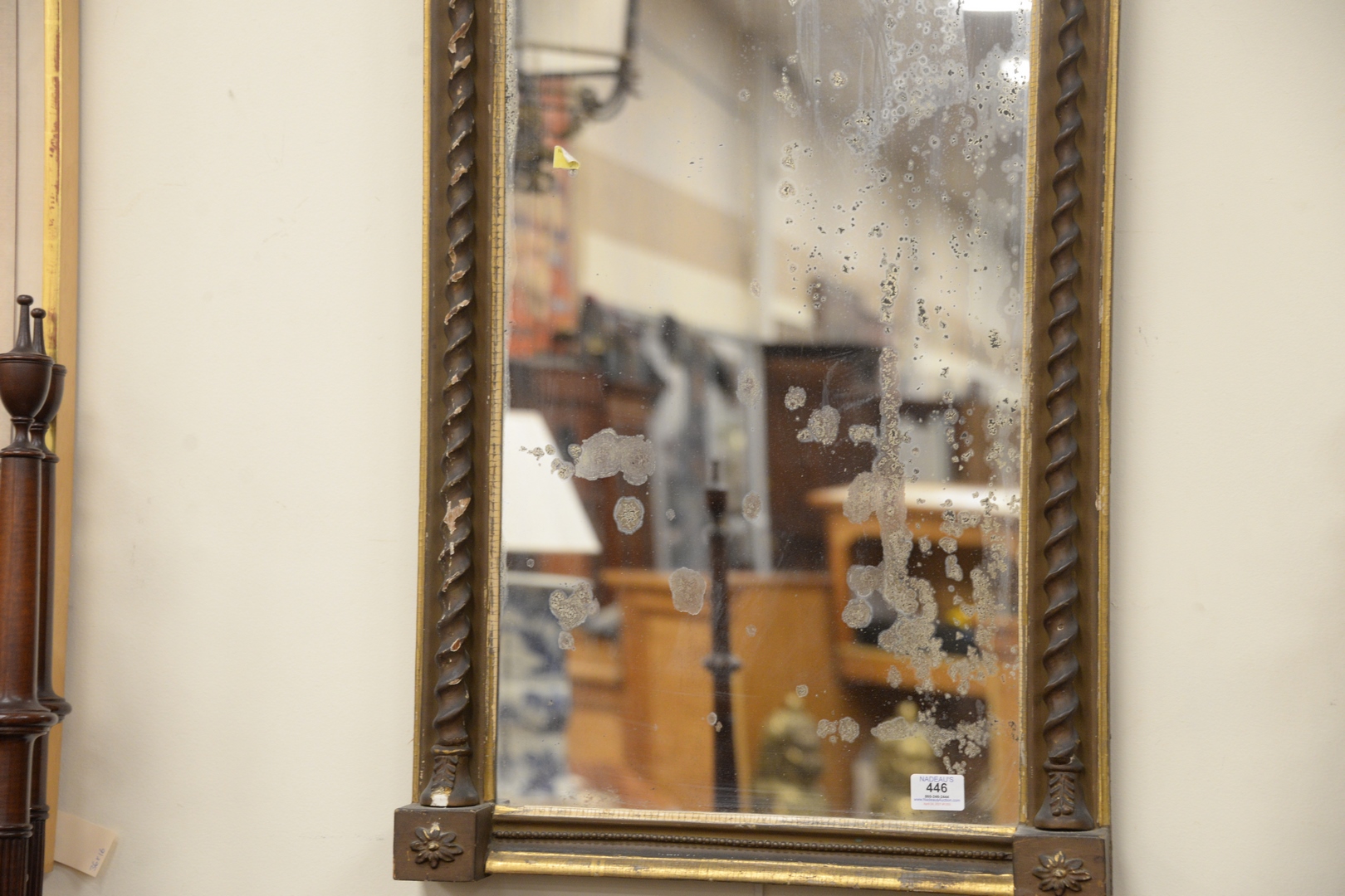 Lot 446: Federal Giltwood and Eglomise Mirror, 19th century, marked on back ‘This belonged to Sam Roddle of Philadelphia, bought by Aunt Buffie at Mr. Riddles Sale, height 44 inches, width 20 1/2 inches. Provenance: Estate of Marilyn Ware, Strasburg, Pennsyl