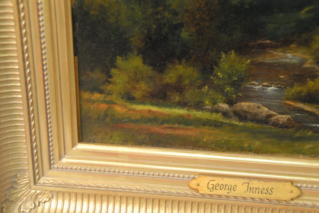 George Inness American 1825-1894 THE RAINBOW oil on artist’s board initialed lower left G.I. Provenance: Barridoff Galleries, South Portland, Maine, August 3, 2007, no 232 to Private Collection, Savannah, Georgia. 9 1/4 x 13 1/8 Painting comes with letter from Michael Quick, the writer of the catalgue raisonne of the works of George Inness. In this letter, he comments that The Rainbow presents a dramatic scene of a storm deep in the mountain wilderness. Beyond the grassy immediate foreground, light strikes rocks in the center and low trees on the left. Farther back on the left, tall trees rise on a slope. In the middle ground on the right, light strikes the bank of a stream and the bushes near it. Behind them rise tall trees in front of a steeply rising forested slope. Flowing out of the center distance, a shallow brook meanders through the middle distance and passes over rapids, before veering toward the right and the lower right corner. Over the brook and between the facing slopes at either side can be seen a distant mountain, forested on its lower slopes, its top partially hidden in cloud. In the heavily clouded sky, a storm is clearing off toward the right, leaving the partial arc of a rainbow in the upper right. he goes on to say that Having carefully studied The Rainbow over a period of time, it is my definite opinion that The Rainbow is an authentic painting by George Inness 1825-1894. I intend to publish The Rainbow in the supplement to my catalogue raisonne of the works of George Inness.