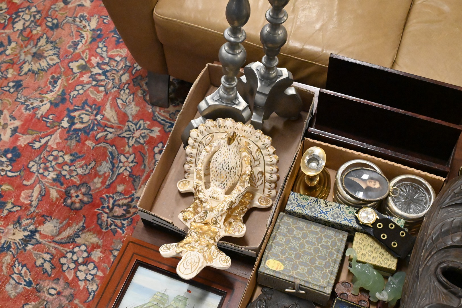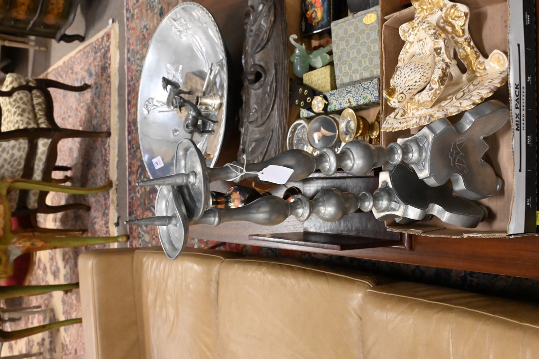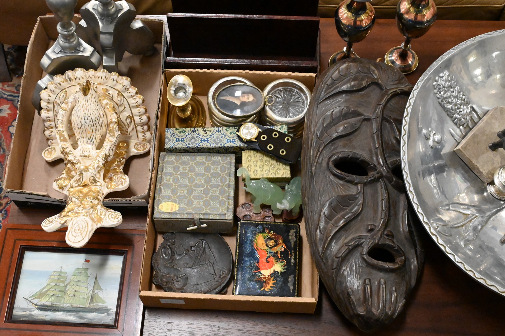 Group of Assorted Items, to include Mariposa Brillante bowl, a pair of pewter candlesticks, leather letter holder, Russian box, bookends, etc.