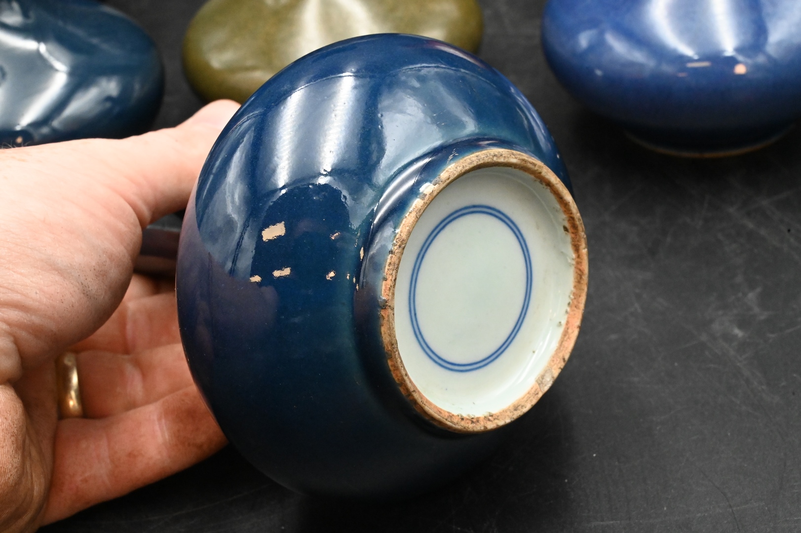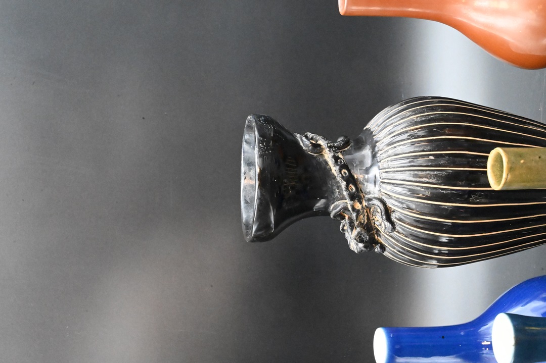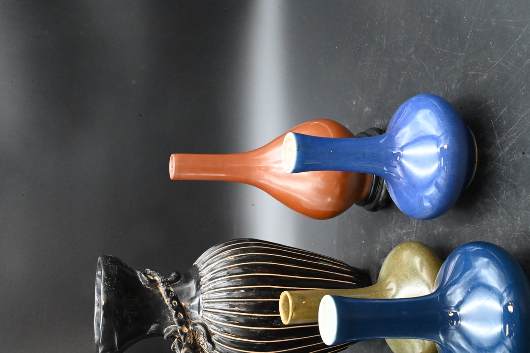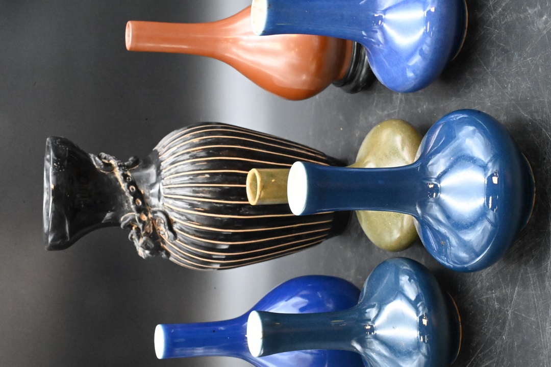 Group of Seven Chinese Porcelain Vases, to include four cobalt blue monochrome cabinet bottle vases, of compressed shape, each pair marked with a double ring on the base, similar vase of slightly lighter hue, unmarked, height 6 inches; along with a small pear-shaped bottle vase, height 7 inches, a group of three monochrome ceramics, comprised of a small iron-rust bottle vase, six-character underglaze hallmark, height 6 inches; small compressed tea dust bottle vase, height 5 inches; along with a black glazed ribbed vase having zoomorphic handles, height 10 inches.