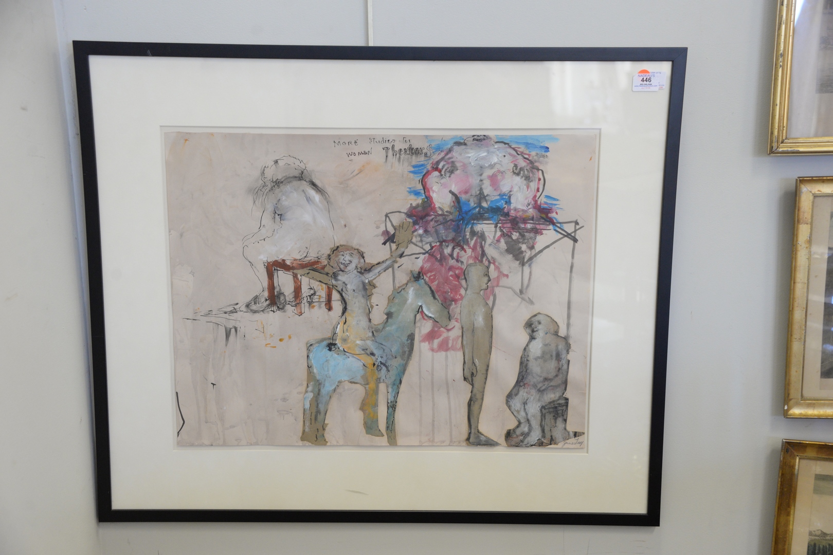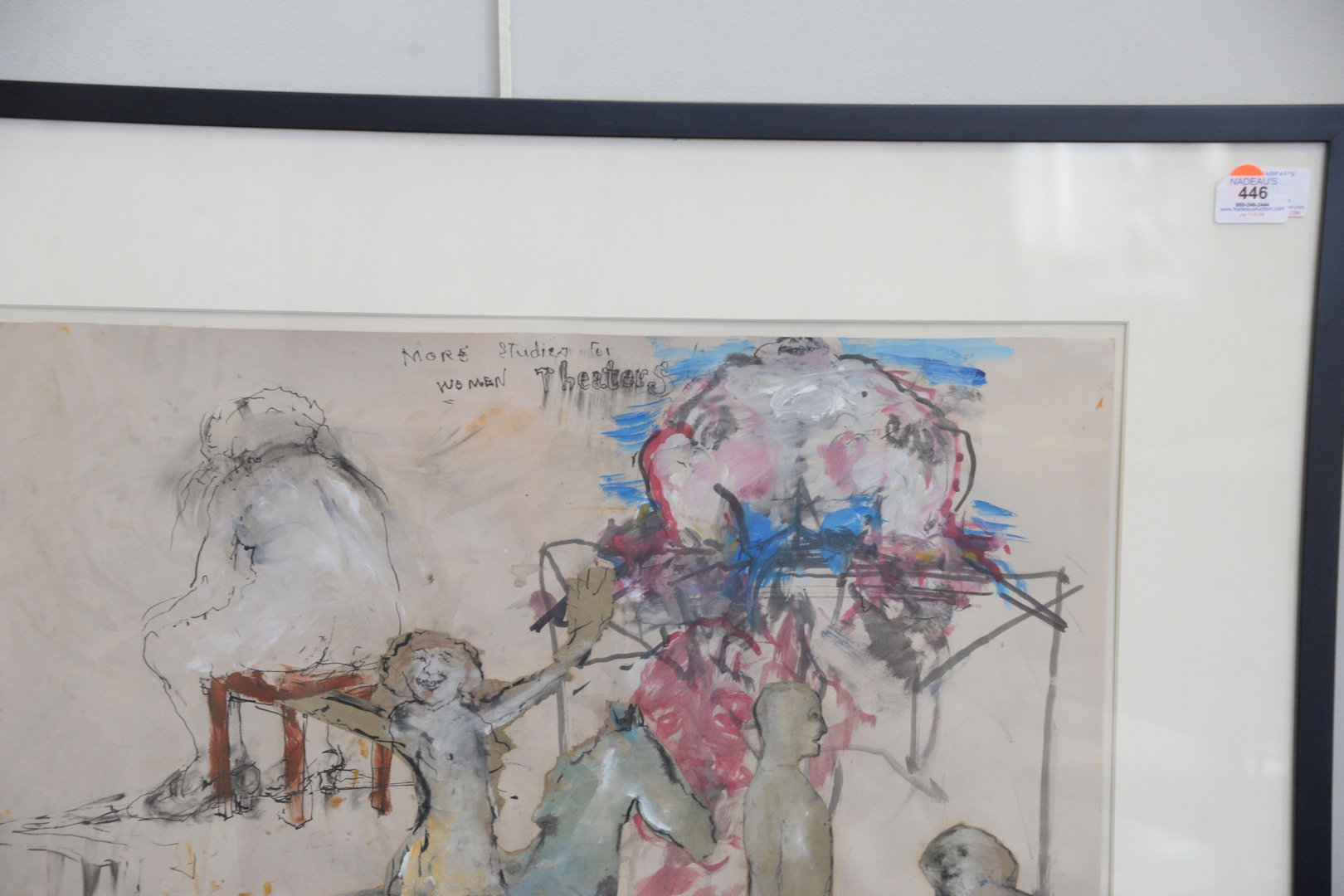 Lot 446: June Leaf (American/Canadian, b. 1929), More Studies for Women Theaters, 1969, watercolor with collage on paper, signed lower right “June Leaf”, 19 3/4″ x 25 1/2″, Galerie le Chat Bernard and Virginia Lust Gallery labels verso.