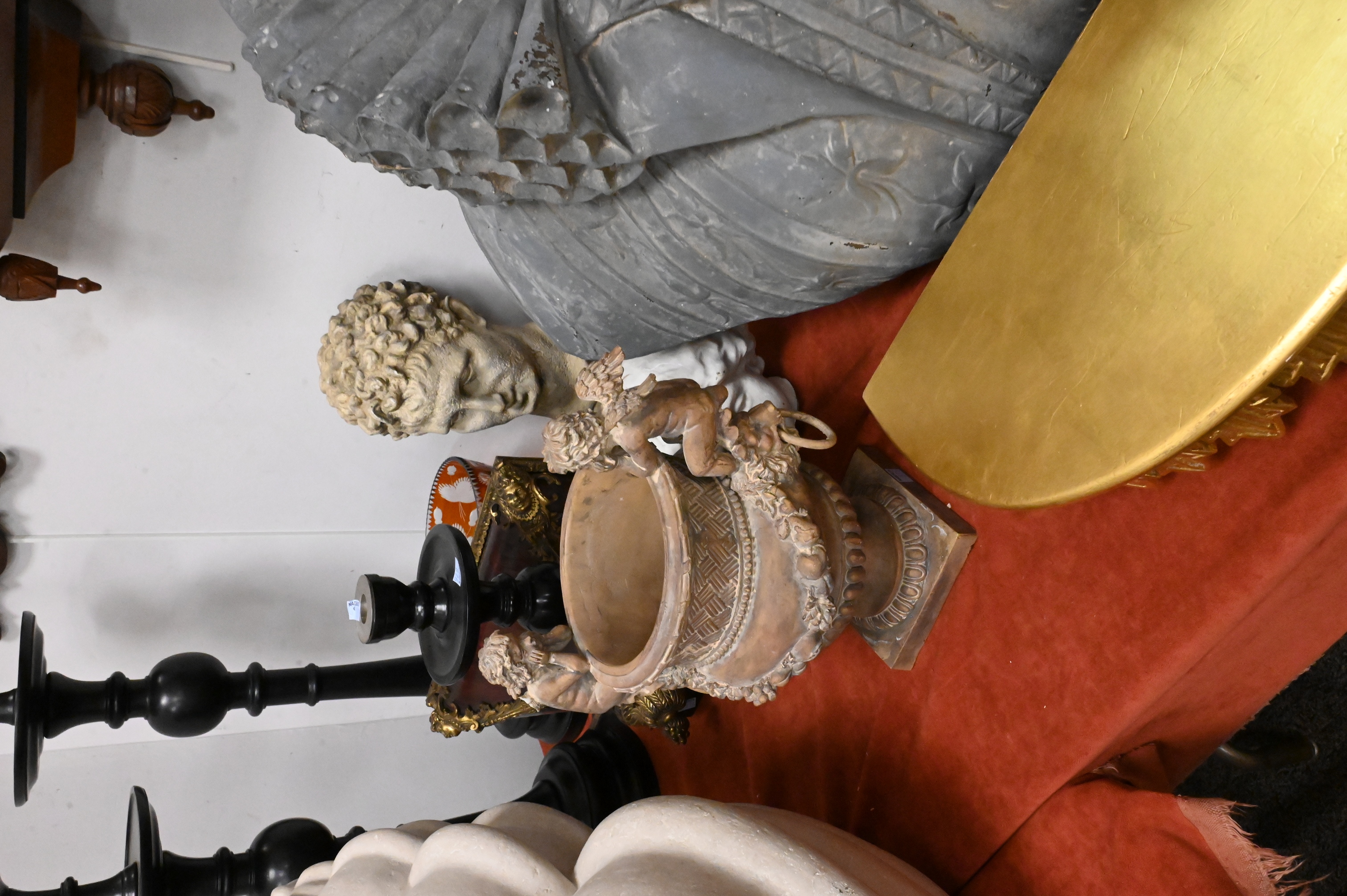 large shell sculpture, large fiberglass bust of a queen, two smaller classical style busts, two carved and gilt wall mounts, putti urn, three ebonized candlesticks