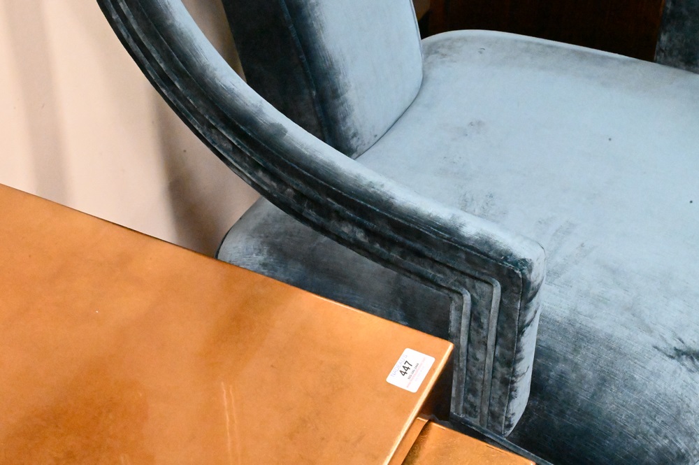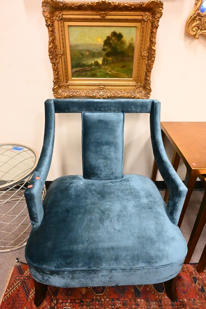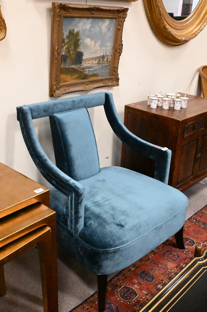 Pair of Velvet Upholstered Armchairs, height 34 inches, width 29 1/2 inches.