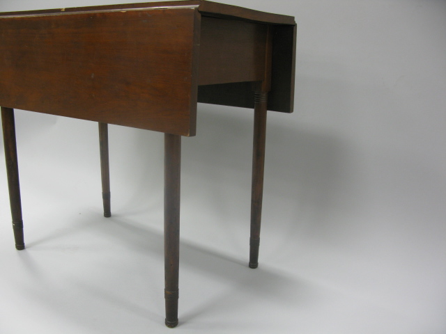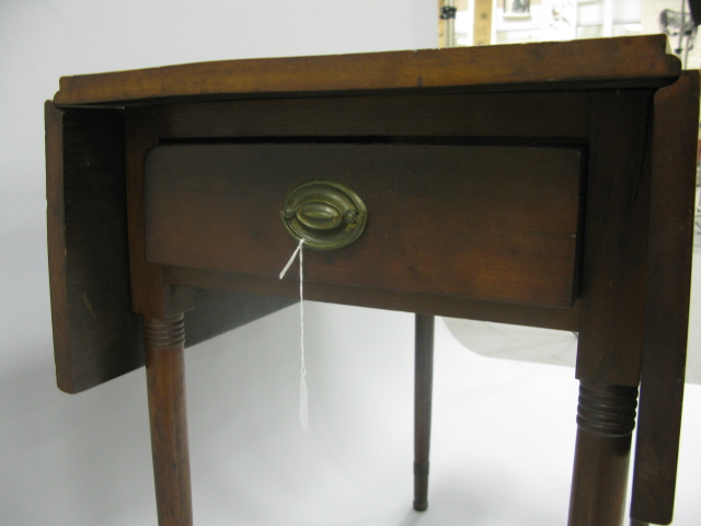 Sheraton drop leaf, cherry Pembroke table with drawer on simple turned legs, opens to 37in.