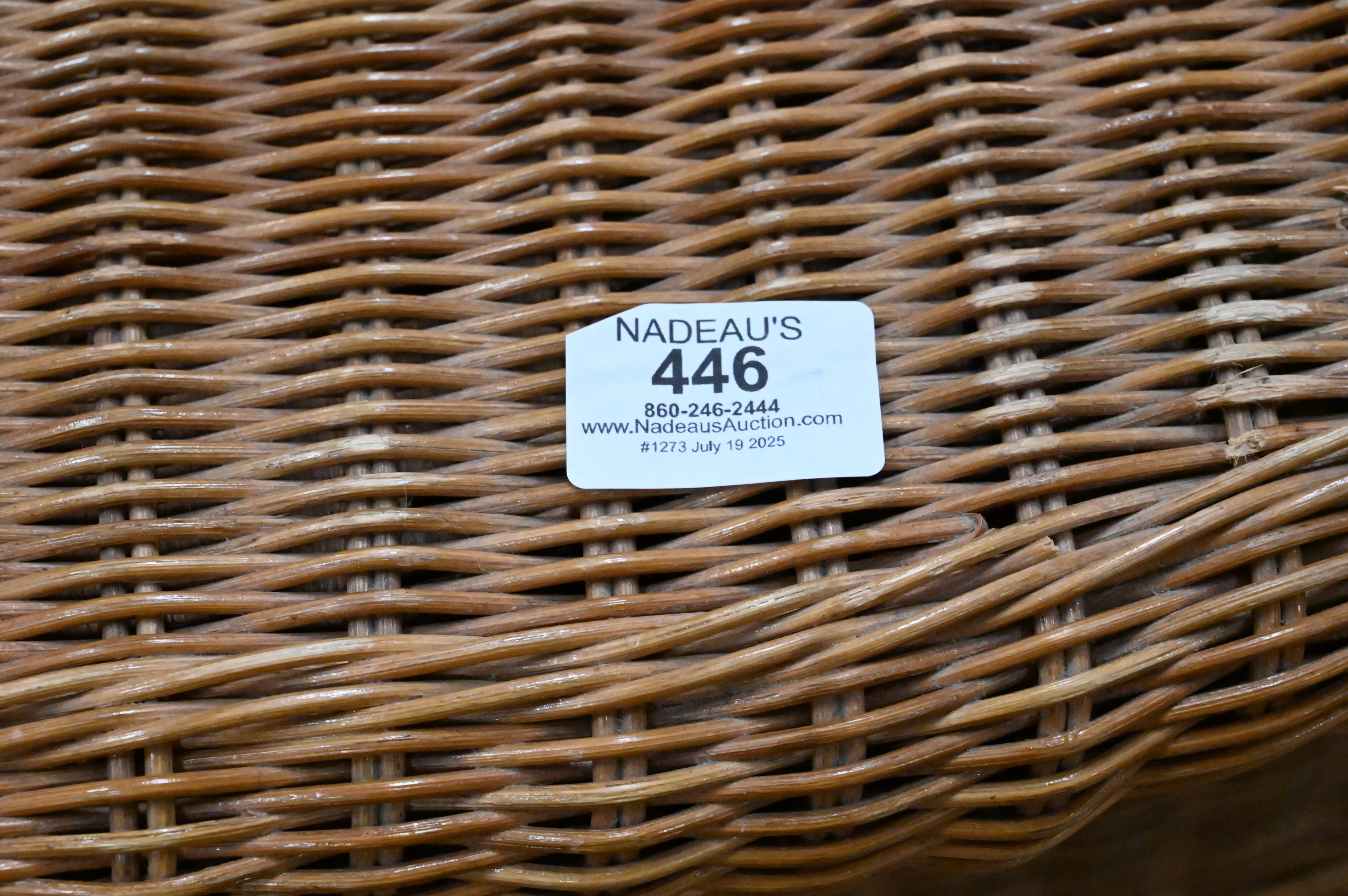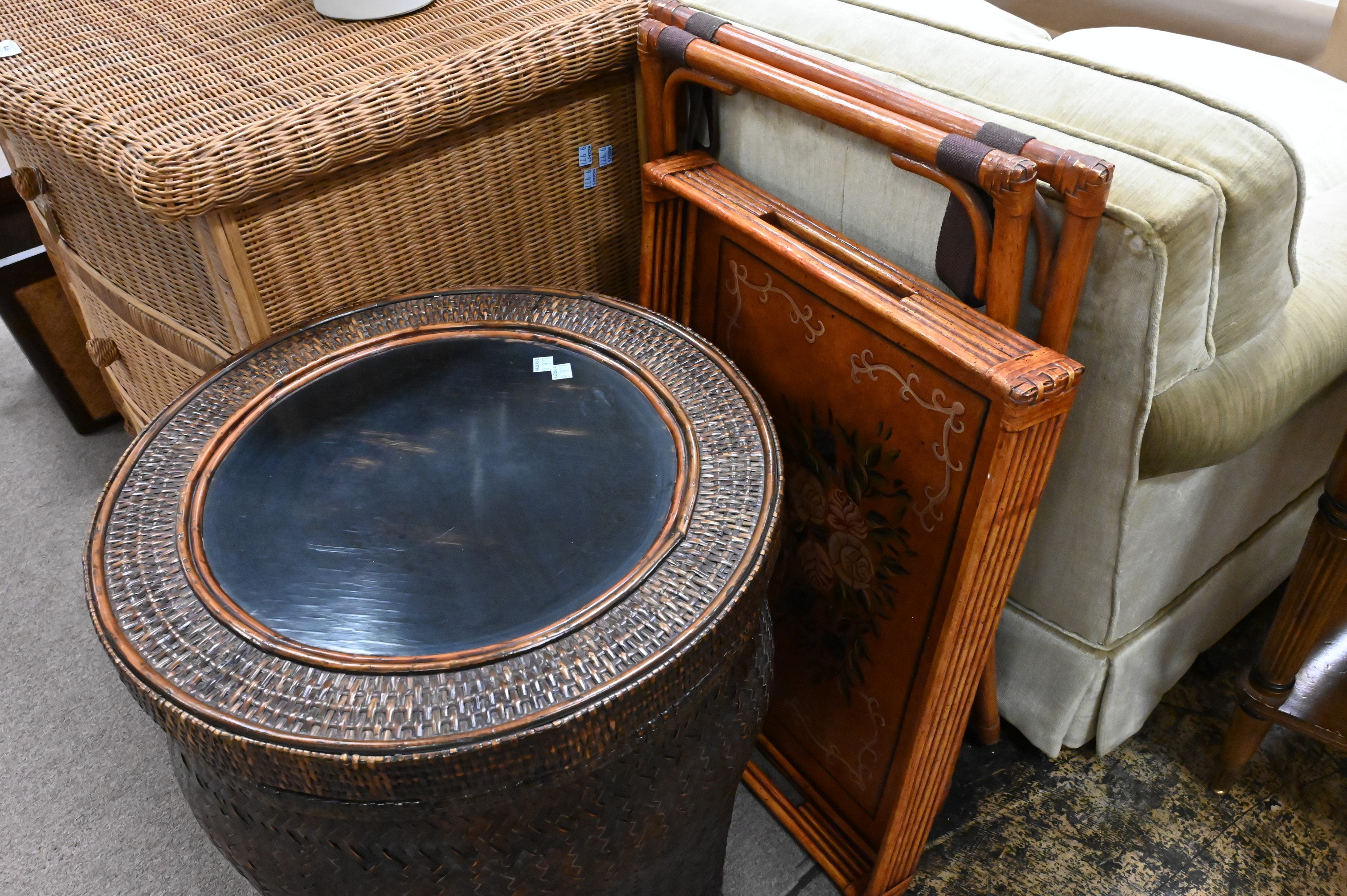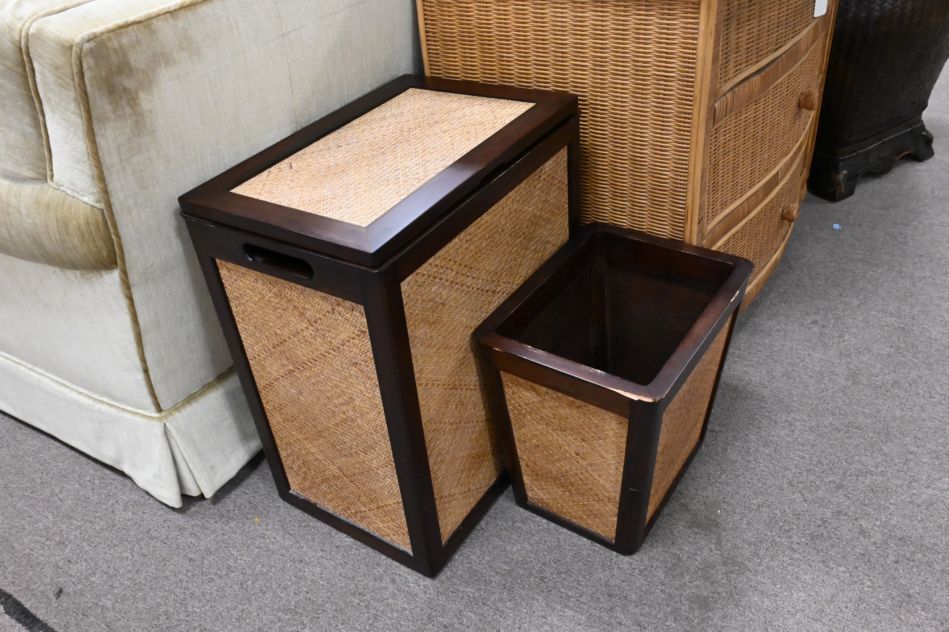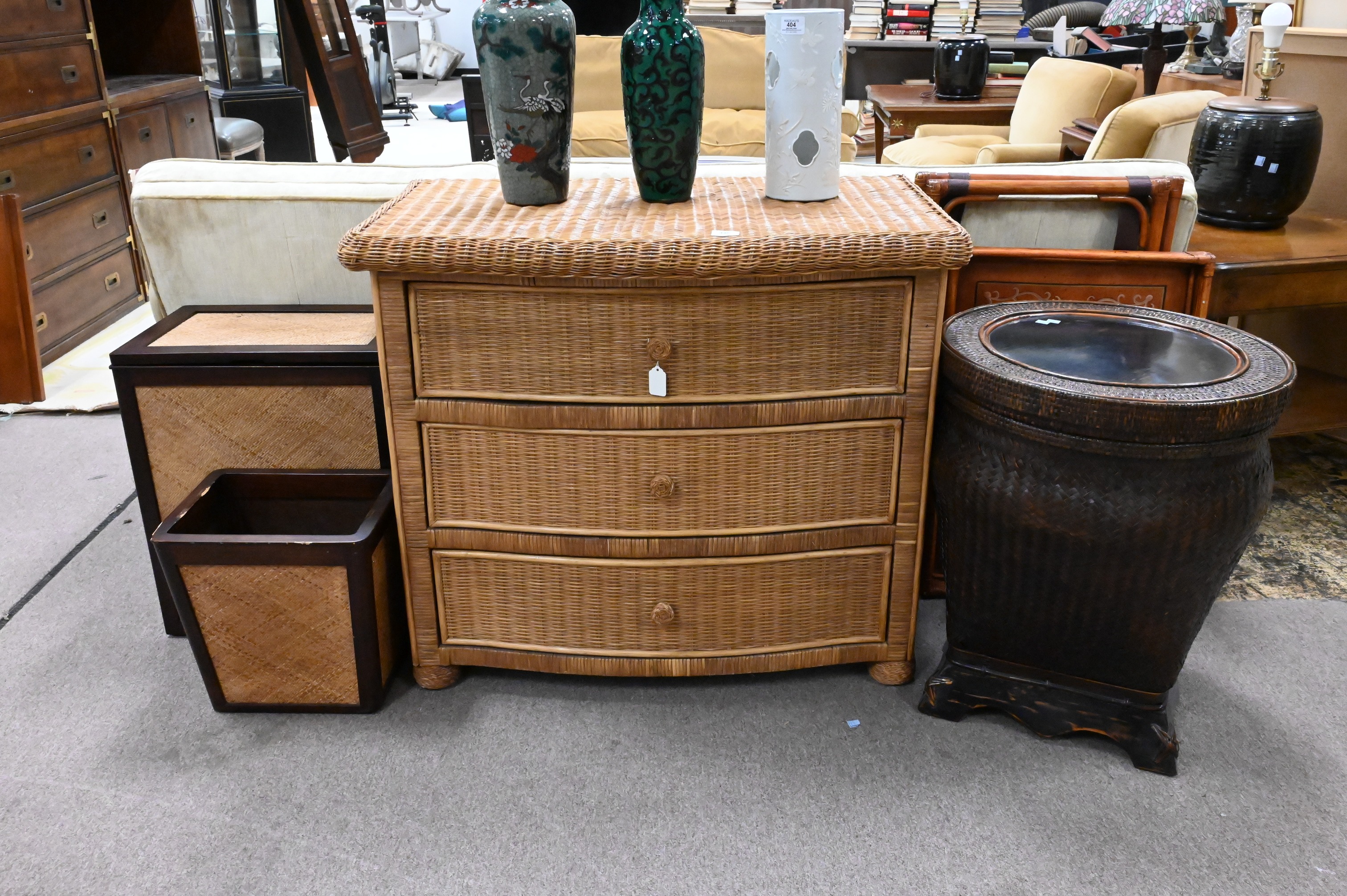 to include a wicker chest, round container, hamper and trash can, and a tray on stand