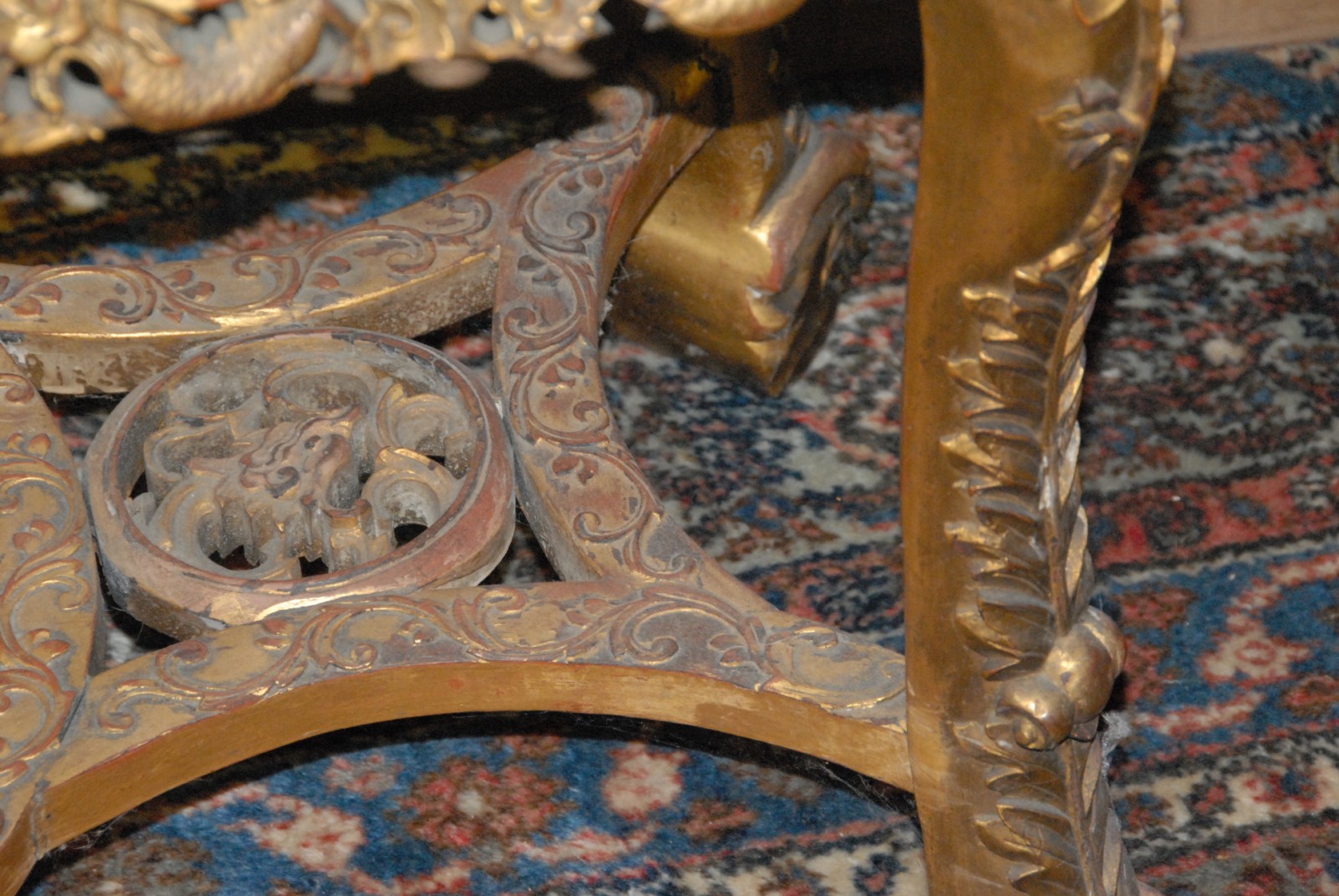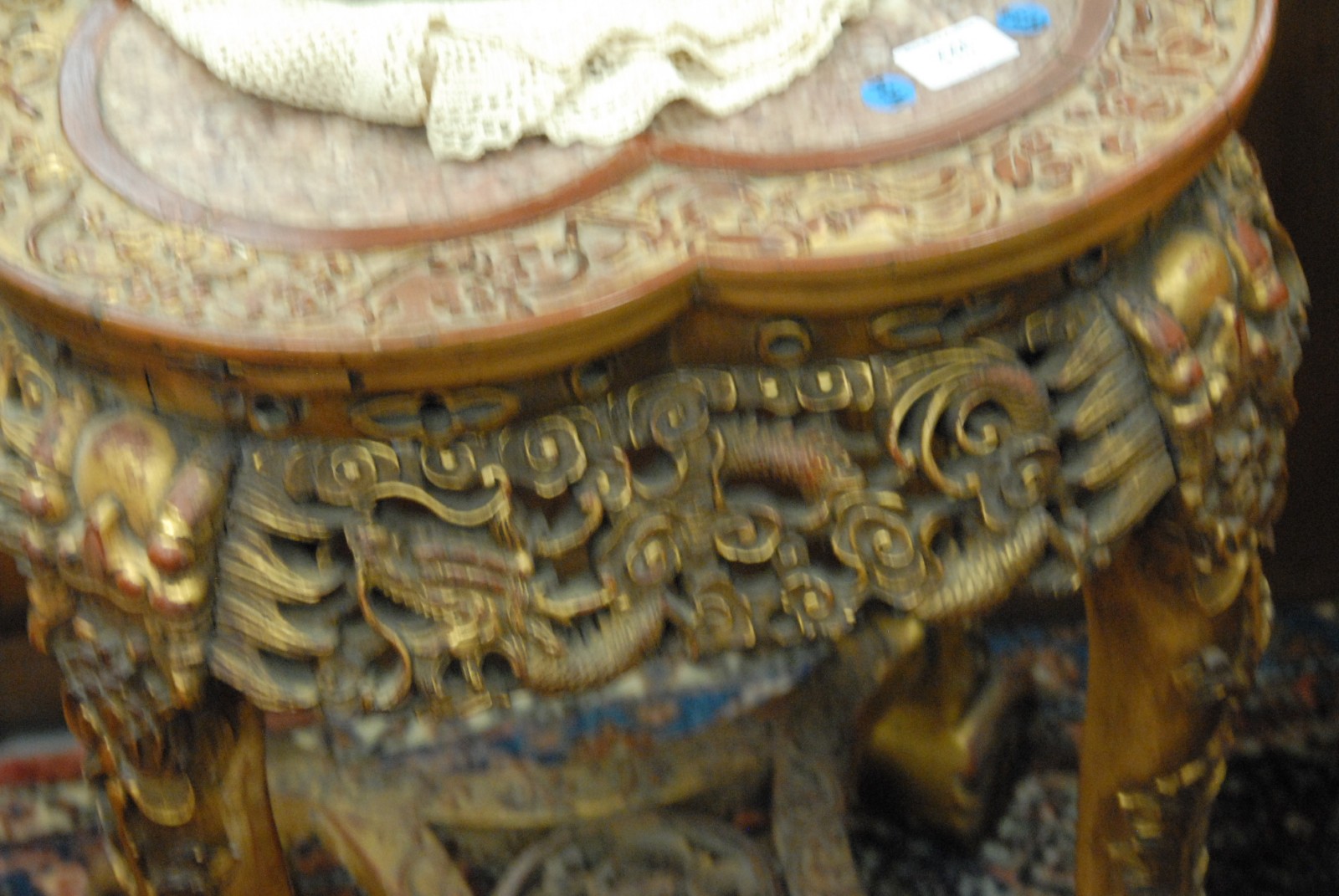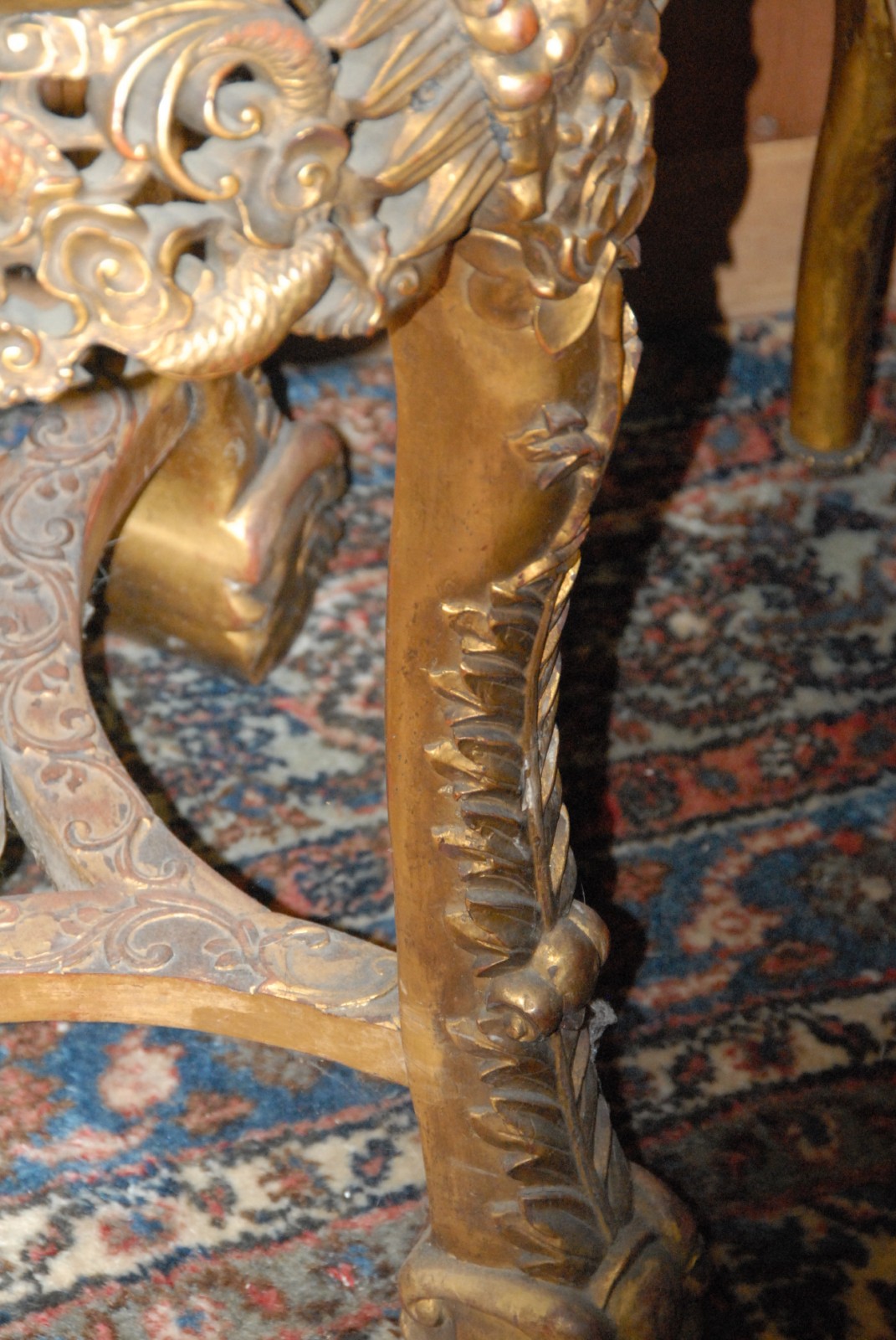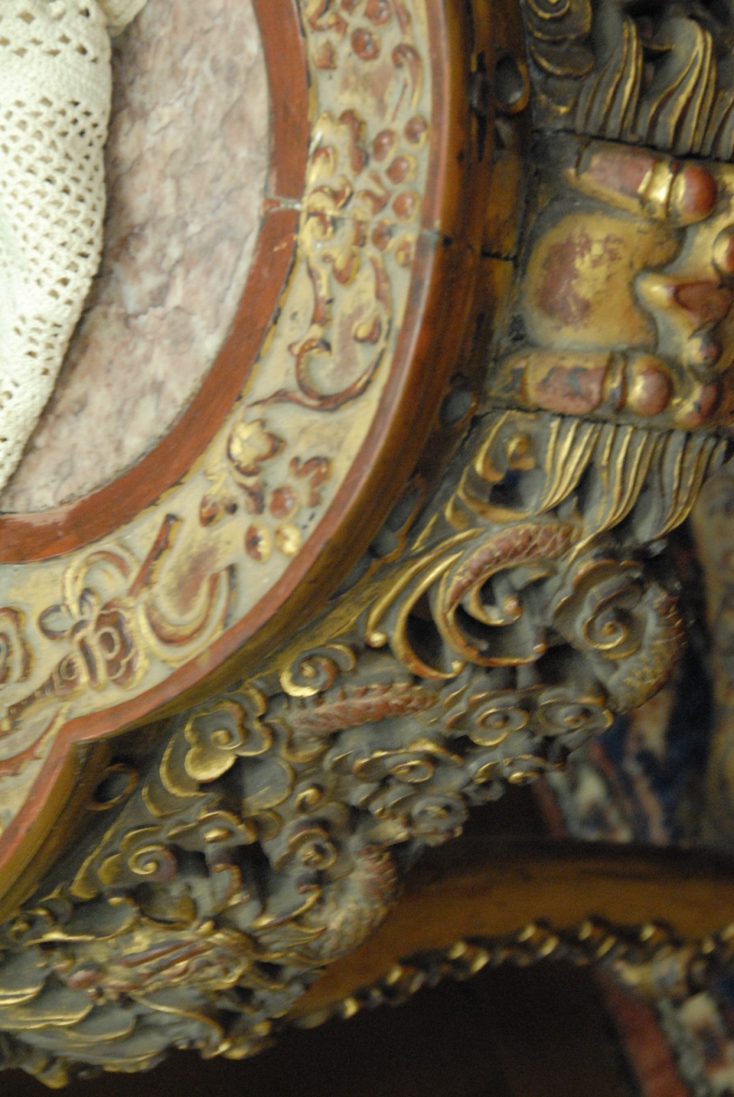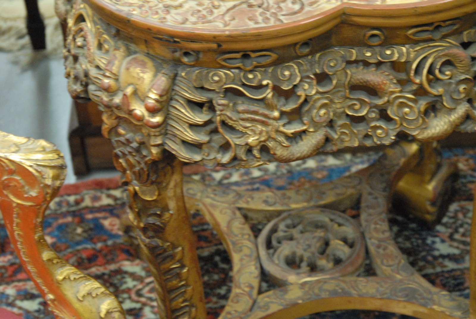 Teakwood carved Oriental table with rouge marble insert with all over gilt decorated.