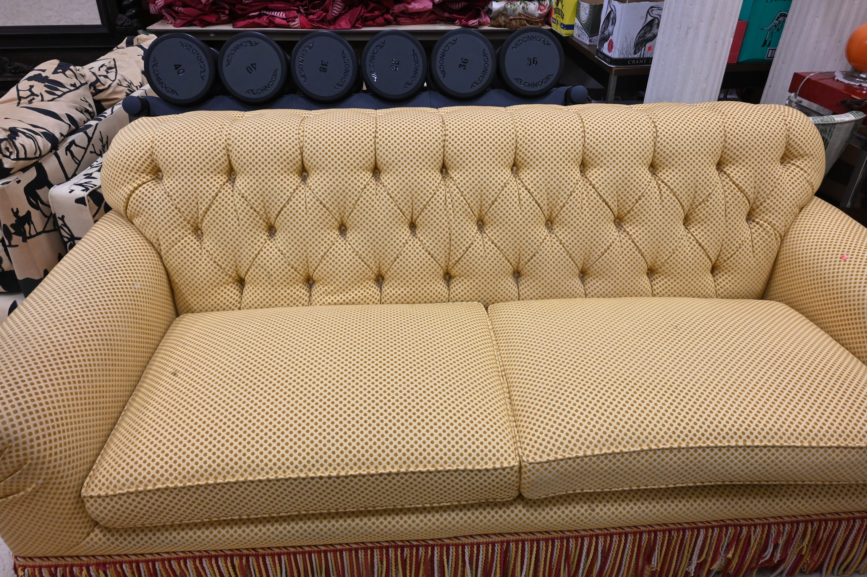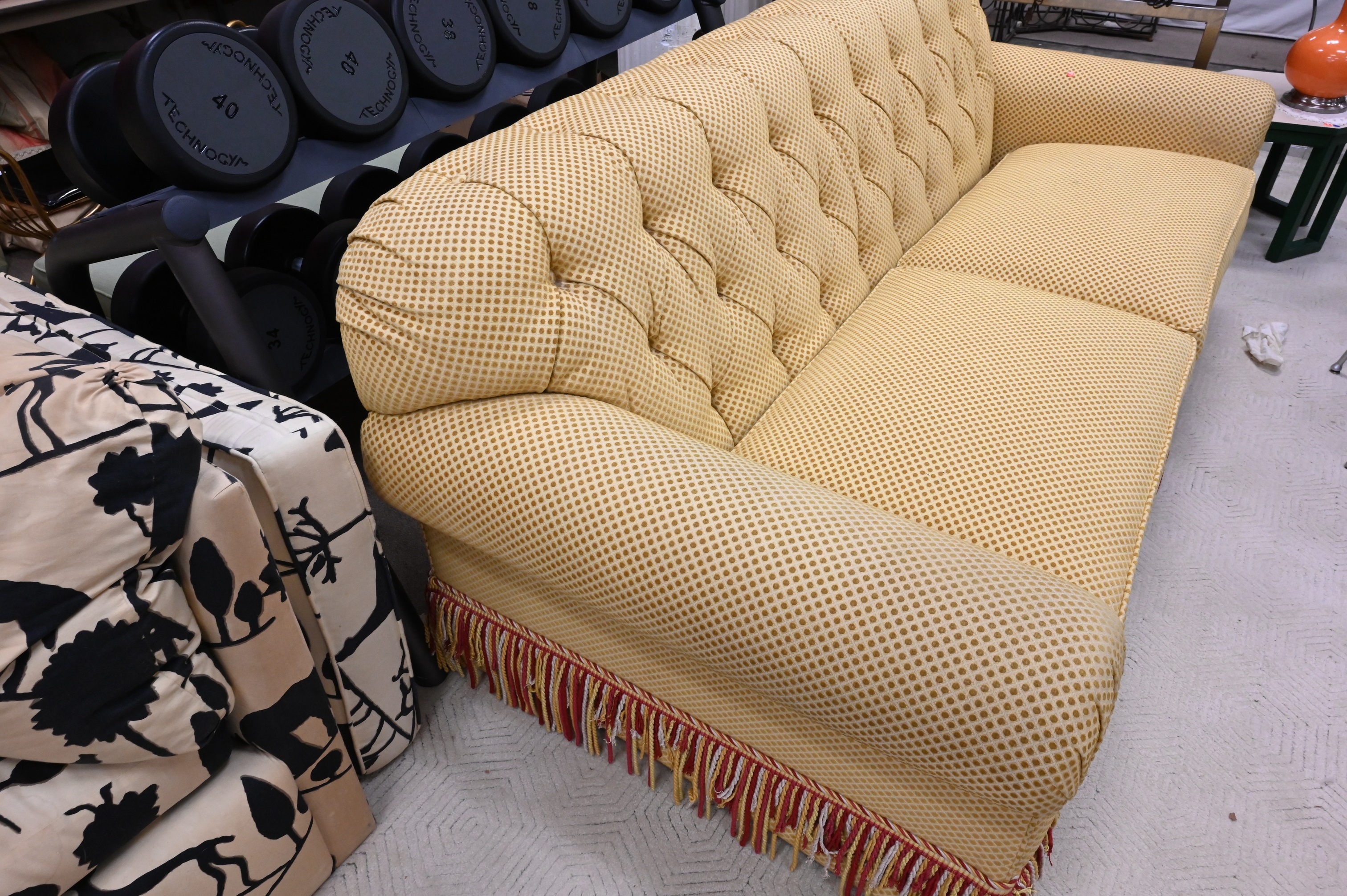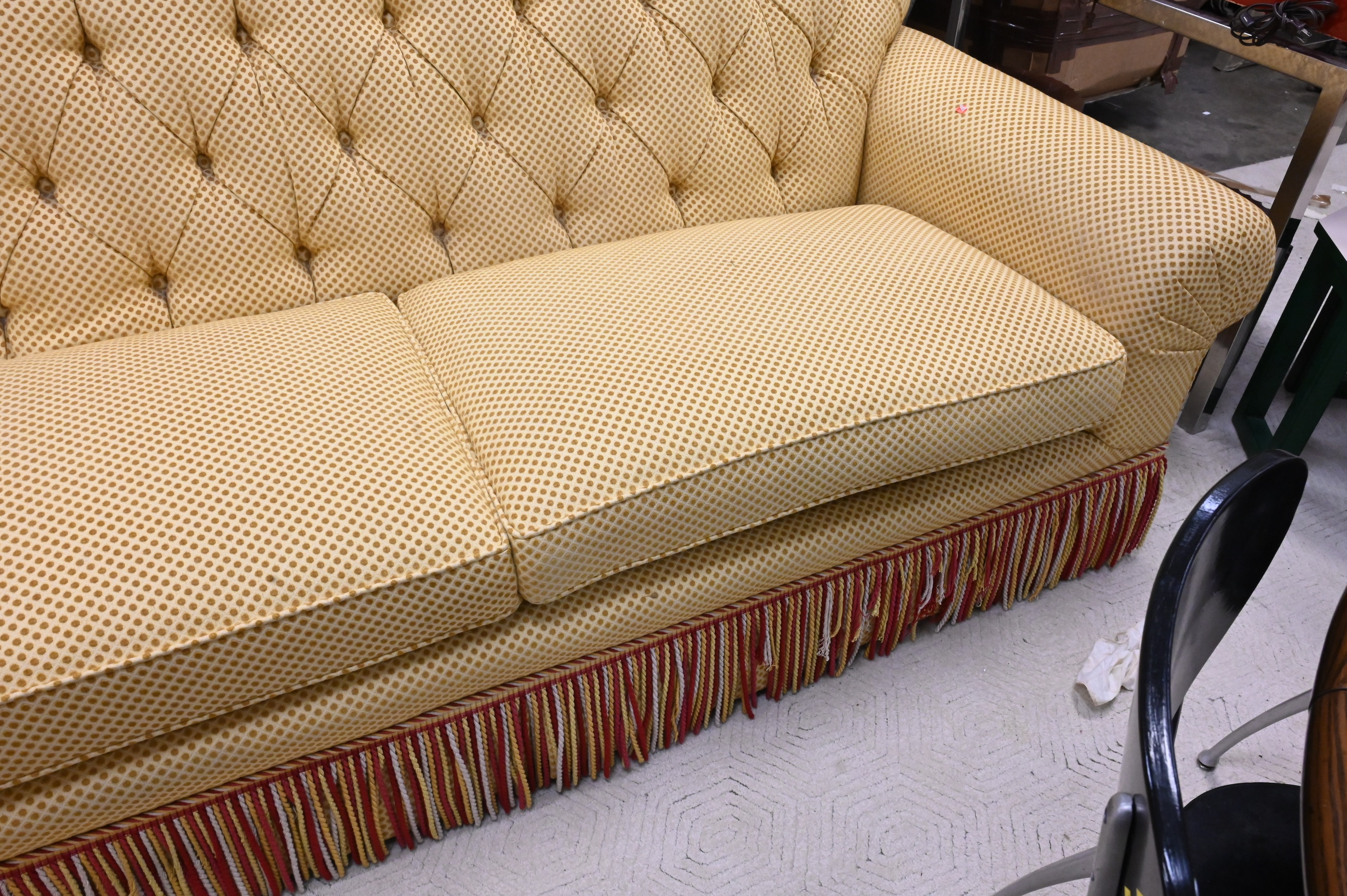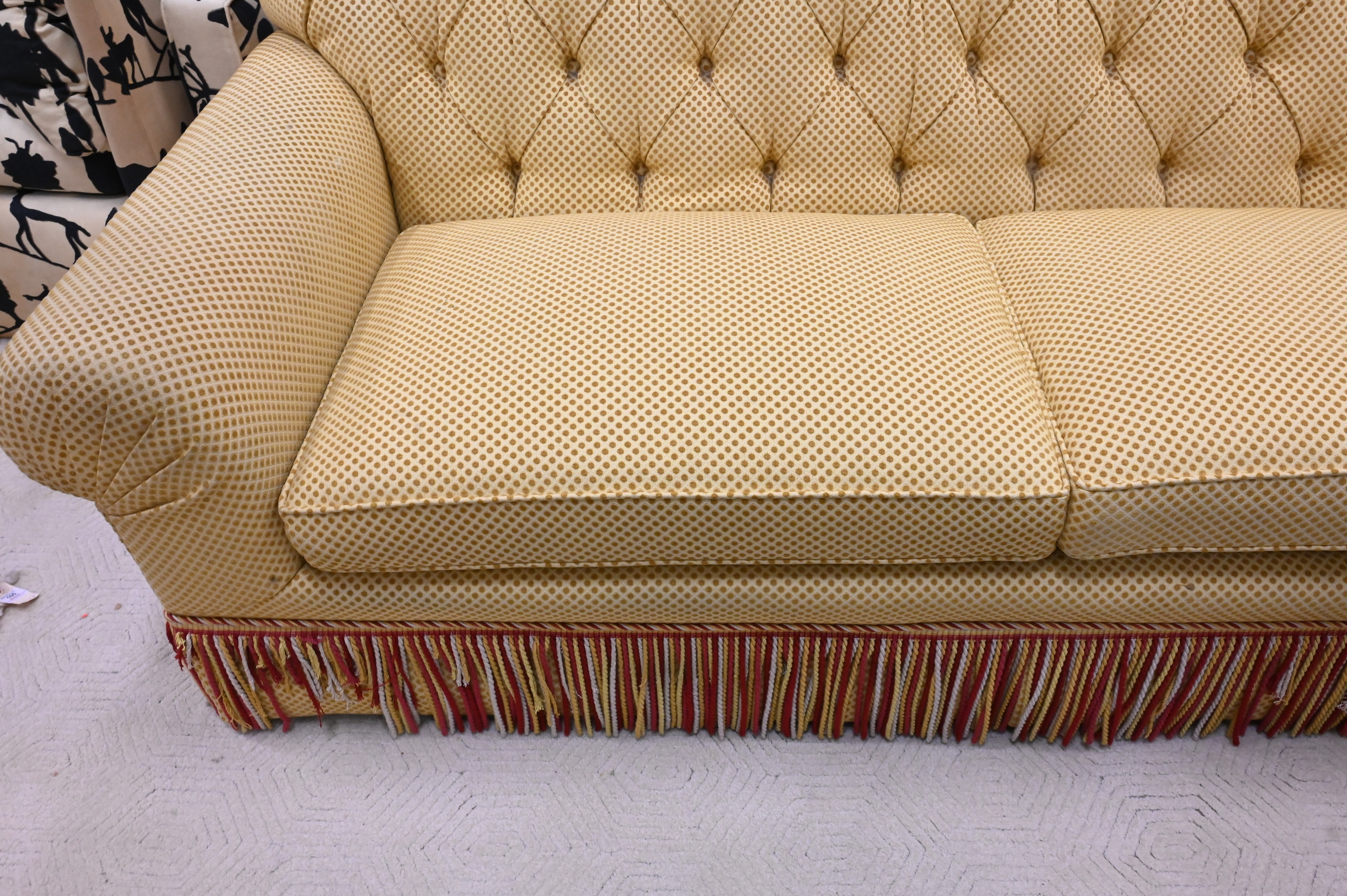 TRS Custom Upholstered Sofa, having tufted back, slight soiling on one arm end, tassel is tattered, length 88 inches.
