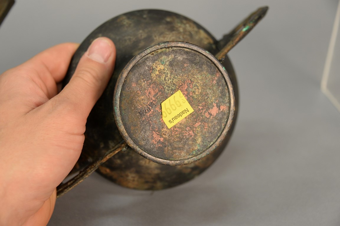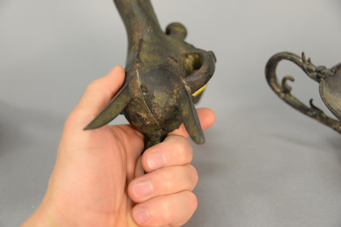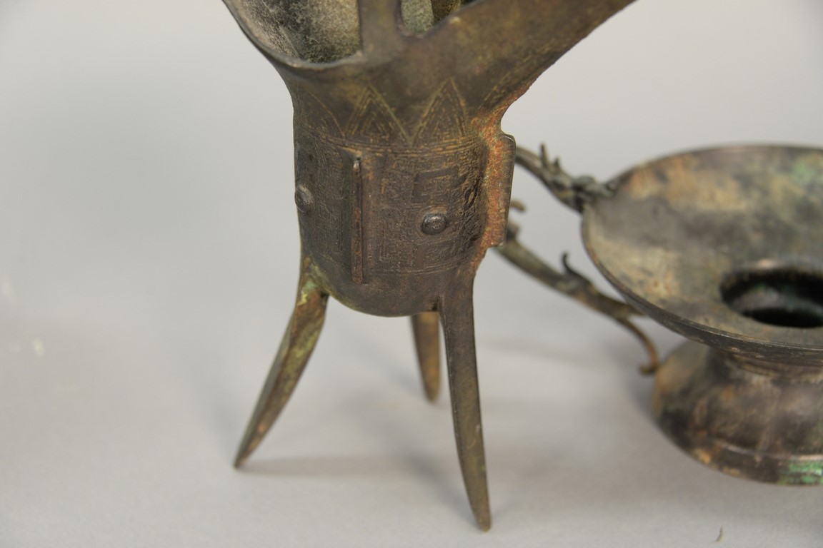 Lot 446: Two Archaic bronze vessels including a wine vessel with three sabre style legs and an elongated spout ht. 7 1/2in. and the other w…