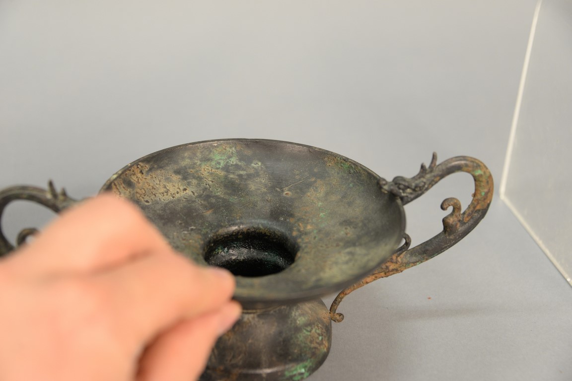 Two Archaic bronze vessels including a wine vessel with three sabre style legs and an elongated spout ht. 7 1/2in. and the other with dragon handles and a wide rim ht. 3 1/2in..