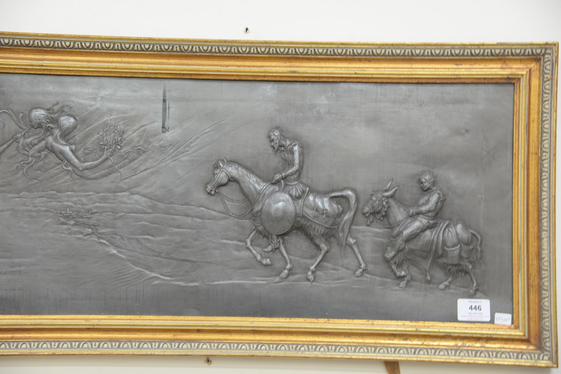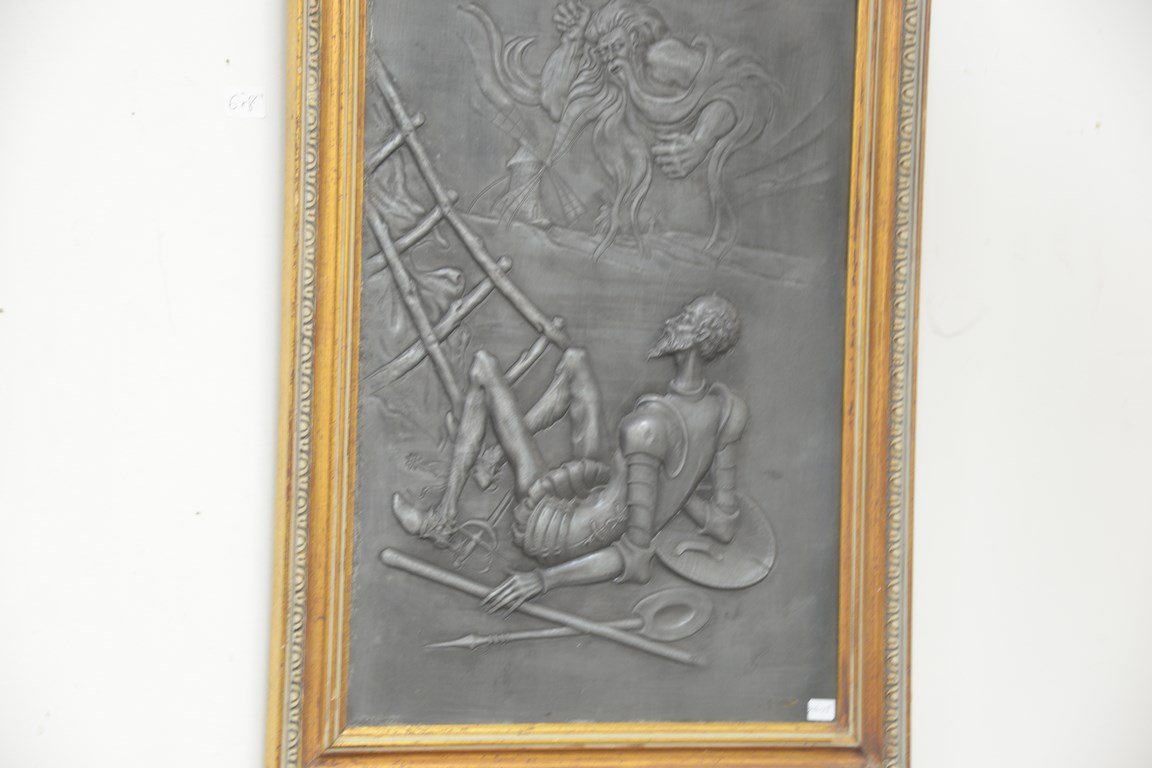 Two embossed pewter plaques Don Quixote, 12 x 26 and 20 x 13.