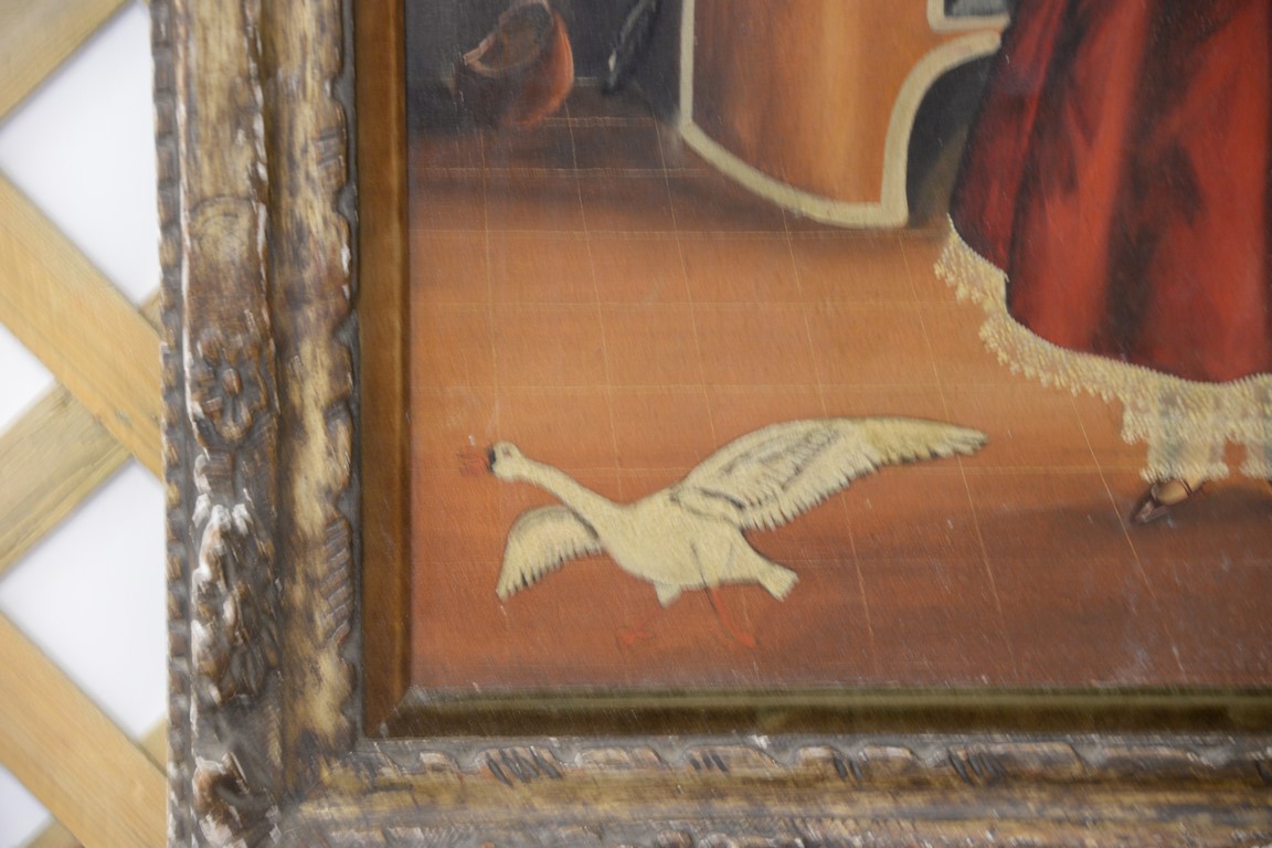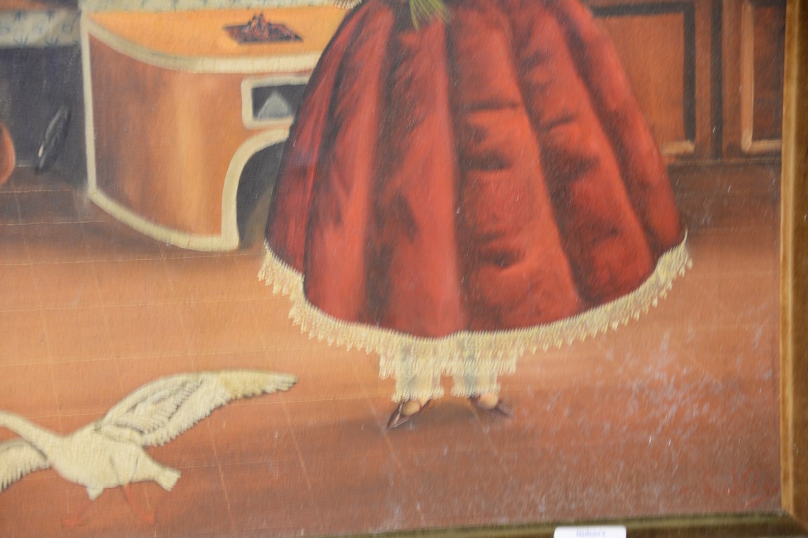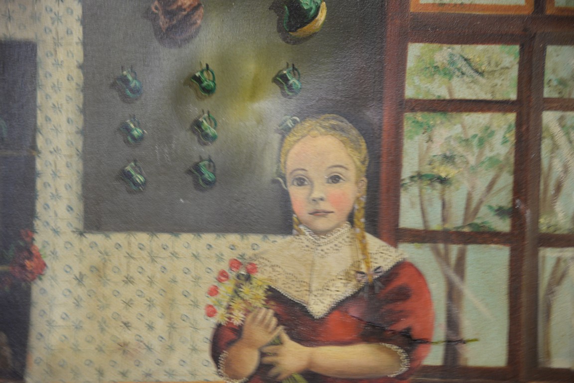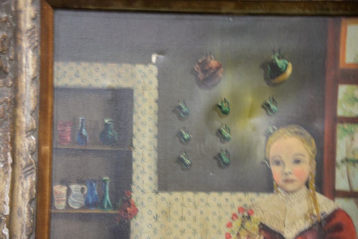 Lot 446B: Agapito Labios 1898-1996 oil on canvas folk art interior girl holding flowers, signed lower right A. Labios, 23 1/2 x 18 1/2