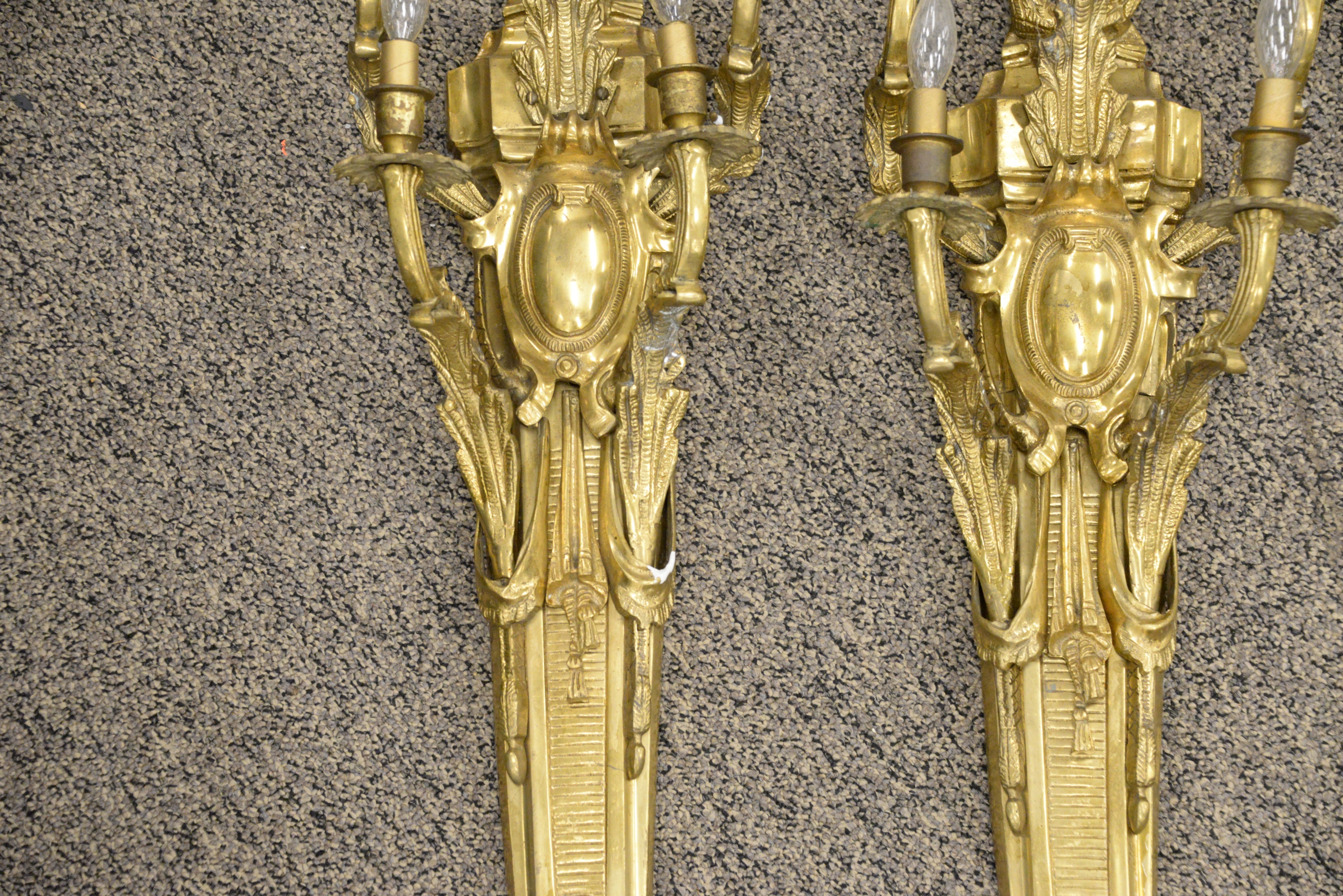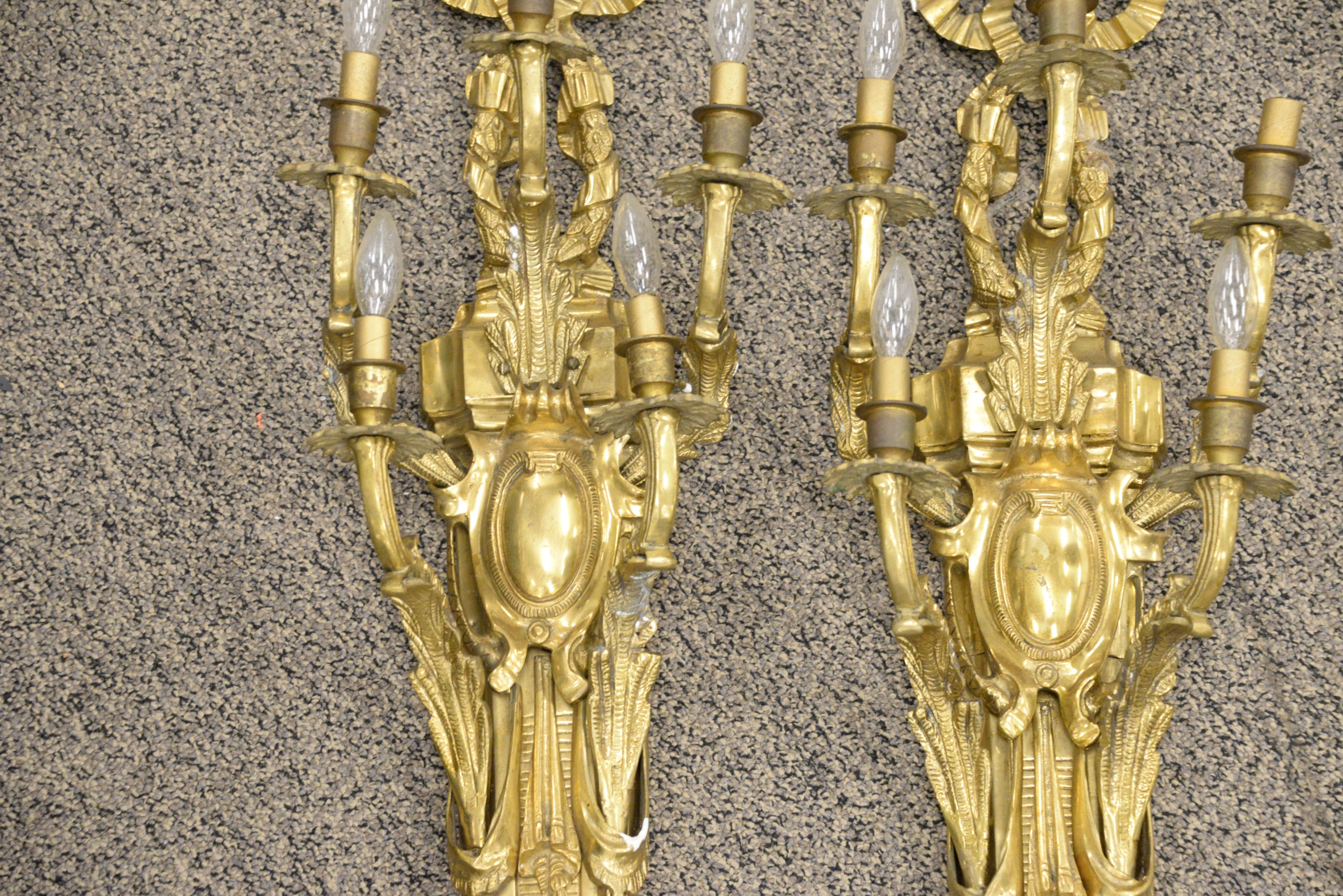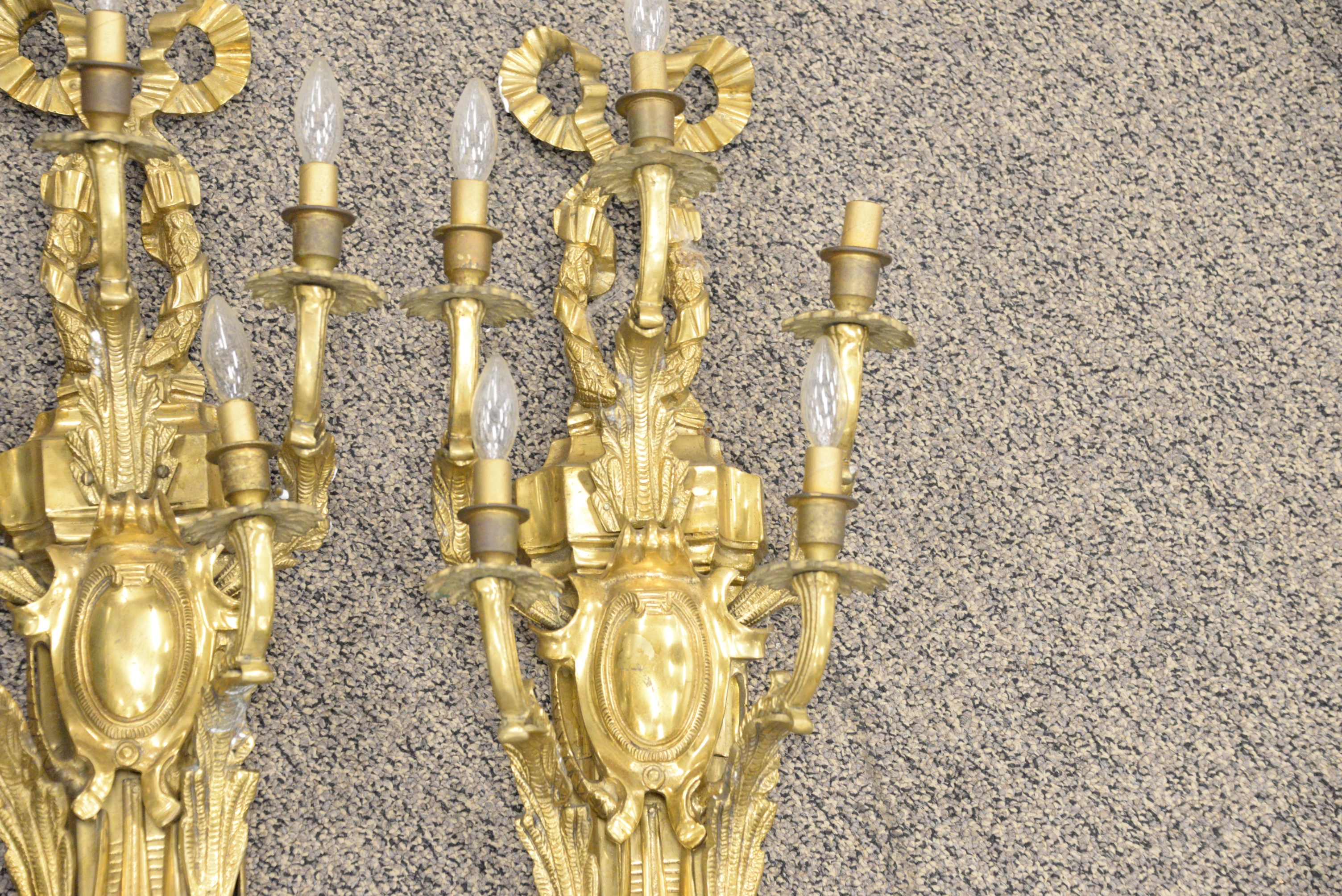 A Pair of Bronze Sconces, having five lights each with ribbons atop of standard, electric, height 39 inches. Provenance: A Private Connecticut Shoreline Collection