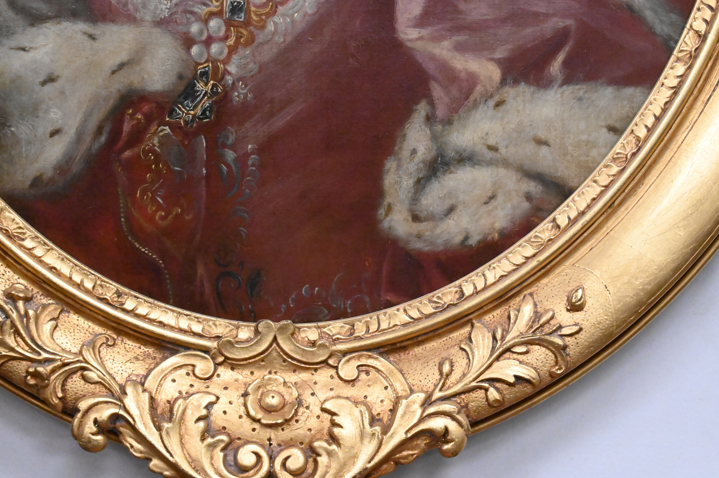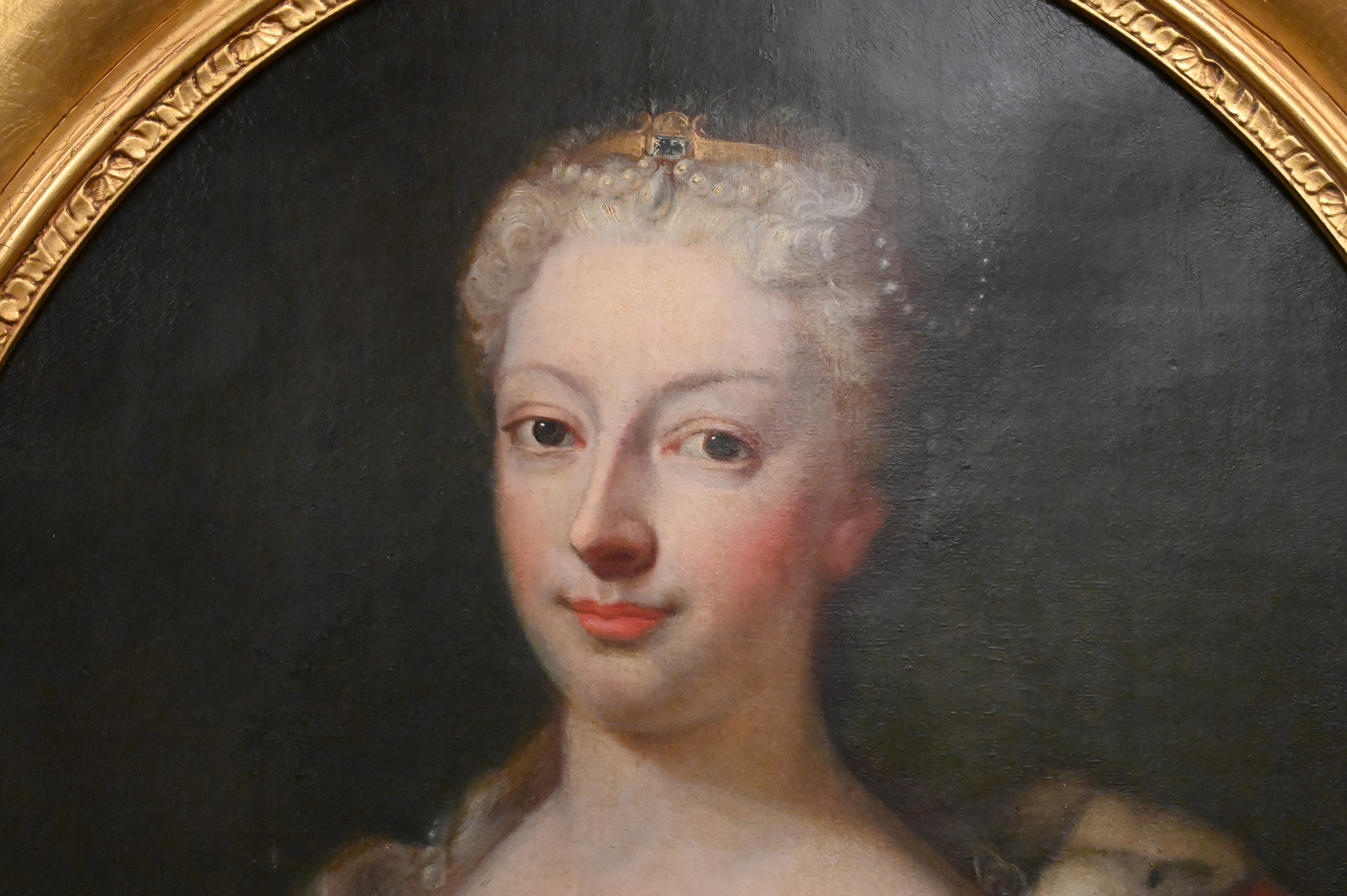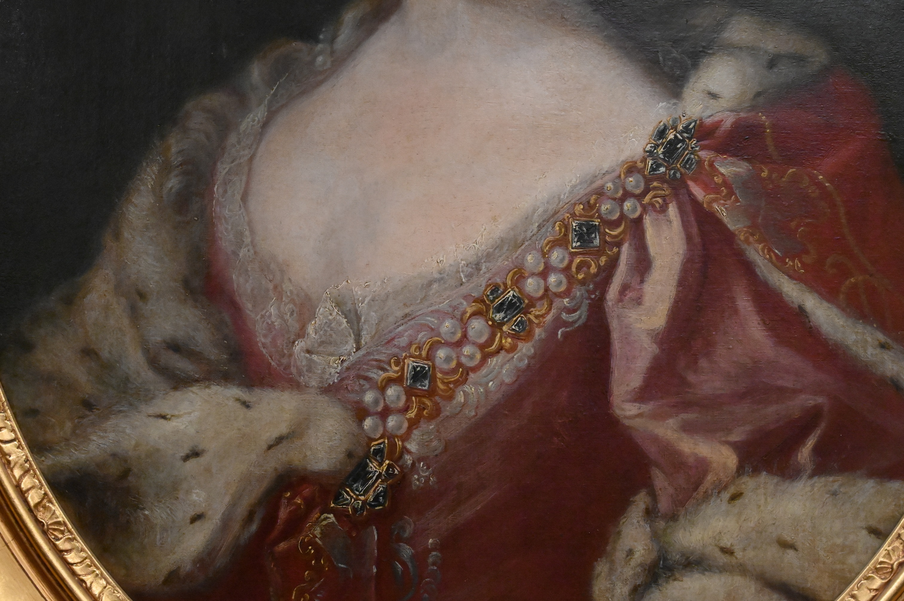 Portrait of a Noblewoman in a pink bejeweled fur cape and pearl crown