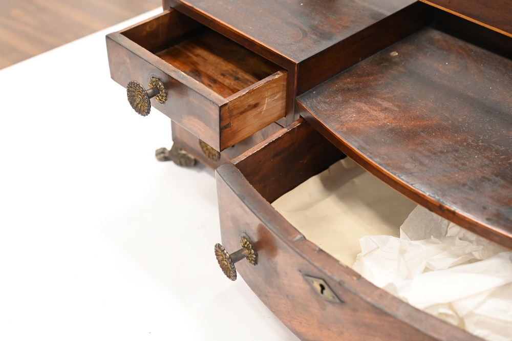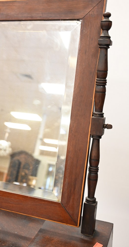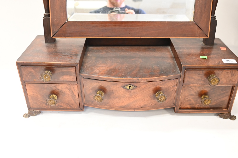 Lot 447: Federal Mahogany Inlaid Dresser Mirror, rectangle mirror over five drawers on claw foot base, height 28 1/2 inches, width 25 1/2 inches, depth 8 1/4 inches.