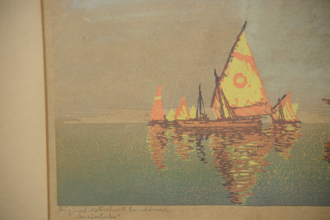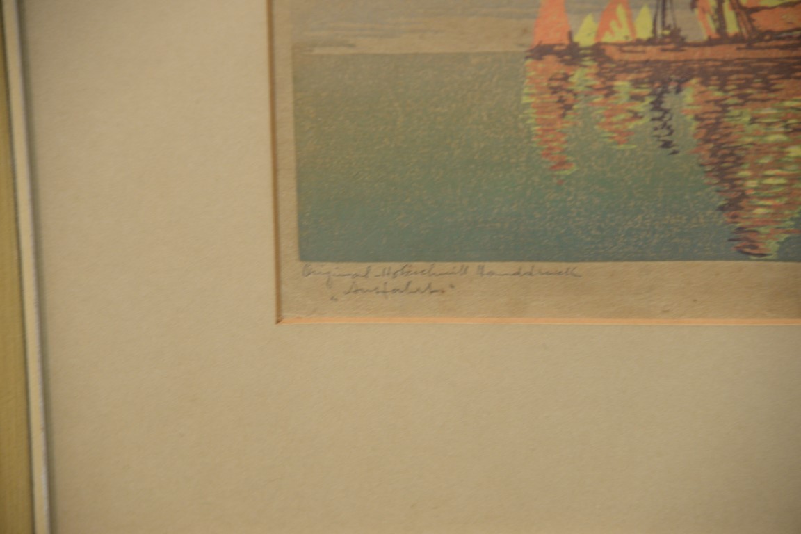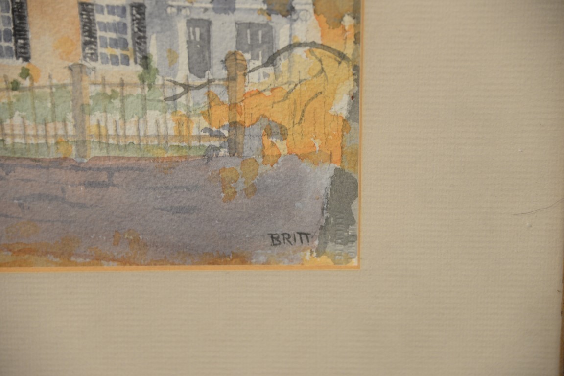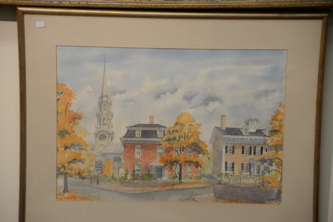 Four framed pieces including Pasquale Pat Masiello 1912-1987, oil on canvas, Seashore watercolor, 19th century Street Scene, unsigned watercolor on paper, Houses, signed Britt and a woodblock print. 9 x 14 to 25 x 36