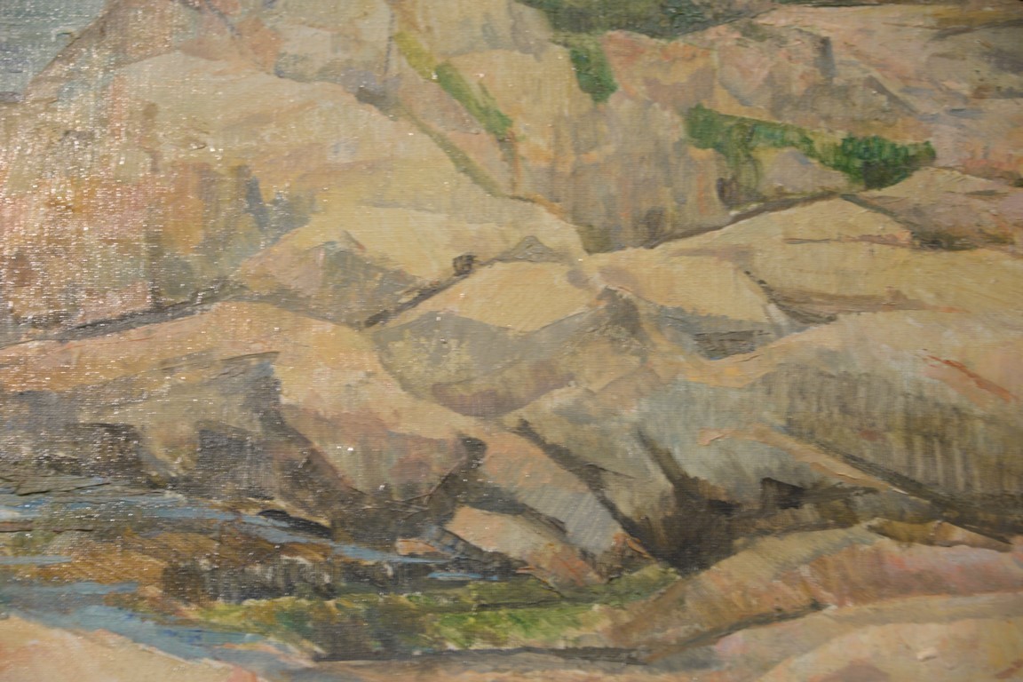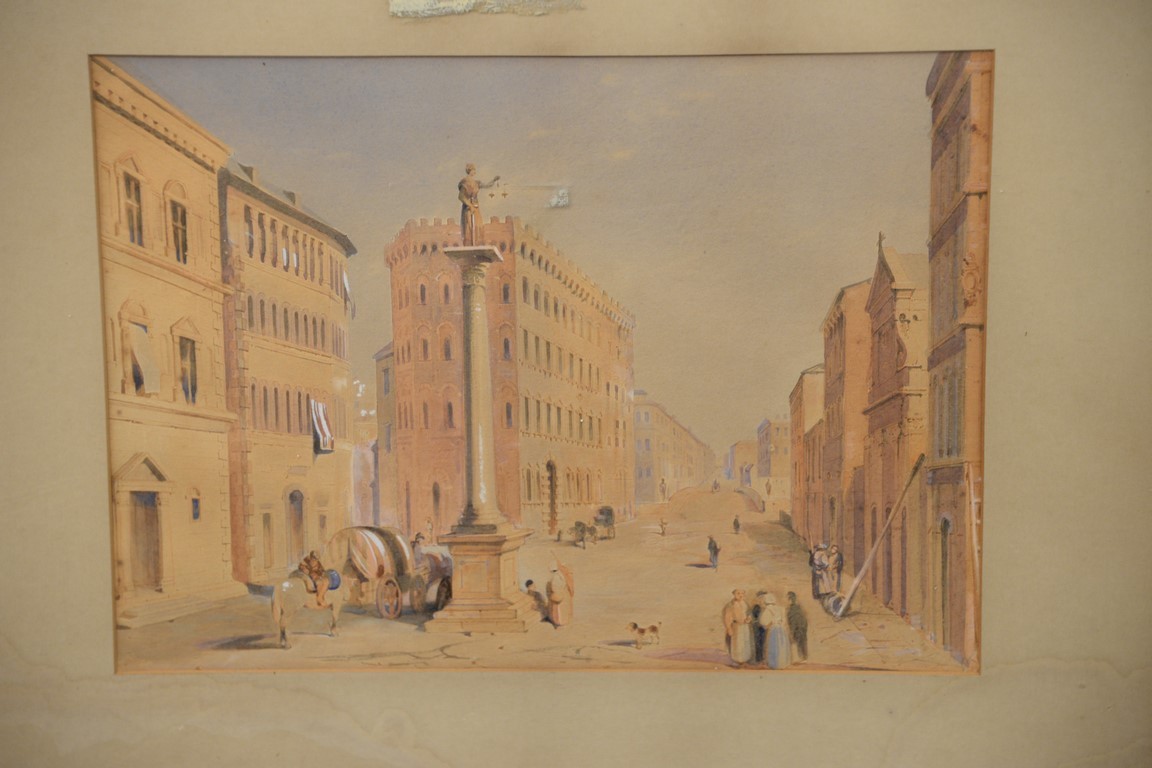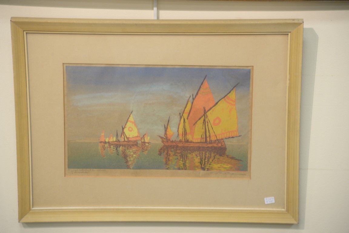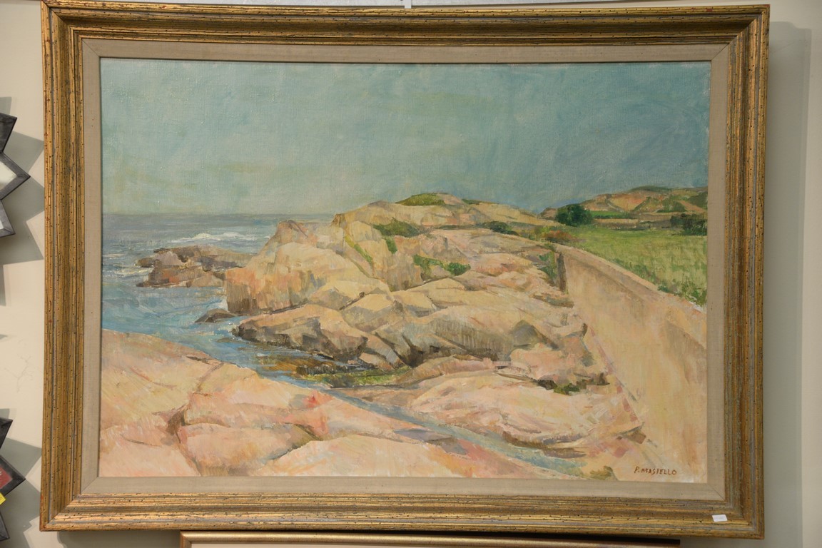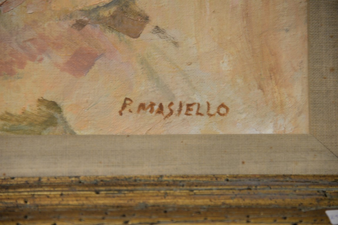 Lot 447: Four framed pieces including Pasquale Pat Masiello 1912-1987, oil on canvas, Seashore watercolor, 19th century Street Scene, un…