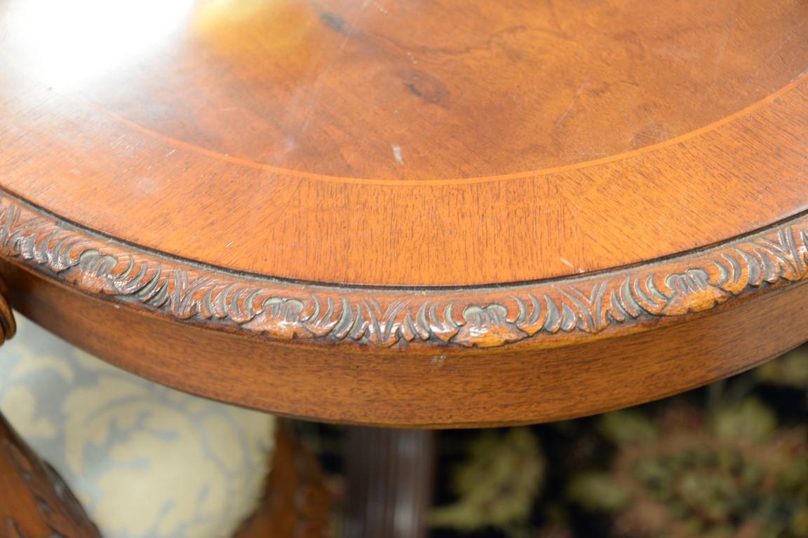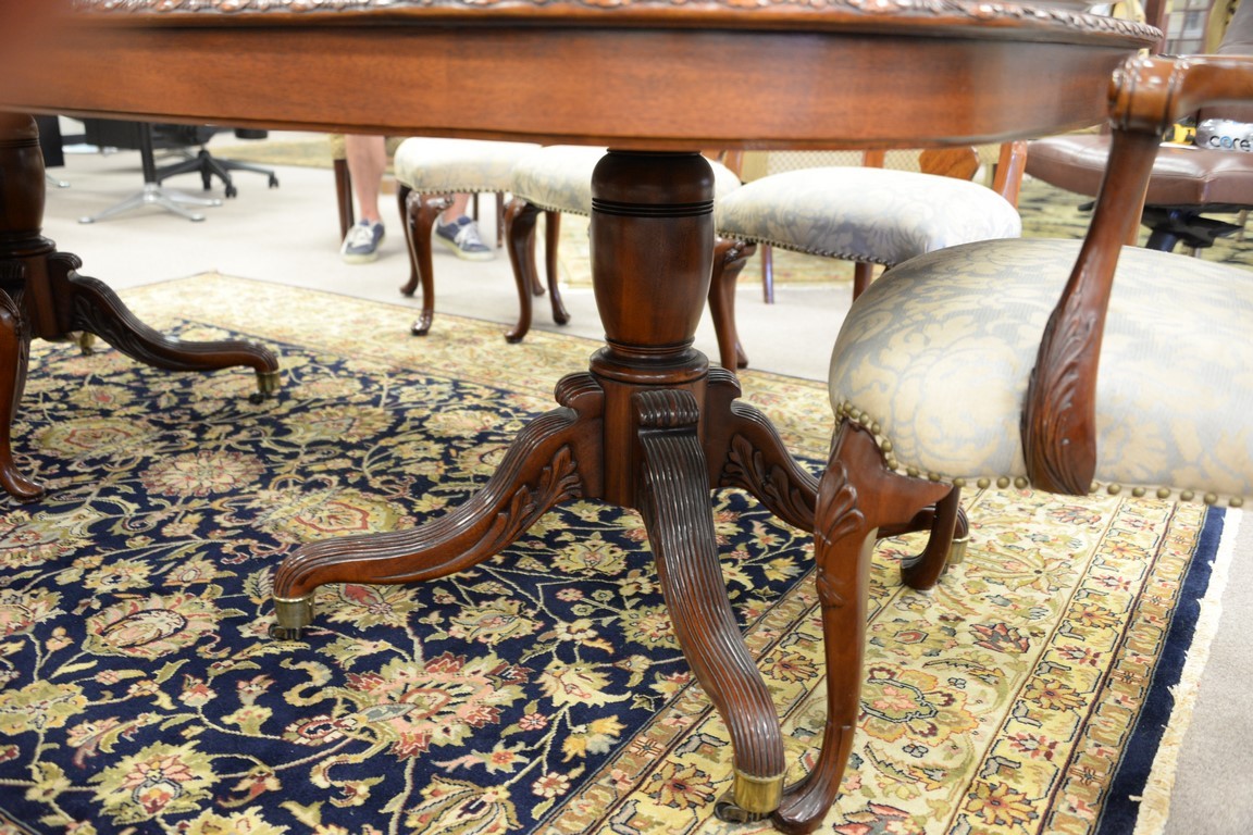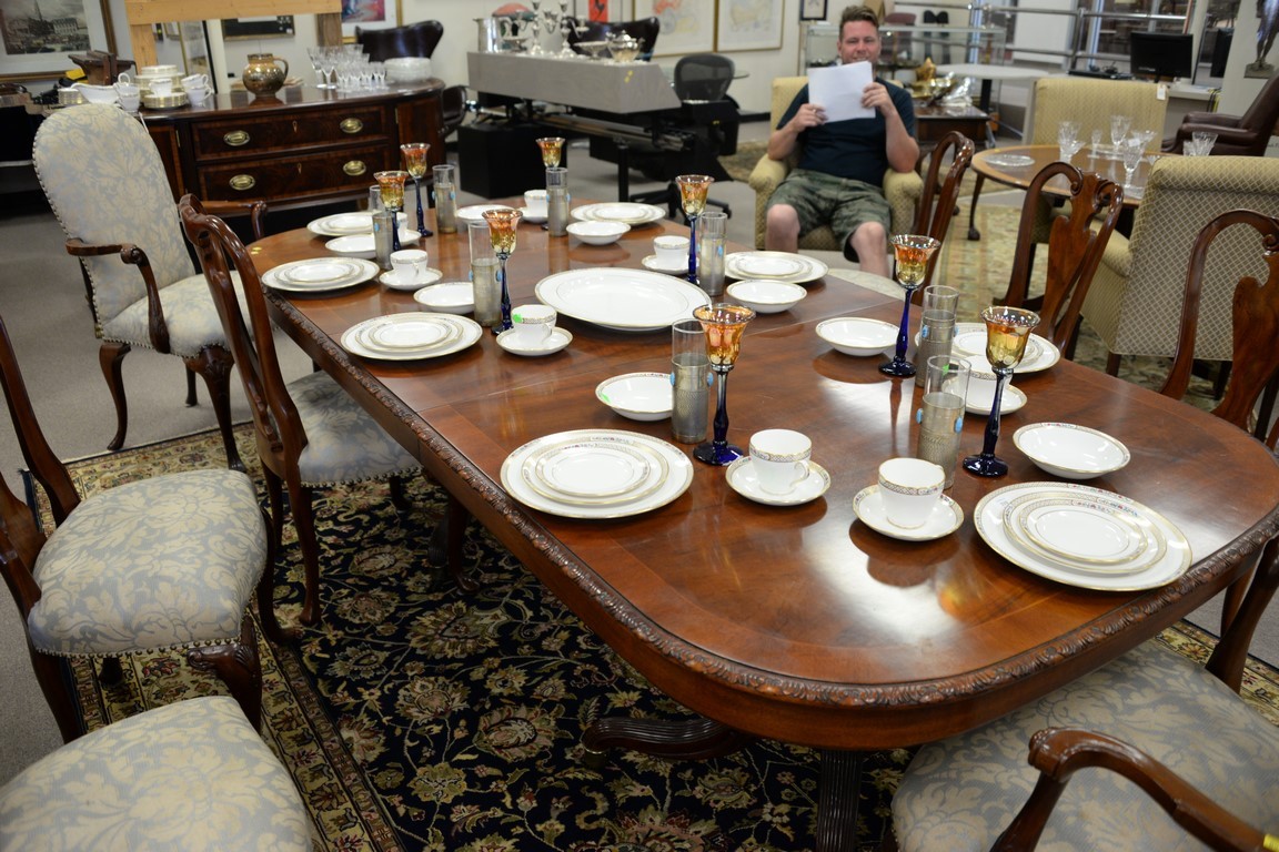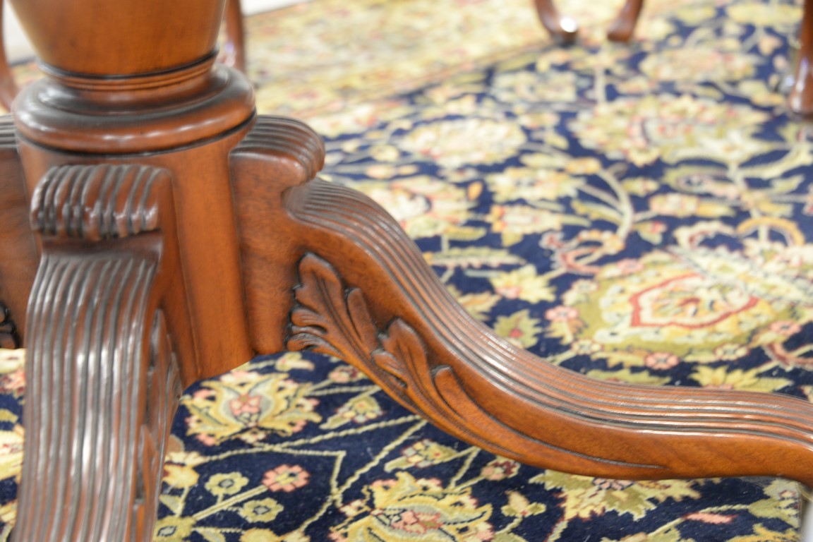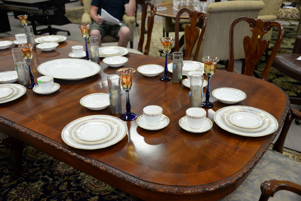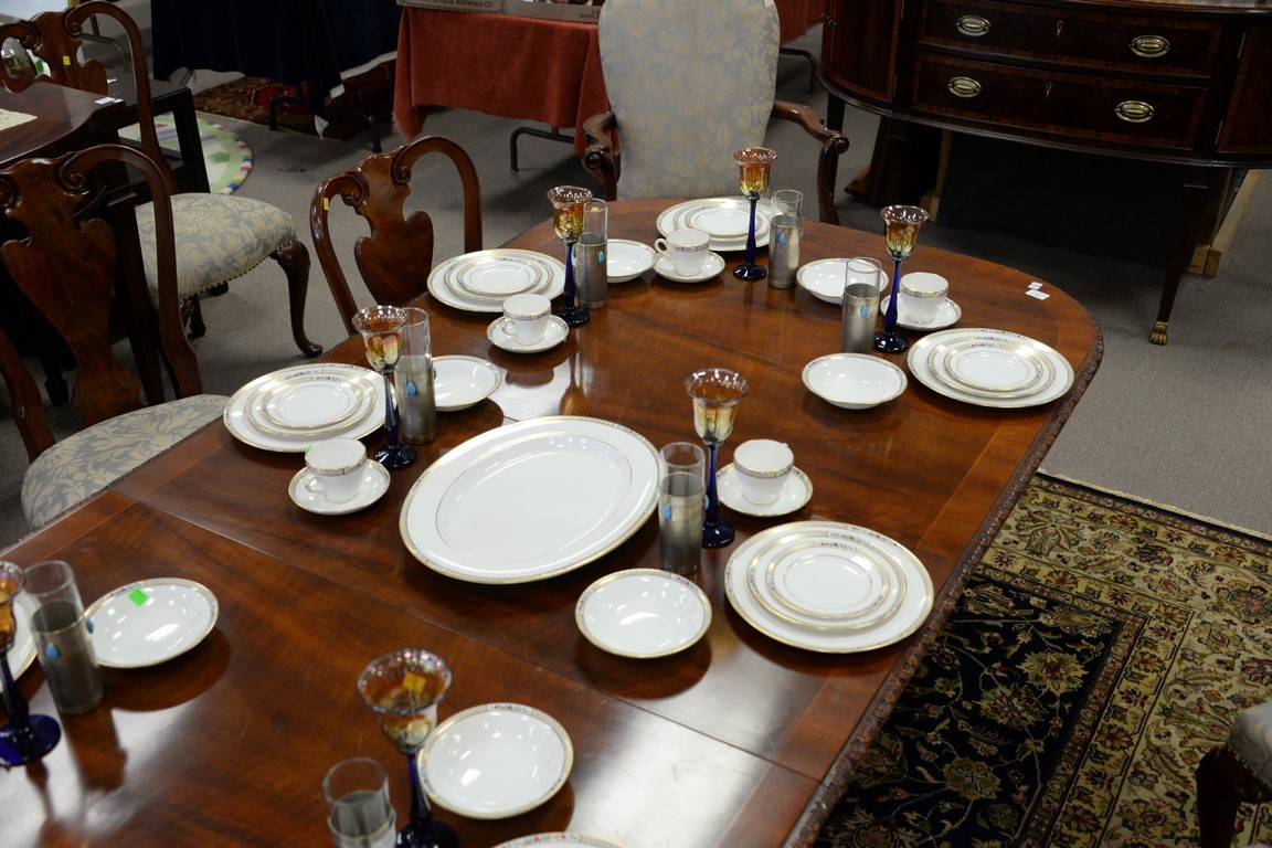 Lot 447: John Widdicomb Georgian style dining table, mahogany banded inlaid double pedestal with three 18inch leaves. ht. 30in., top: 46 x 7…