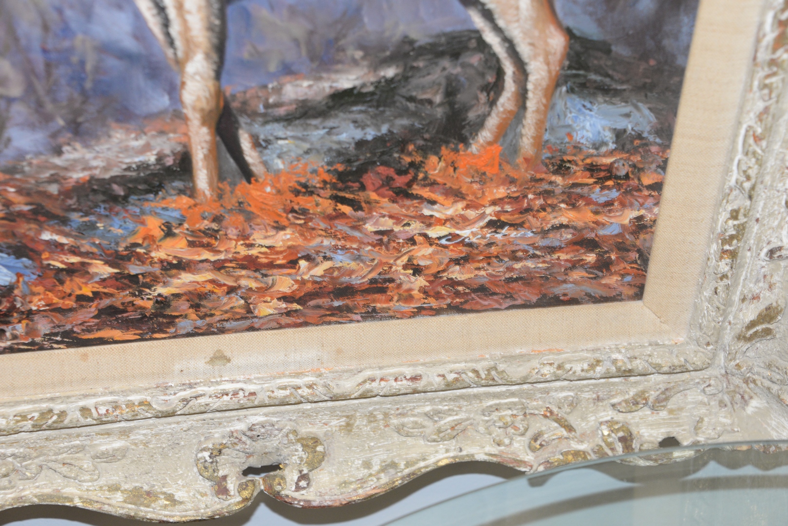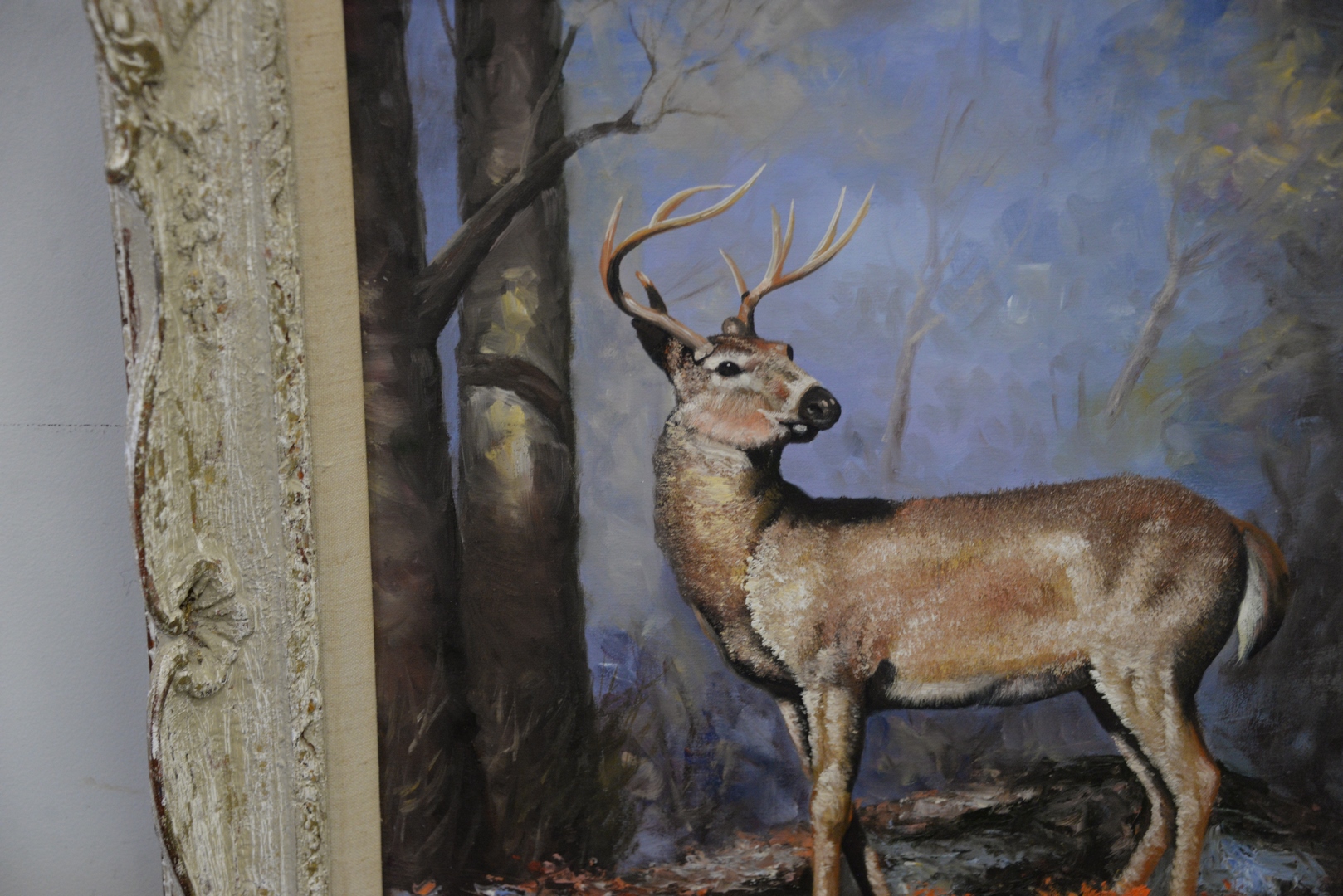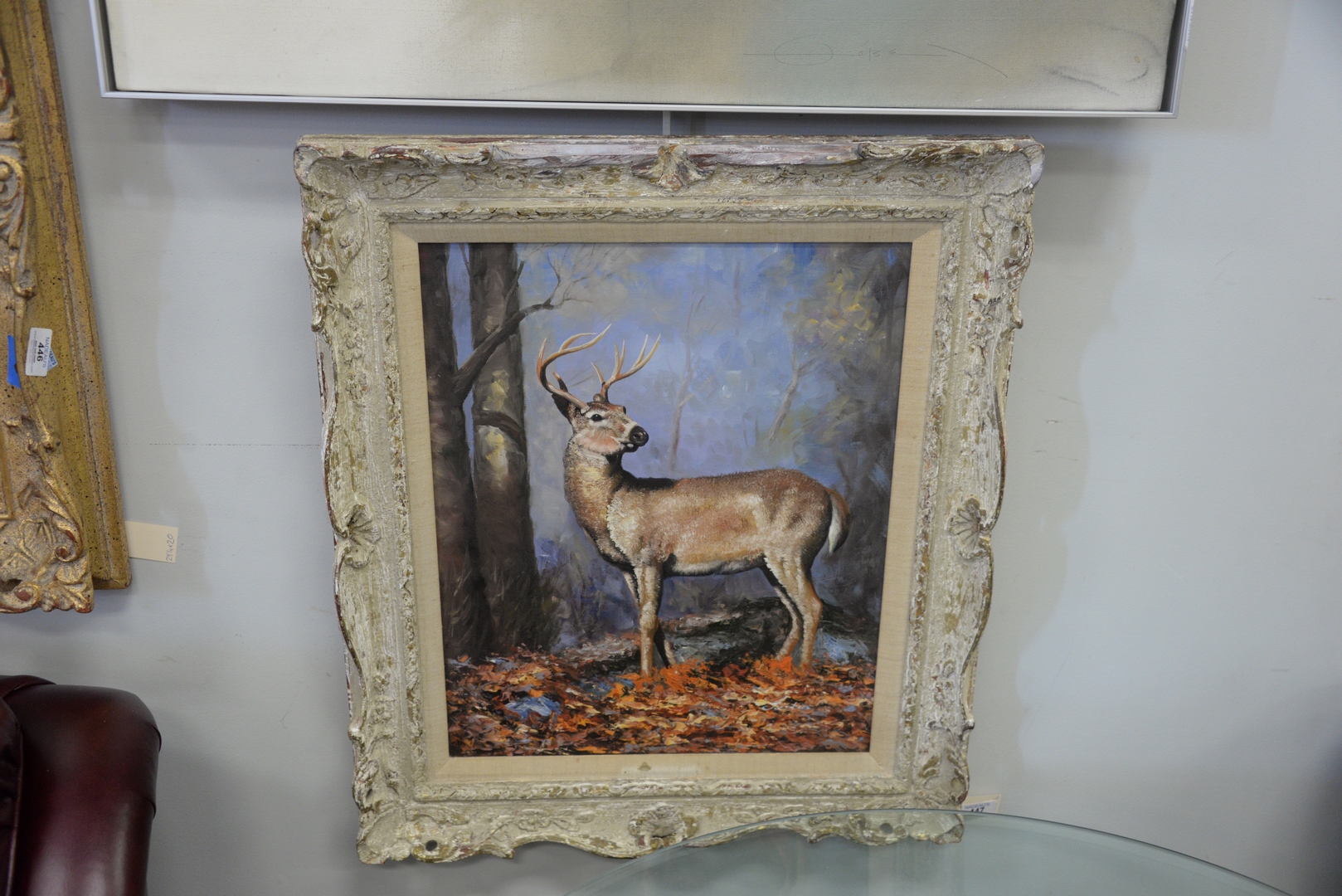 Lot 447: Justus (20th Century), Autumn Buck, oil on canvas laid on board, signed lower right “Justus”, 19 1/2″ x 15 1/2″.