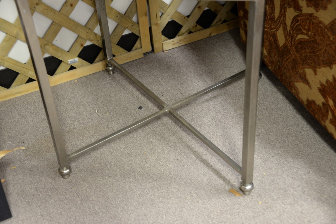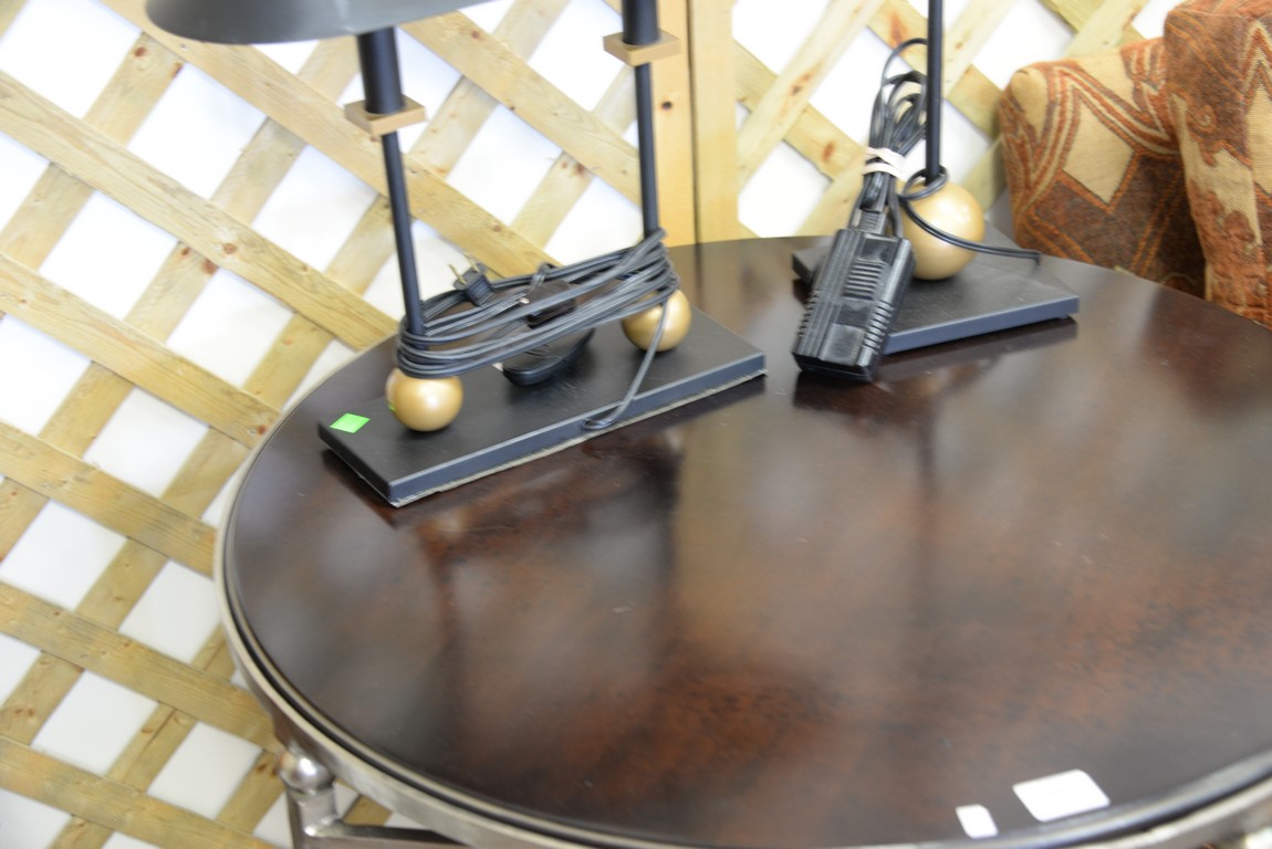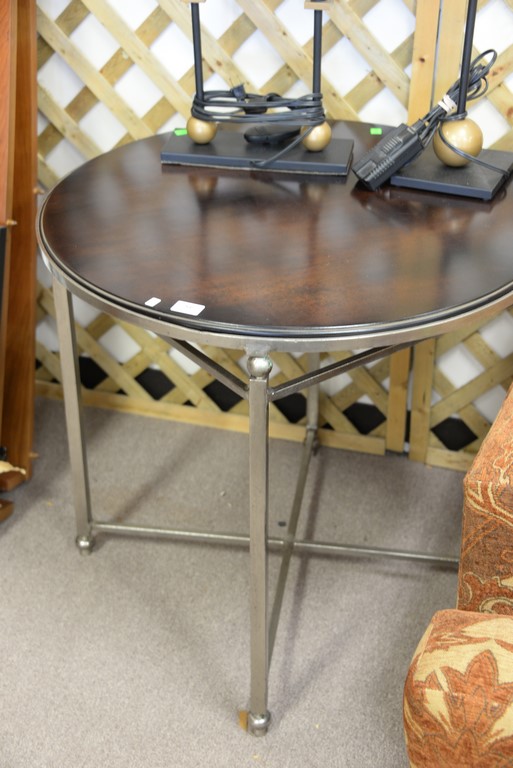 Millings Road, round end table, nickel color iron with wood top. ht. 27 1/2 in. dia. 30 in.