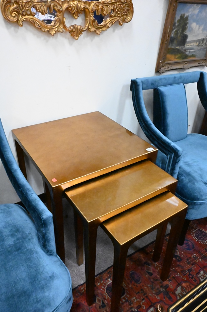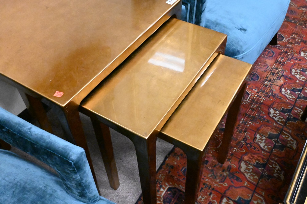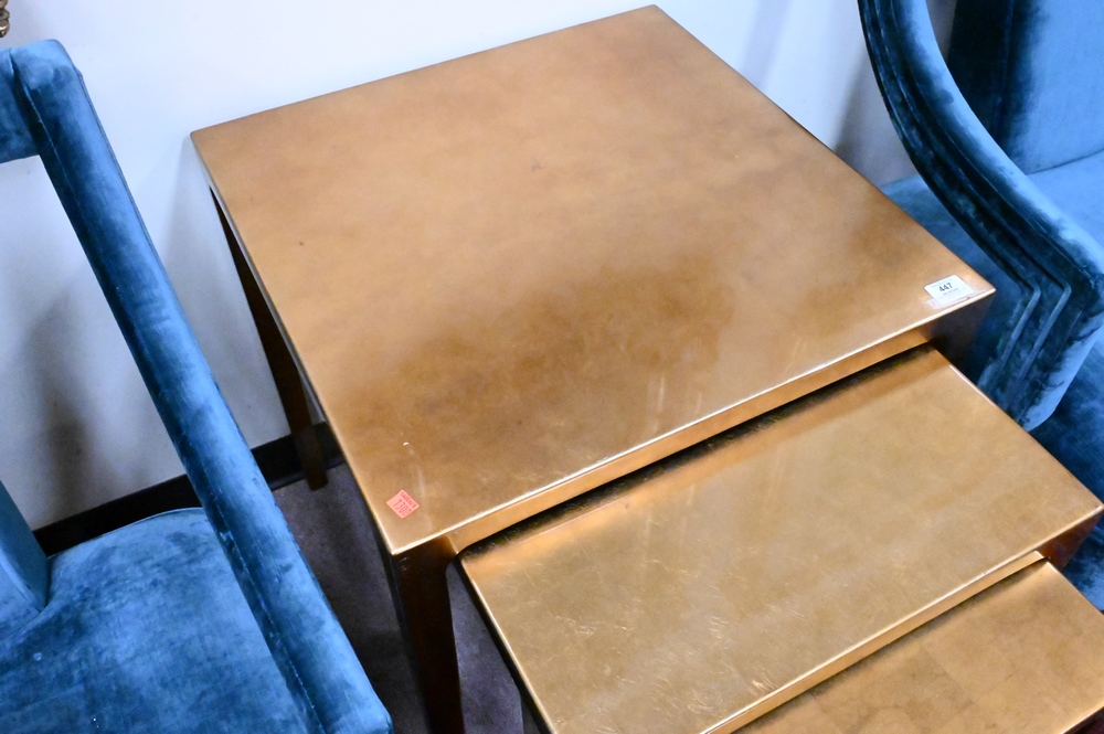 Nest of Three Contemporary Gold Tables, largest height 26 inches, top 23 1/2″ x 23 1/2″.