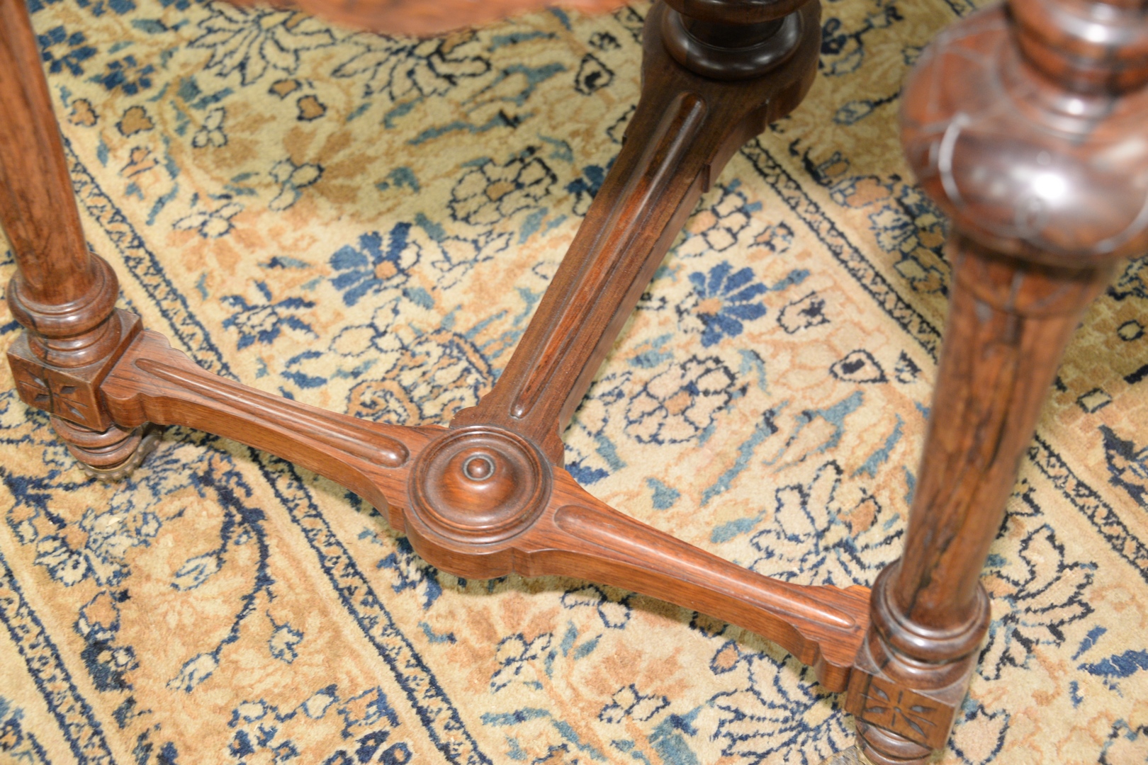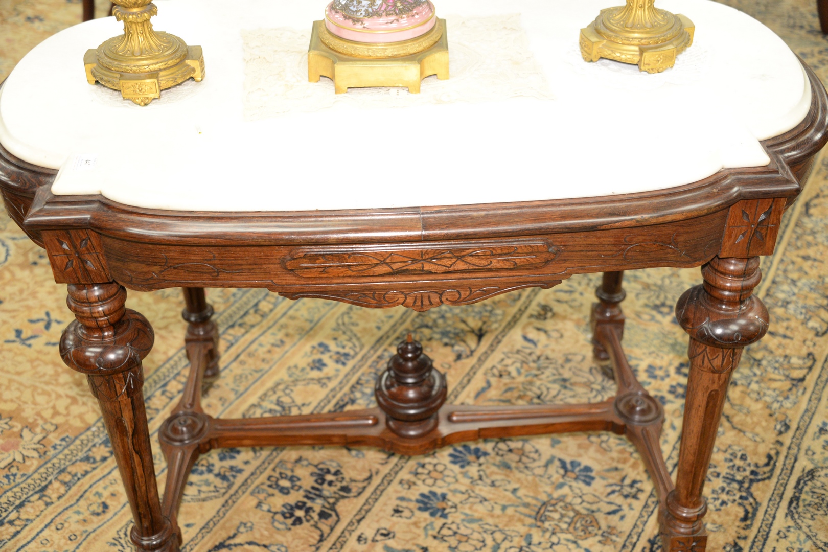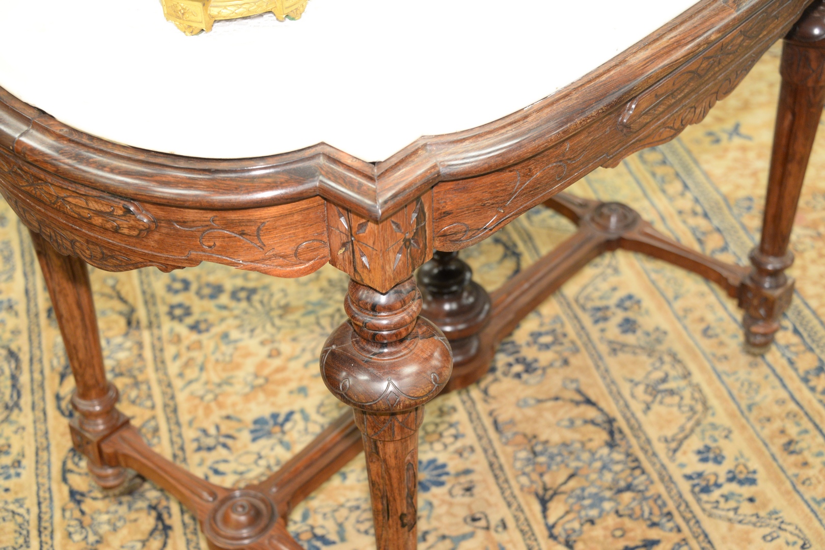 Lot 447: Rosewood Aesthetic Center Table with white marble top on turned and fluted legs with stretchers height 31 1/2 inches, top 27 x 43…