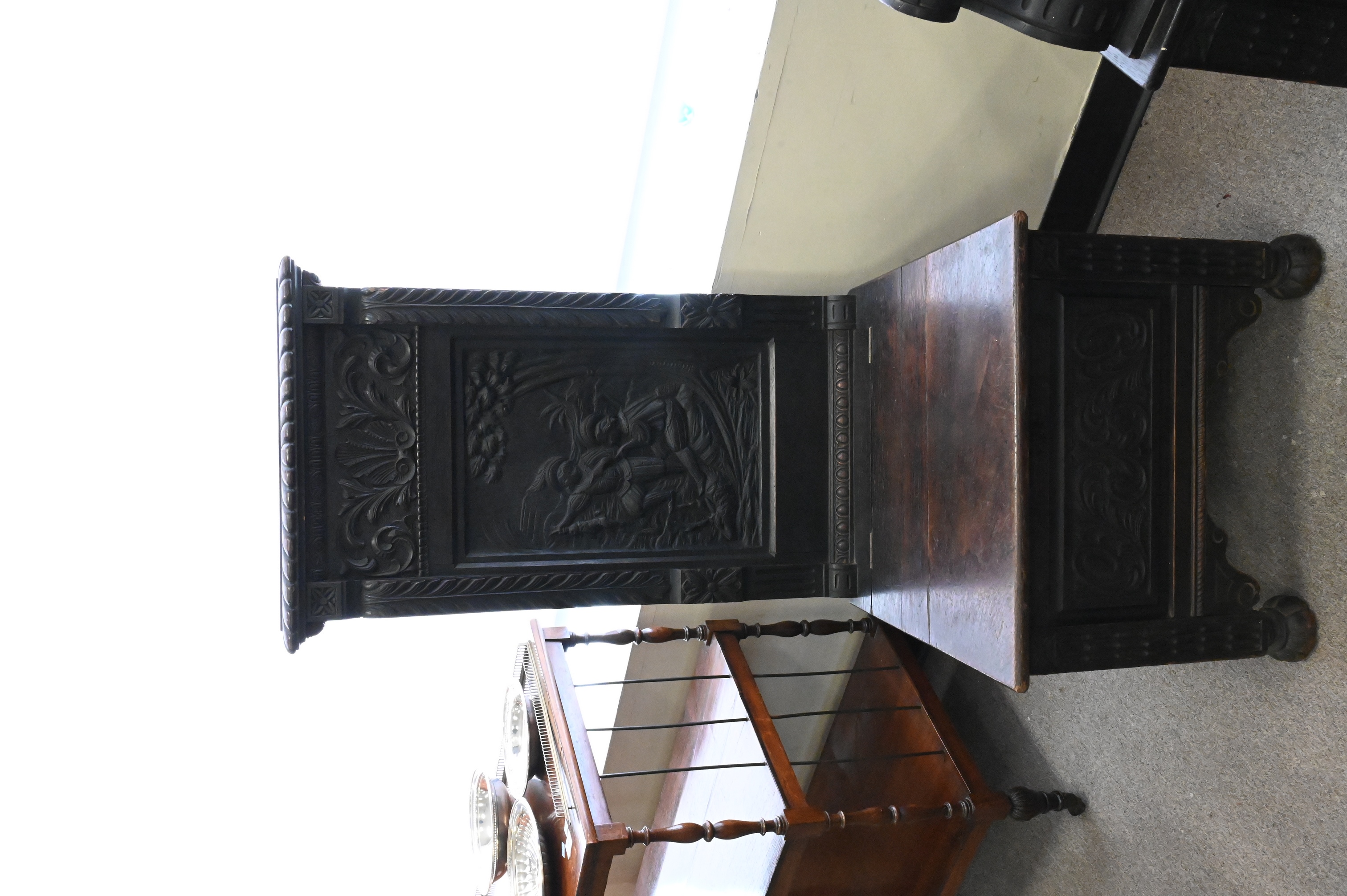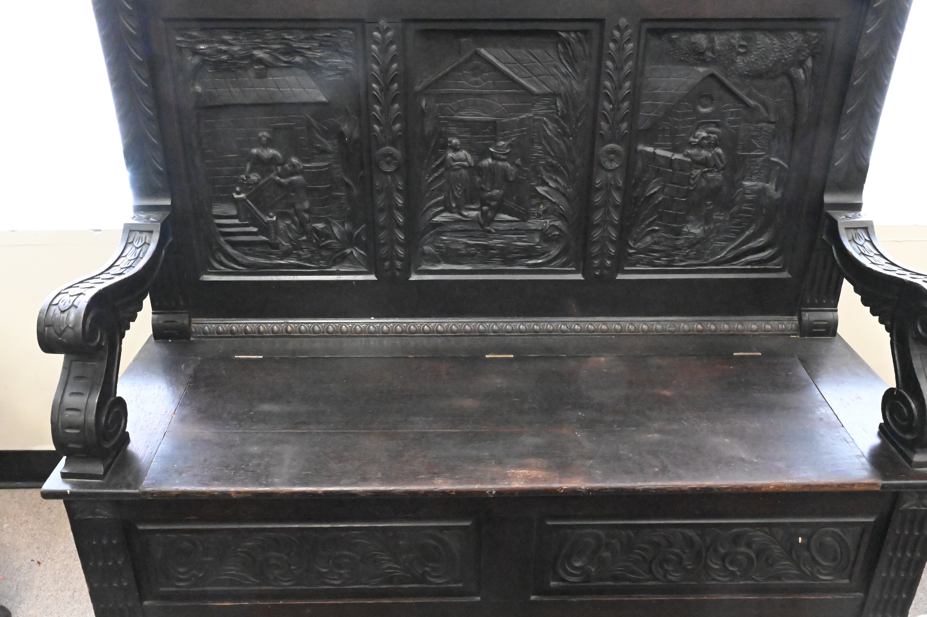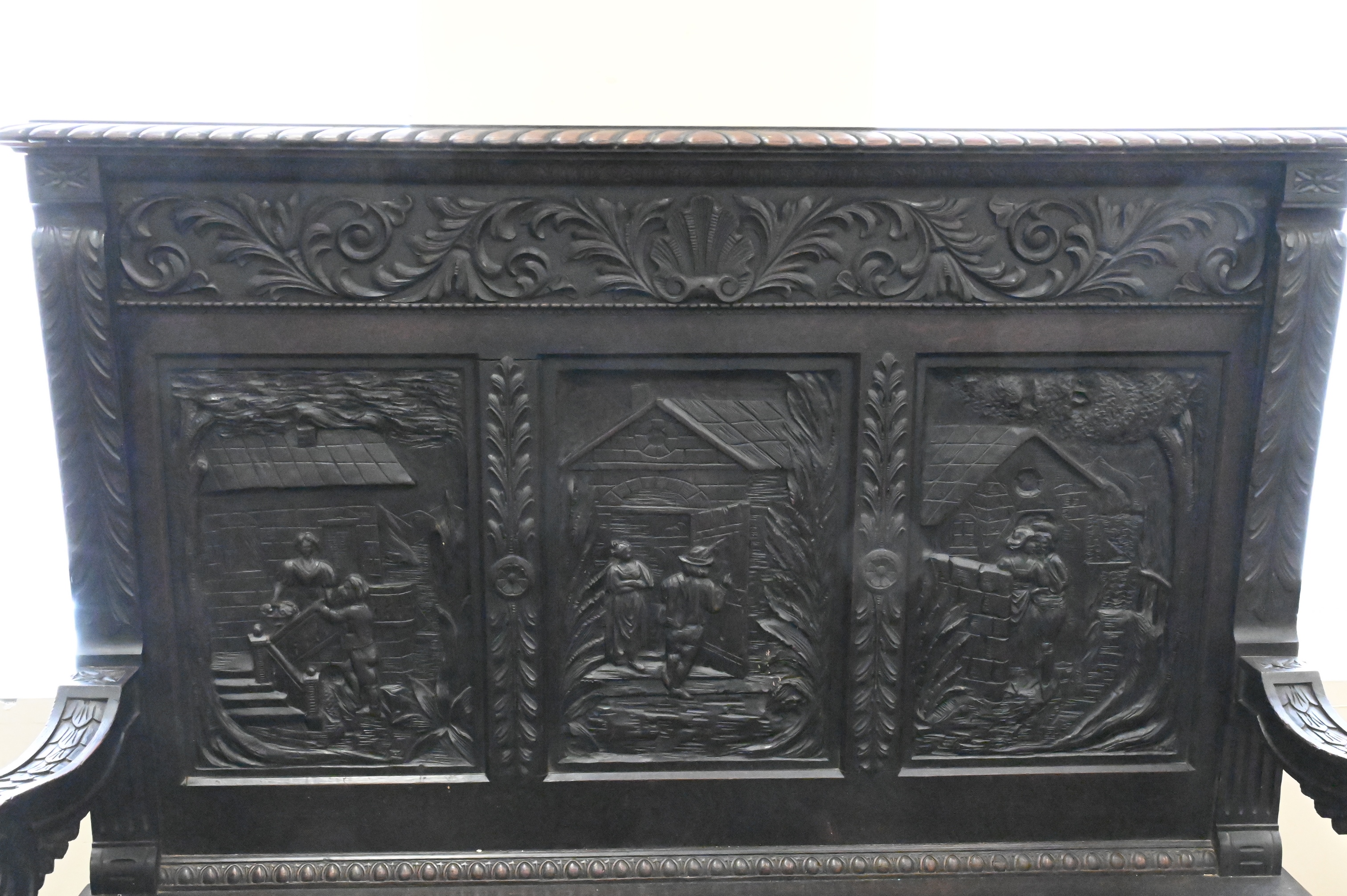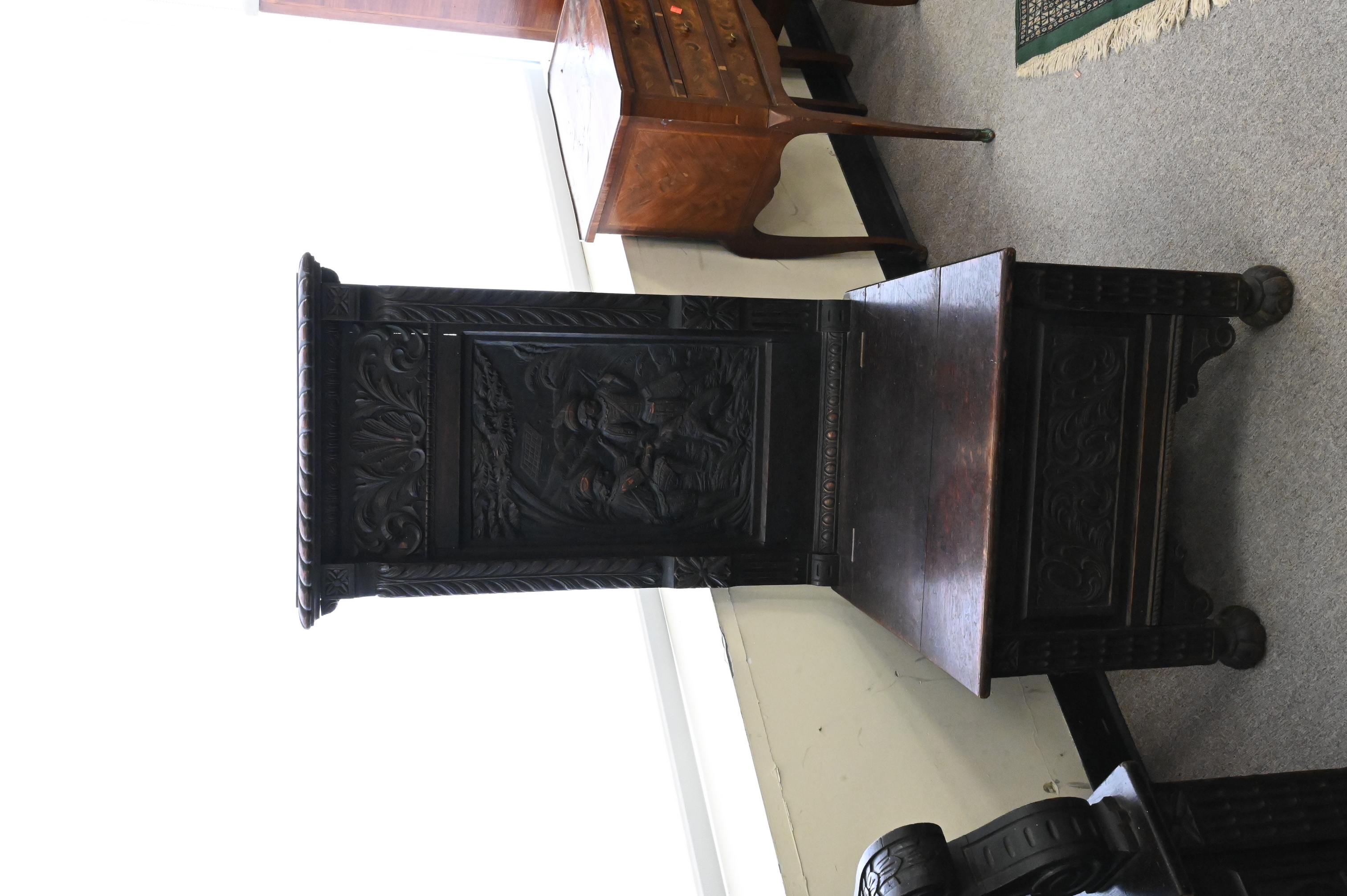 to include carved bench, and a pair of matching side chairs, all having lift top seats for storage
