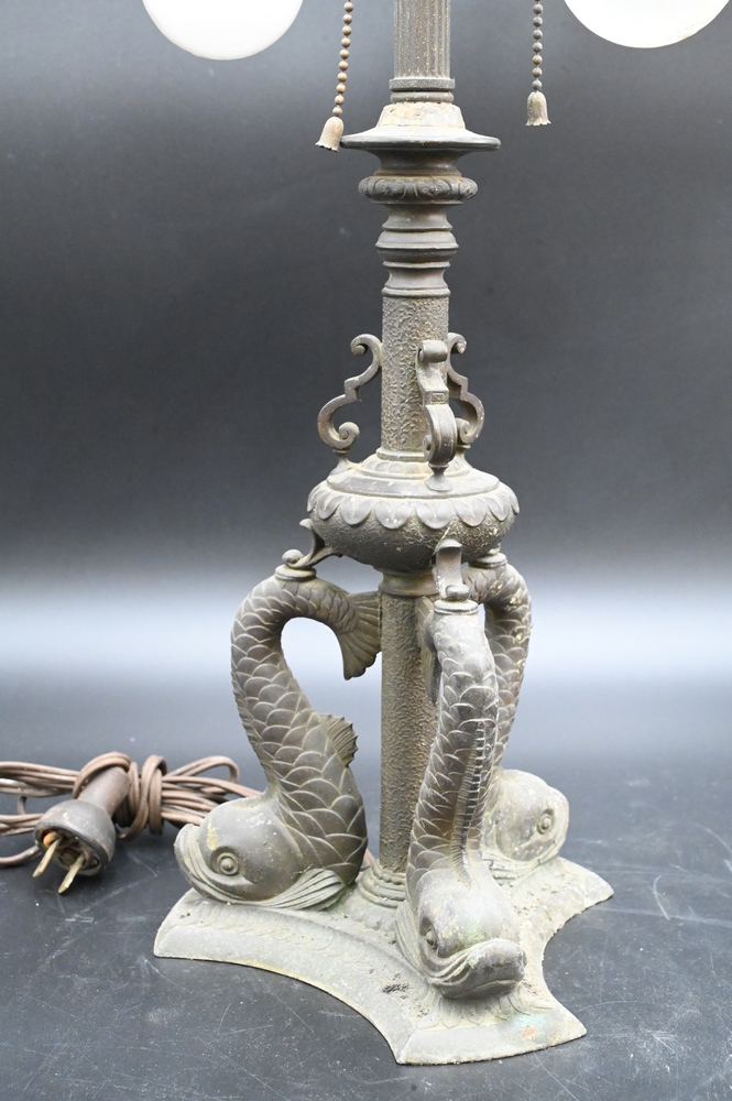 Triple Dolphin Base Lamp, for glass shade, height 22 inches. Provenance: Estate of Florence Yannios, Cheshire, CT.