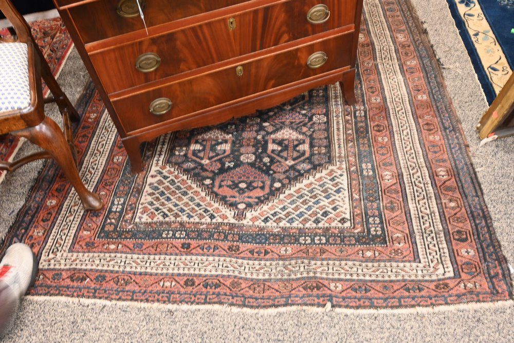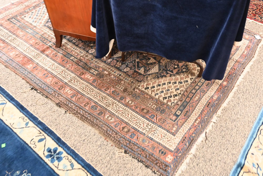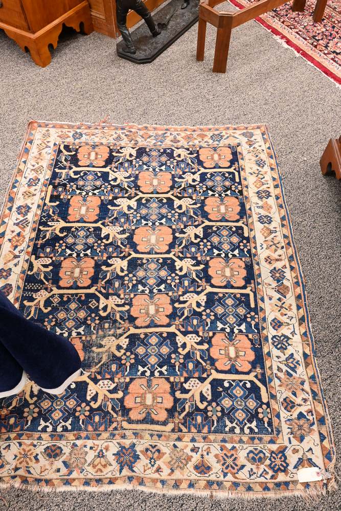 Lot 447: Two Caucasian Oriental Throw Rugs having wear 4′ x 5′ 2″ and 5′ 2″ x 7′ 2″ Provenance: The Estate of Diana Atwood Johnson.