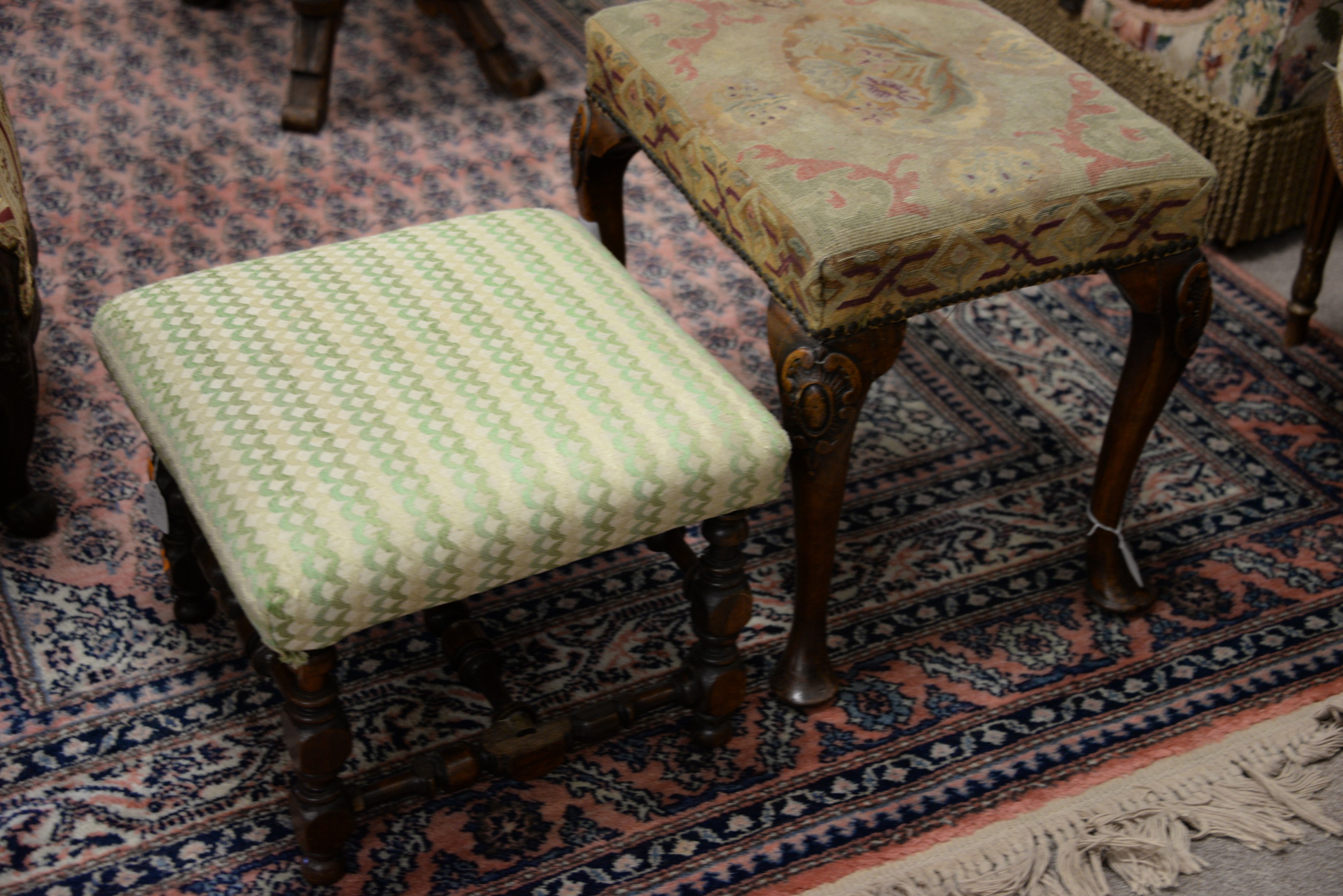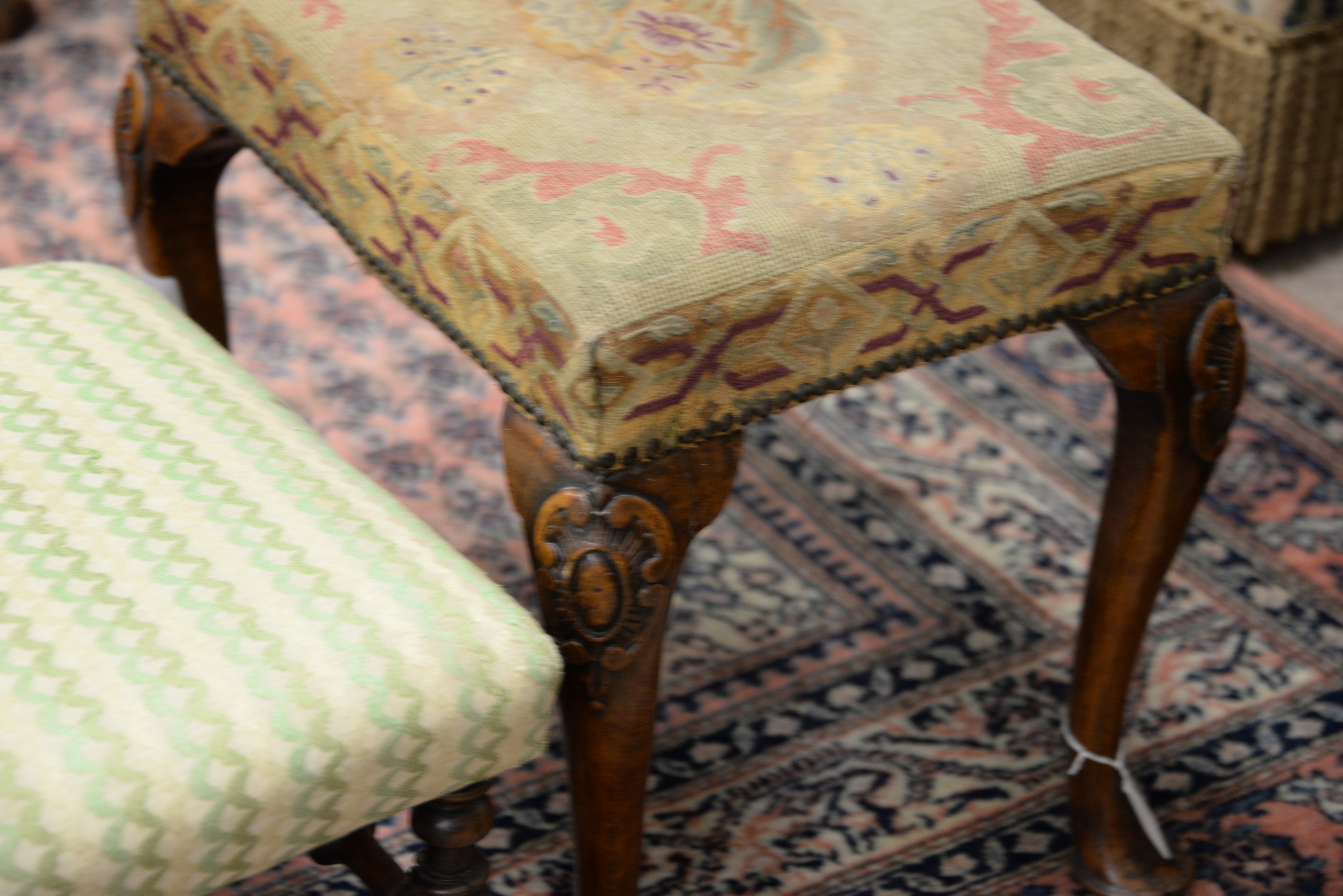 Two foot stools including French upholstered stool with pad feet and a stool with turned stretcher base.