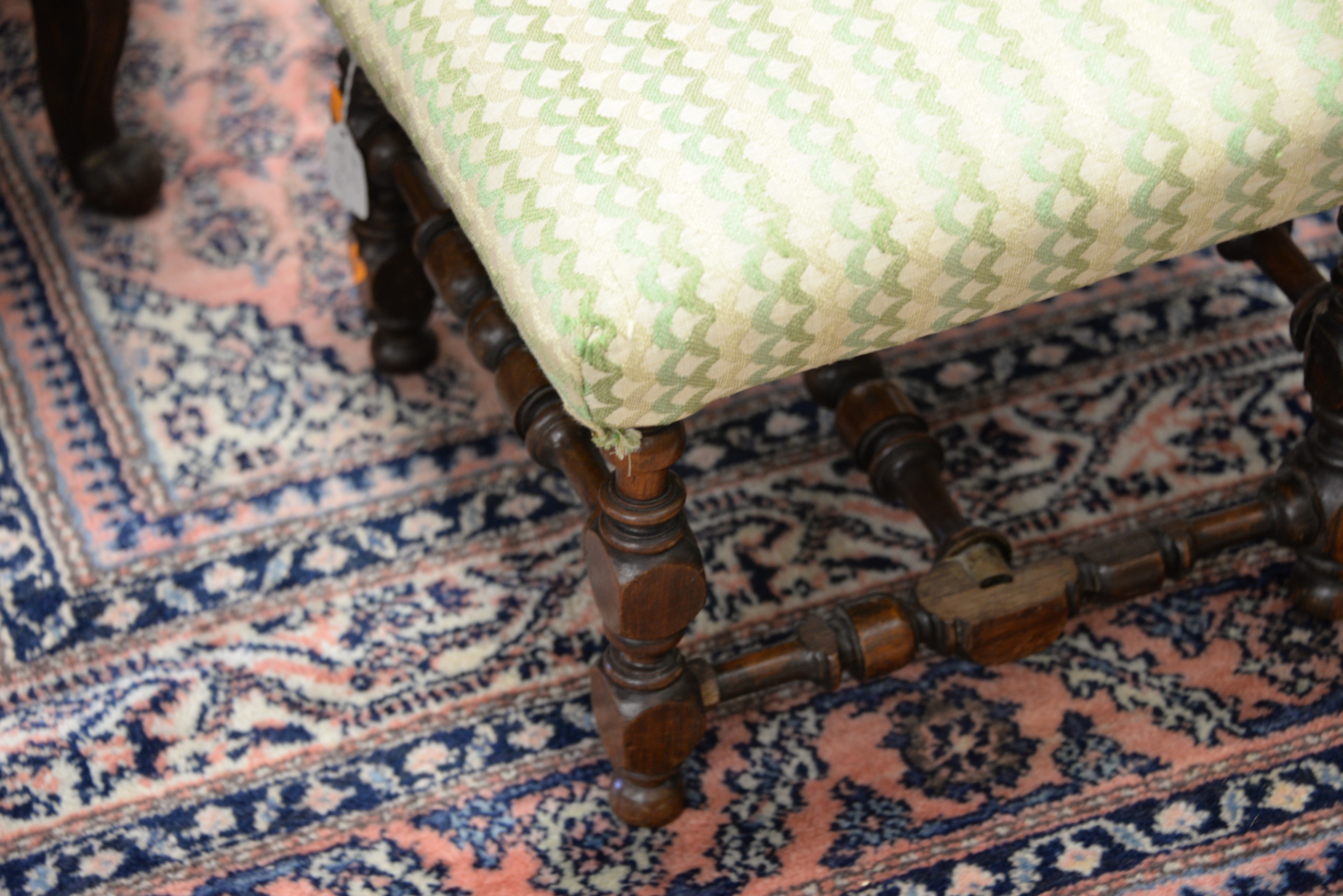 Lot 447: Two foot stools including French upholstered stool with pad feet and a stool with turned stretcher base