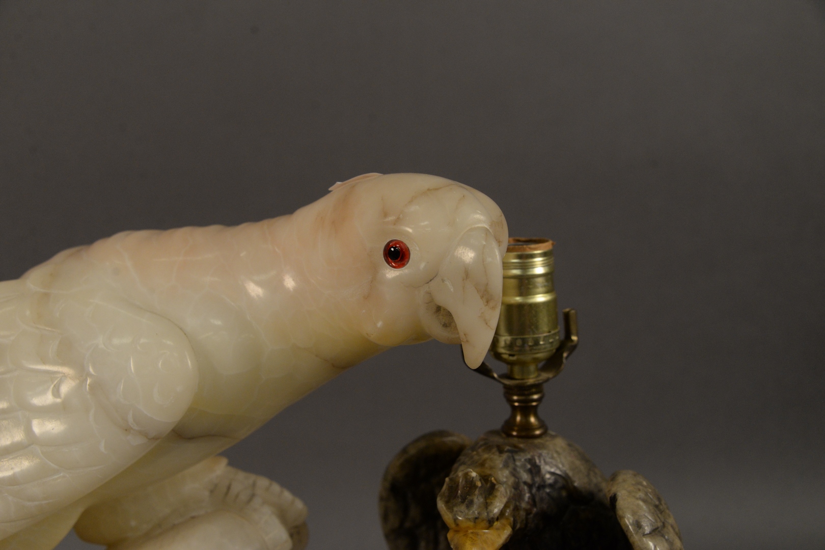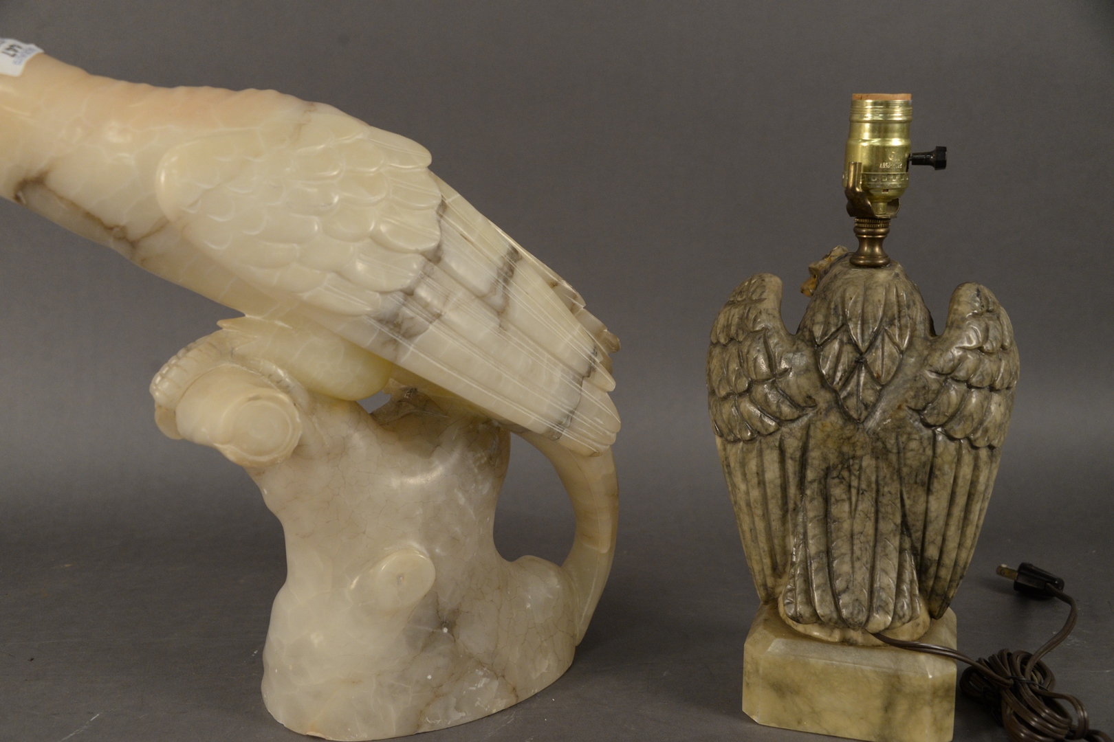Lot 447: Two Piece Lot, to include an alabaster carved parrot having glass eyes, along with a carved alabaster eagle made into a table lamp, lamp height 14 1/4 inches.
