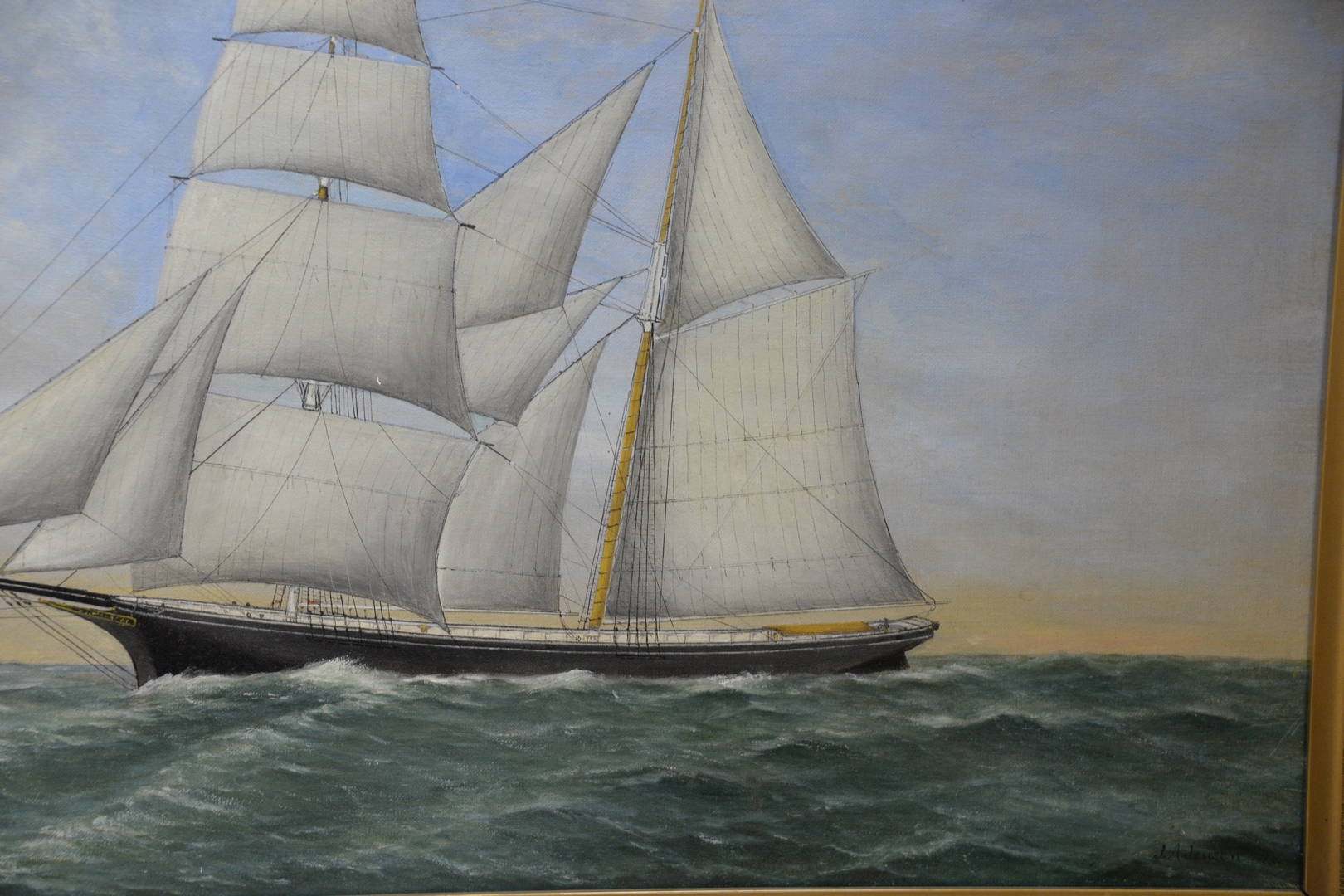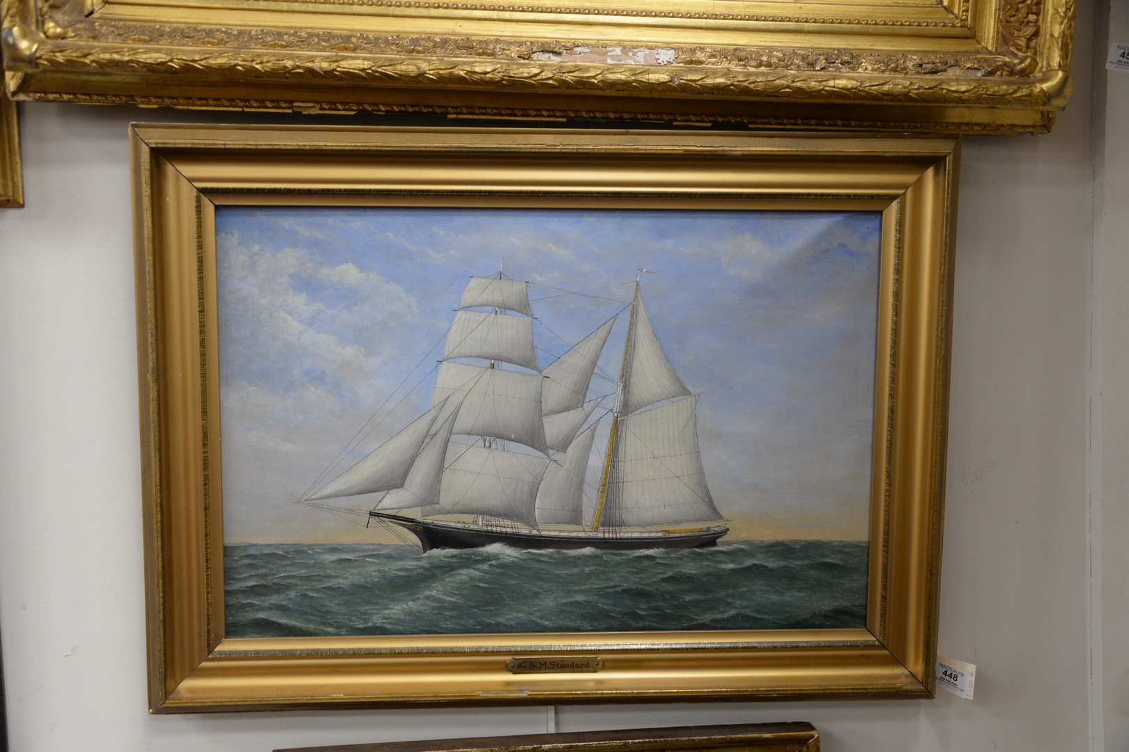 Lot 448: American School Early 20th Century The N.M. Standard schooner in full sail, signed and dated lower right J.A. Jesen, 1913, 23 x 16.