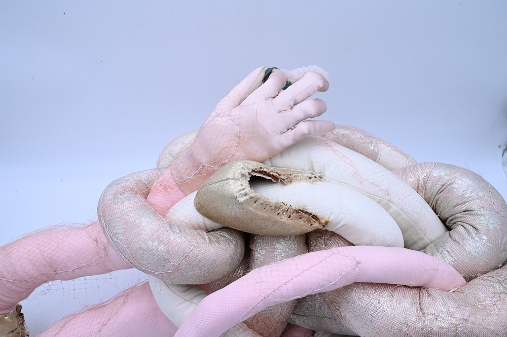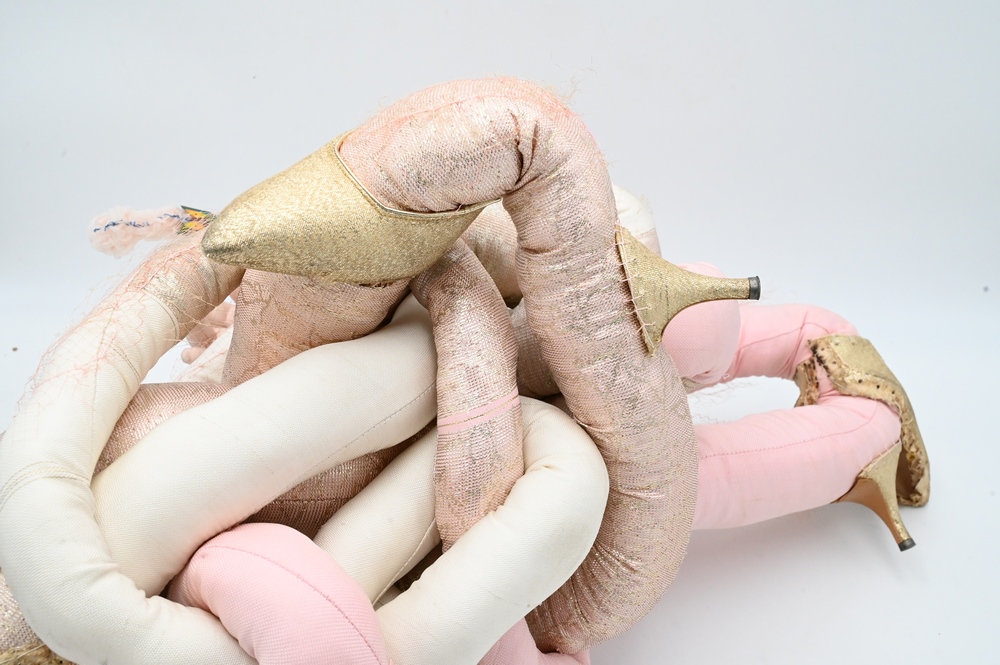 Christian Holstad (b. 1972), Pink and White Snake with Gold Lame, 2009, vintage obi, gold lame, vintage millinery supplies, polyfilla, vintage, netting, trimming, paillettes, 28″ x 14″ x 18″. Provenance: Property from the Estate of Anita and Burton Reiner.