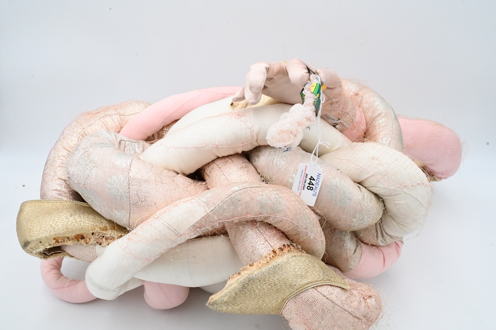 Lot 448: Christian Holstad (b. 1972), Pink and White Snake with Gold Lame, 2009, vintage obi, gold lame, vintage millinery supplies, polyfilla, vintage, netting, trimming, paillettes, 28″ x 14″ x 18″. Provenance: Property from the Estate of Anita and Burton Reiner.