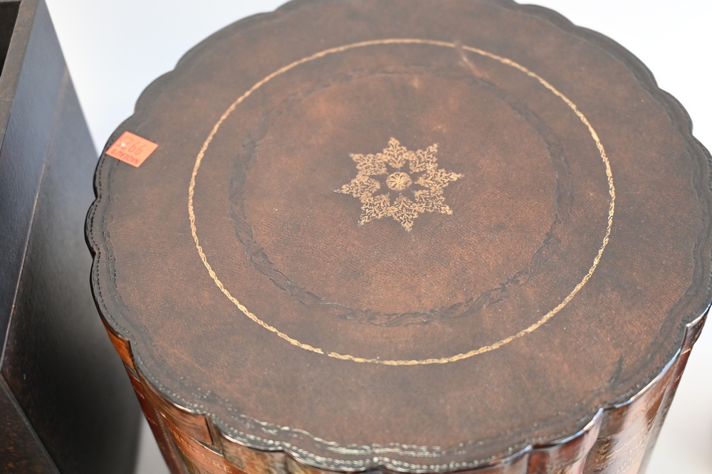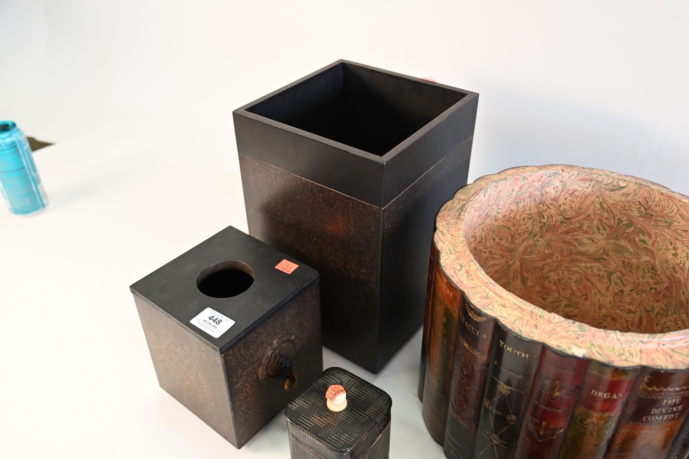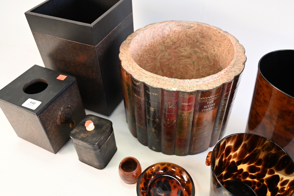 Lot 448: Eight Piece Lot, to include a Maitland Smith covered box with book spine motif, a glass faux tortoise shell basket and soap dish, matching Chinese themed wastebasket and tissue holder, a small burl vessel, a faux burl wastE basket along with a lidded candle, Maitland Smith height 10 inches.