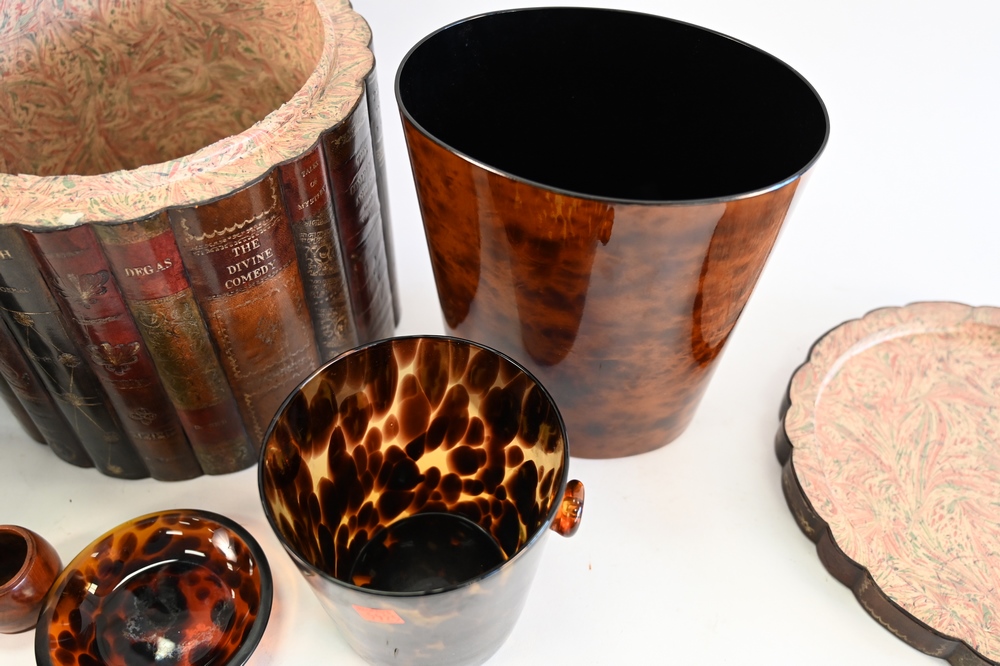 Eight Piece Lot, to include a Maitland Smith covered box with book spine motif, a glass faux tortoise shell basket and soap dish, ma…