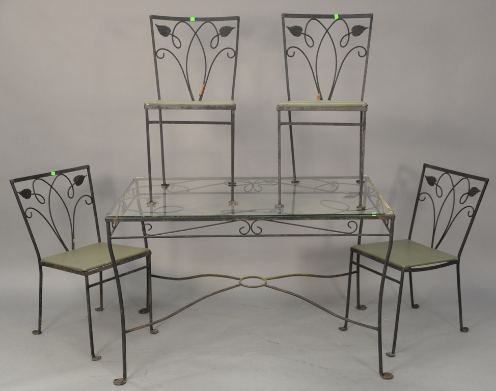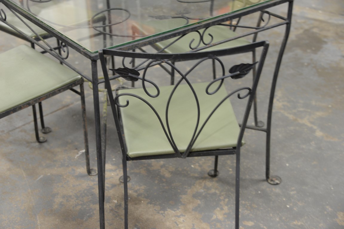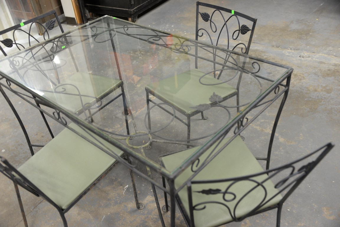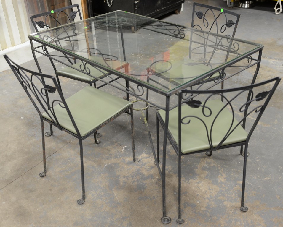 Lot 448: Five piece set including iron glass top table and four chairs.