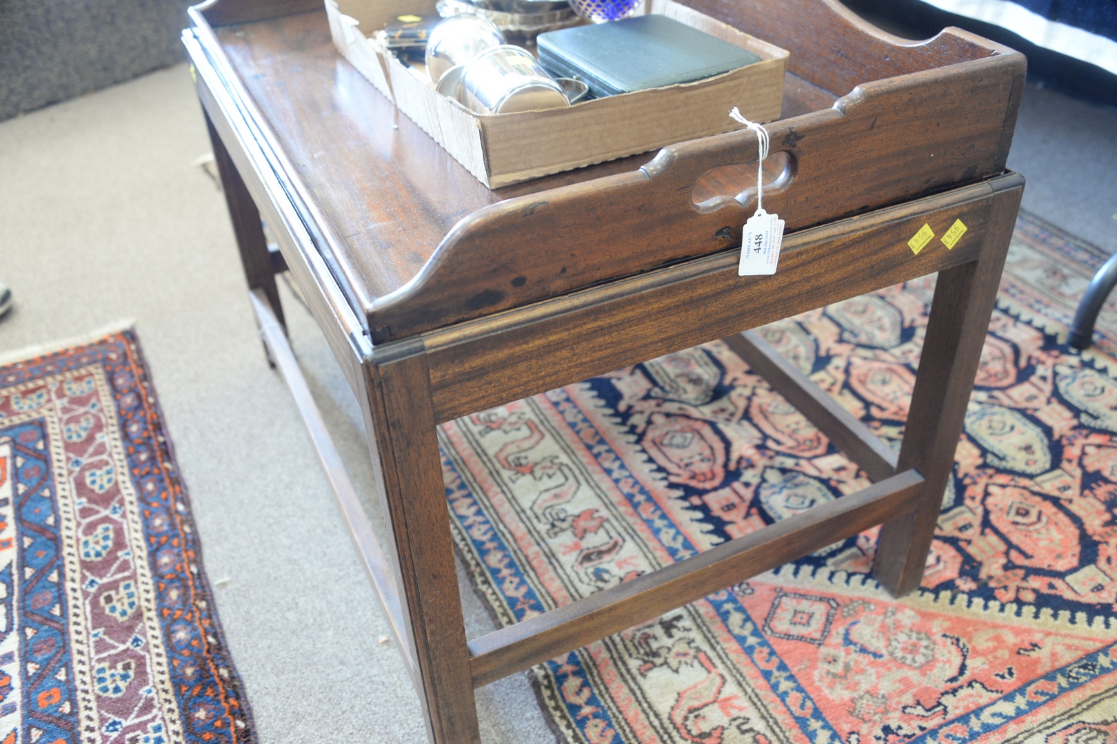Lot 448: George IV Mahogany Serving Tray now mounted on custom Chippendale-style stand. height 21 3/4 inches with gallery, top 20 1/2 x 29.
