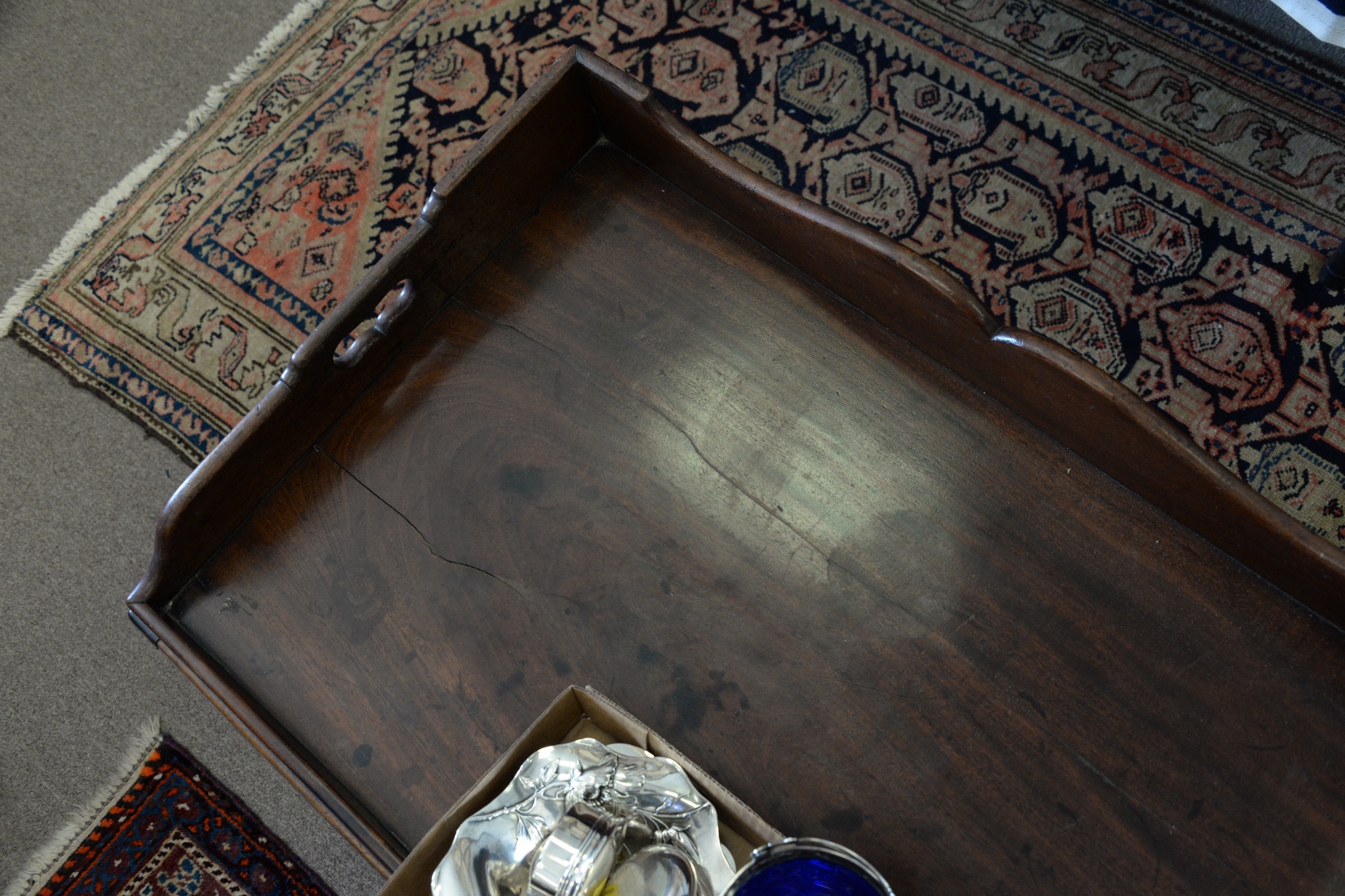 George IV Mahogany Serving Tray now mounted on custom Chippendale-style stand.
