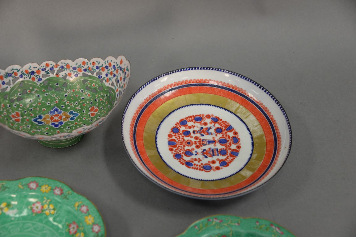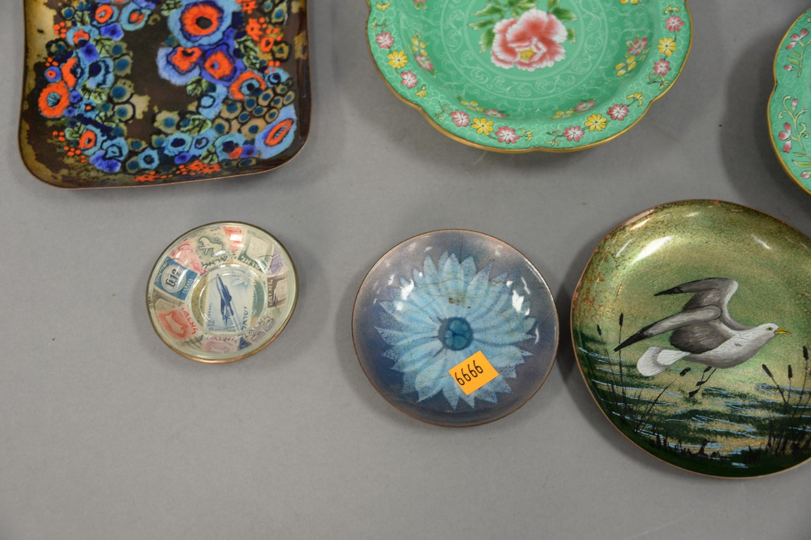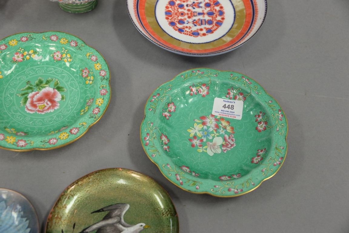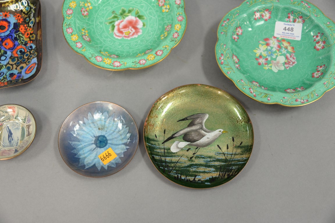 Lot 448: Group of five enameled dishes including seagull plate signed indistinctly, pair of Chinese enameled footed dishes. dia. 4 to 7.