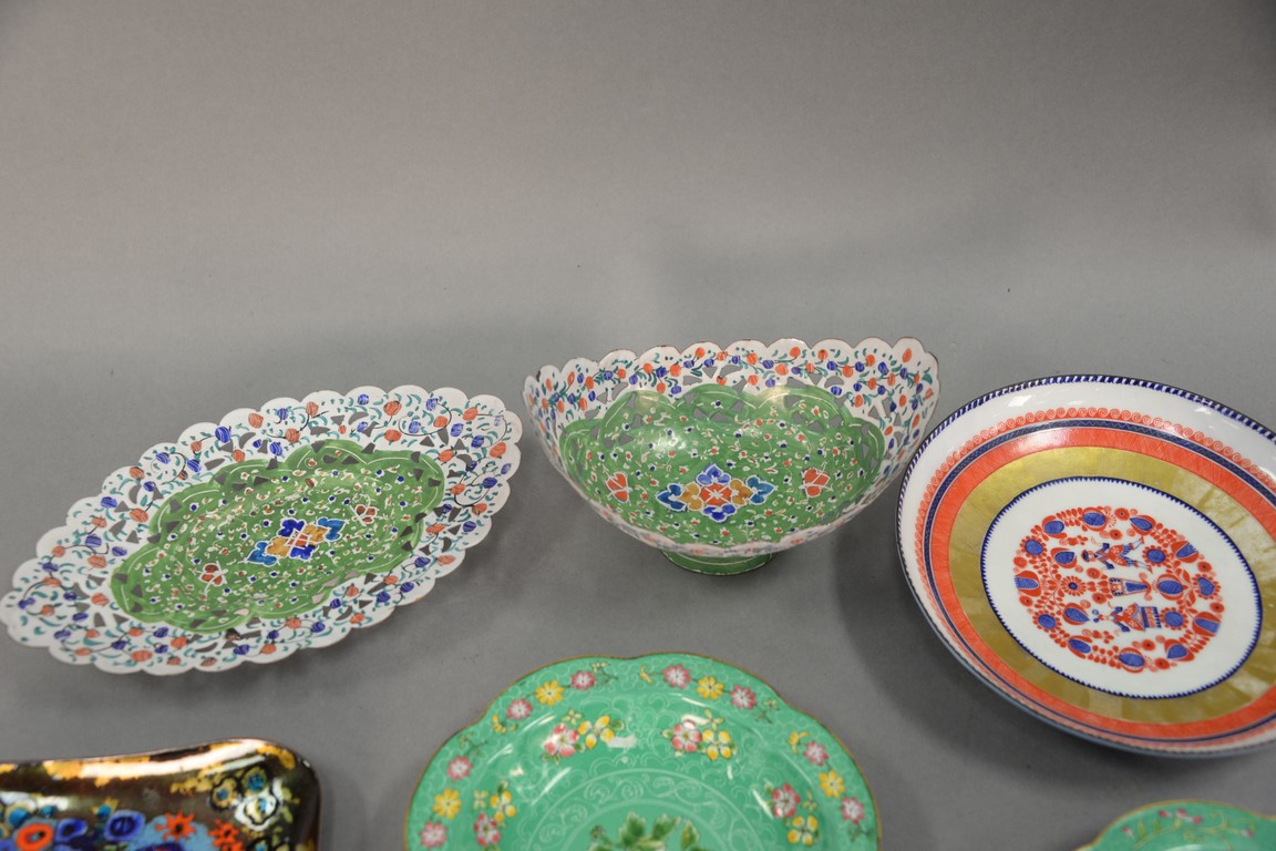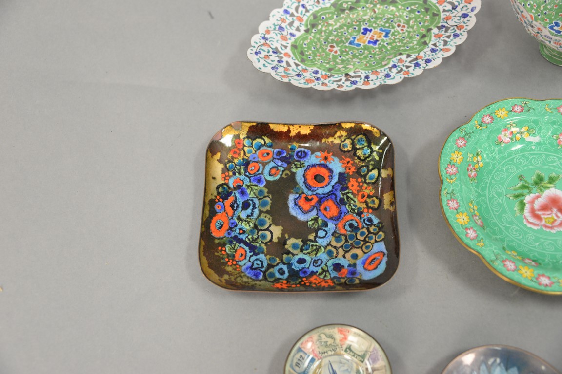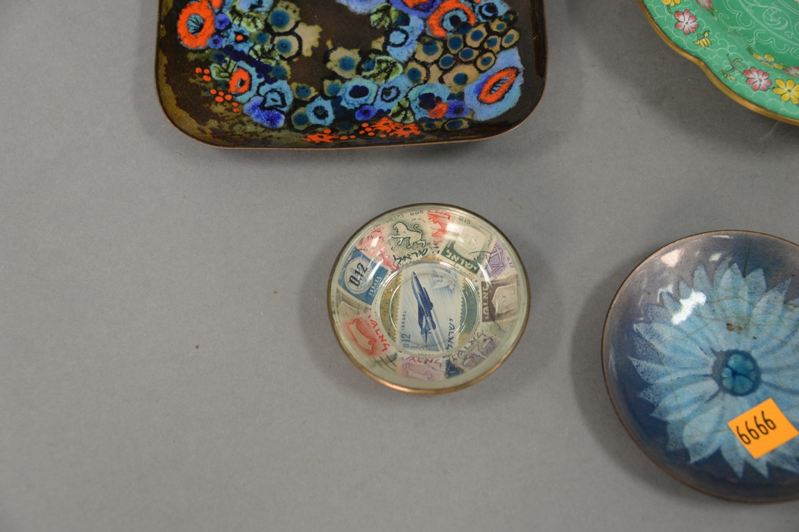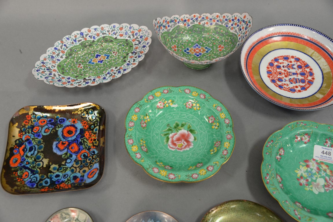 Lot 448: Group of five enameled dishes including seagull plate signed indistinctly, pair of Chinese enameled footed dishes. dia. 4 to 7.