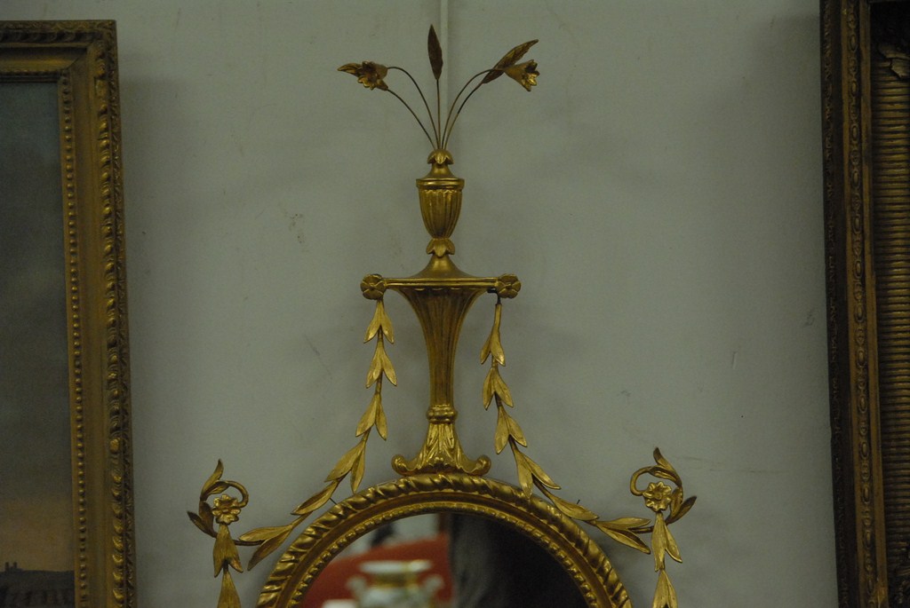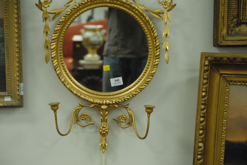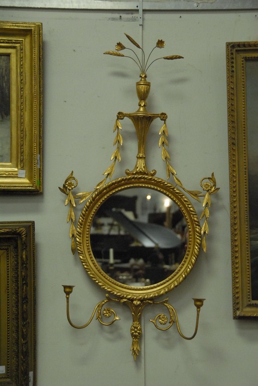 Lot 448: Pair of Fineberg gilt girandole mirrors, round flat glass having gilt urn tops with leaf and vine designs, and two candle holders. h…