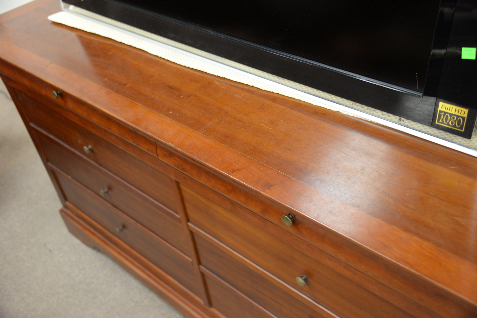 Three piece lot to include cherry double chest and two stands. ht. 33in., lg. 65in., dp. 19 1/2 in.