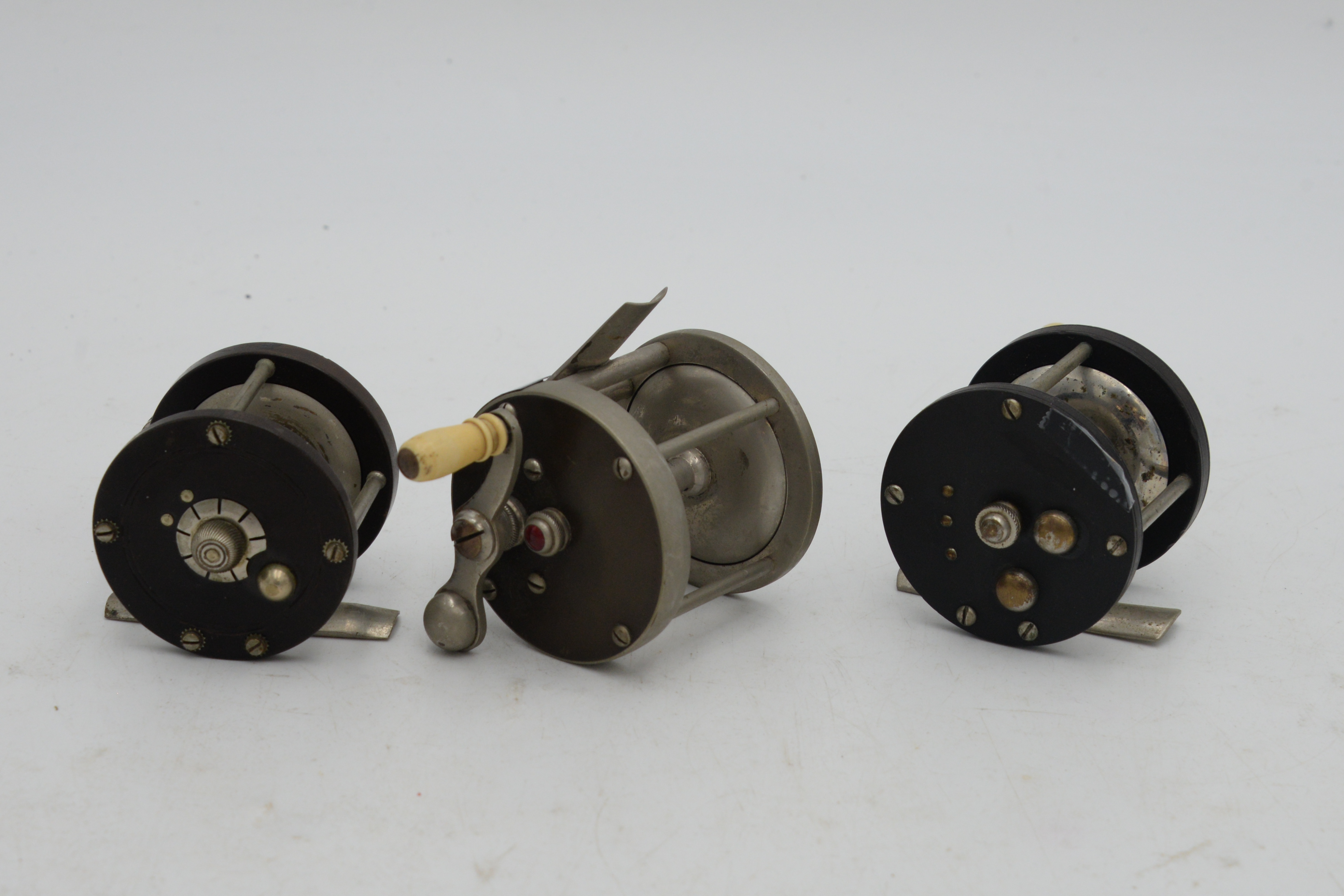 Three Vintage Baitcasting Reels Bakelite, to include one Julius Van Hoff, along with one empire city, etc.