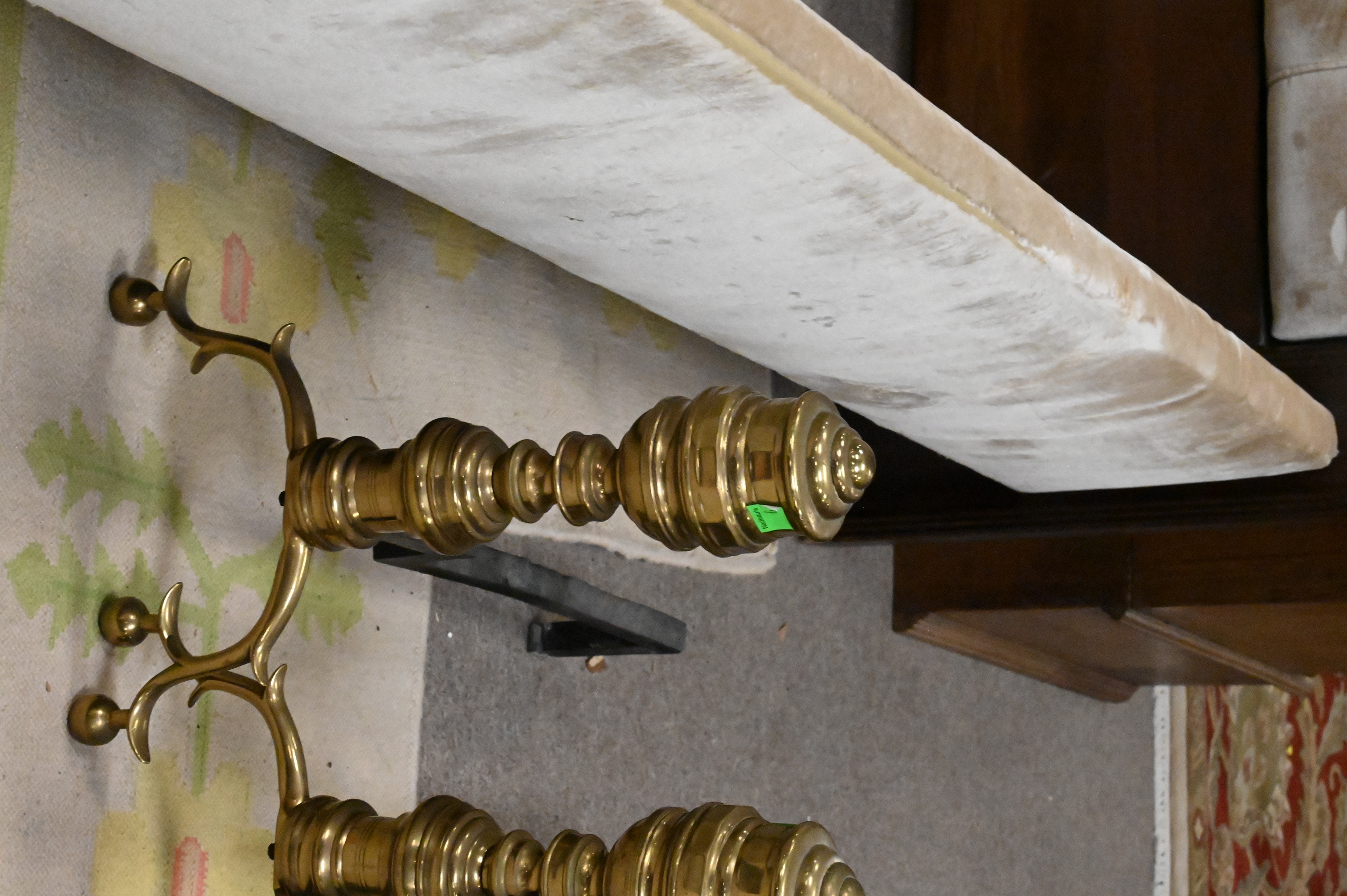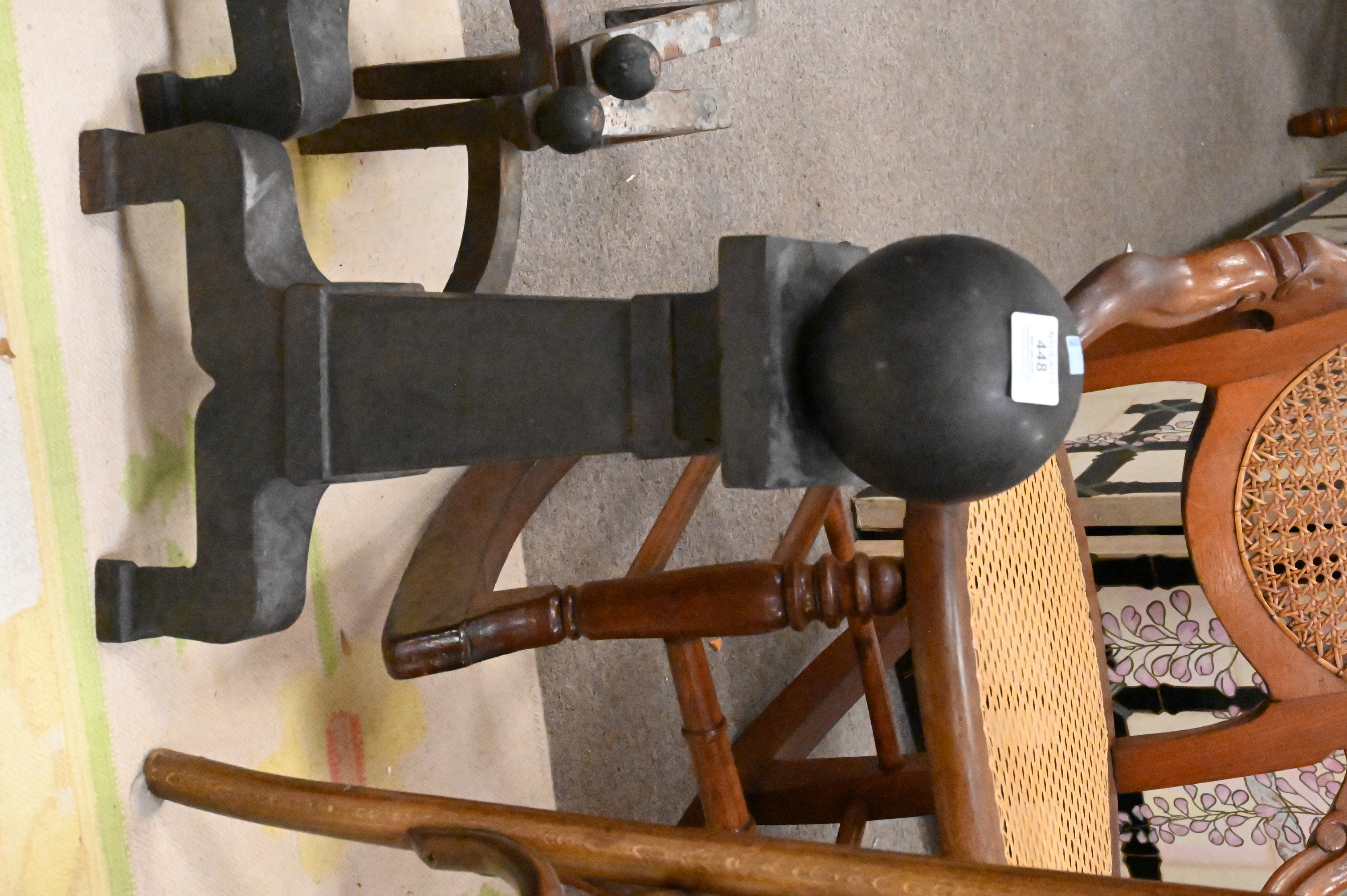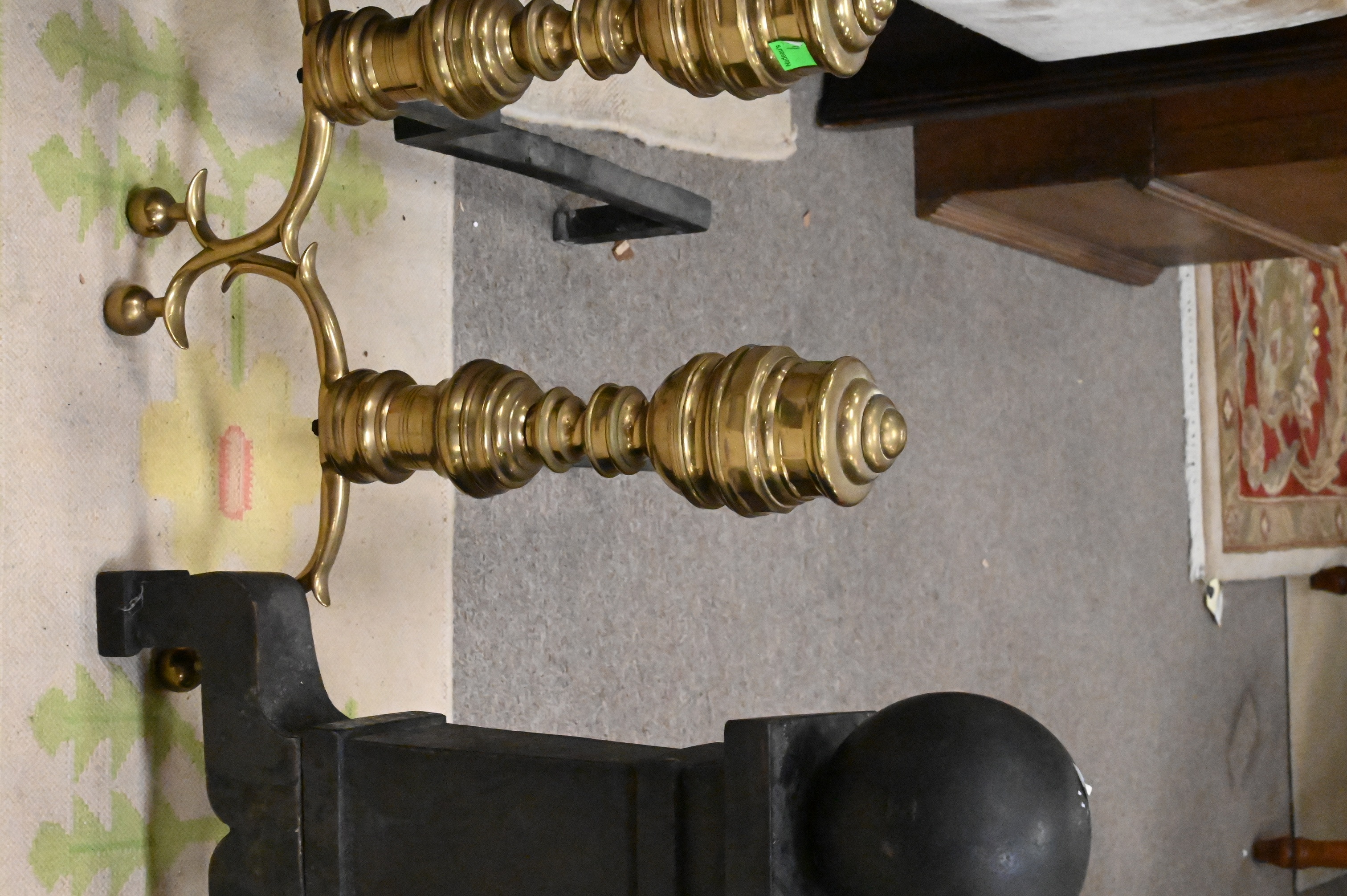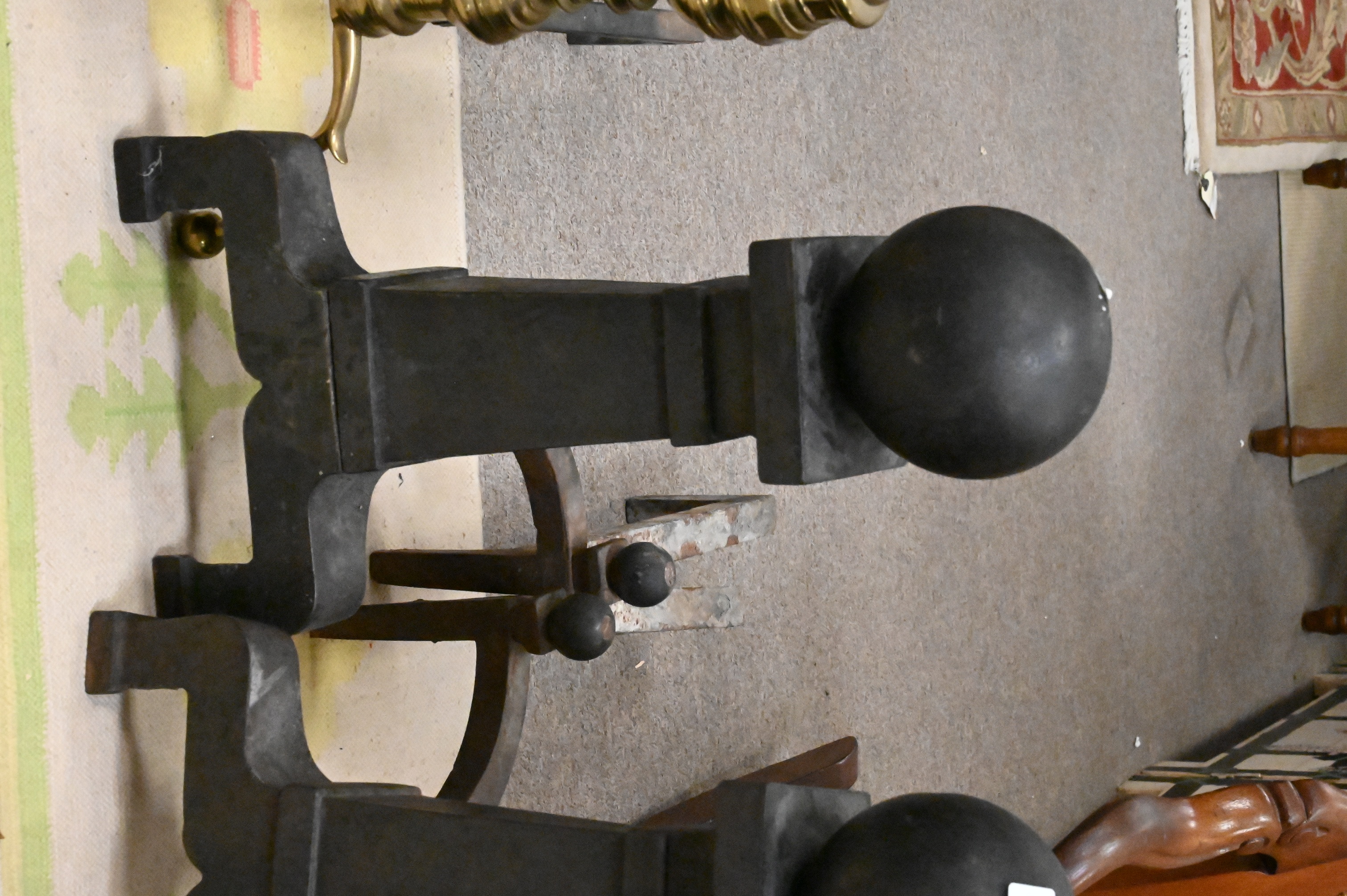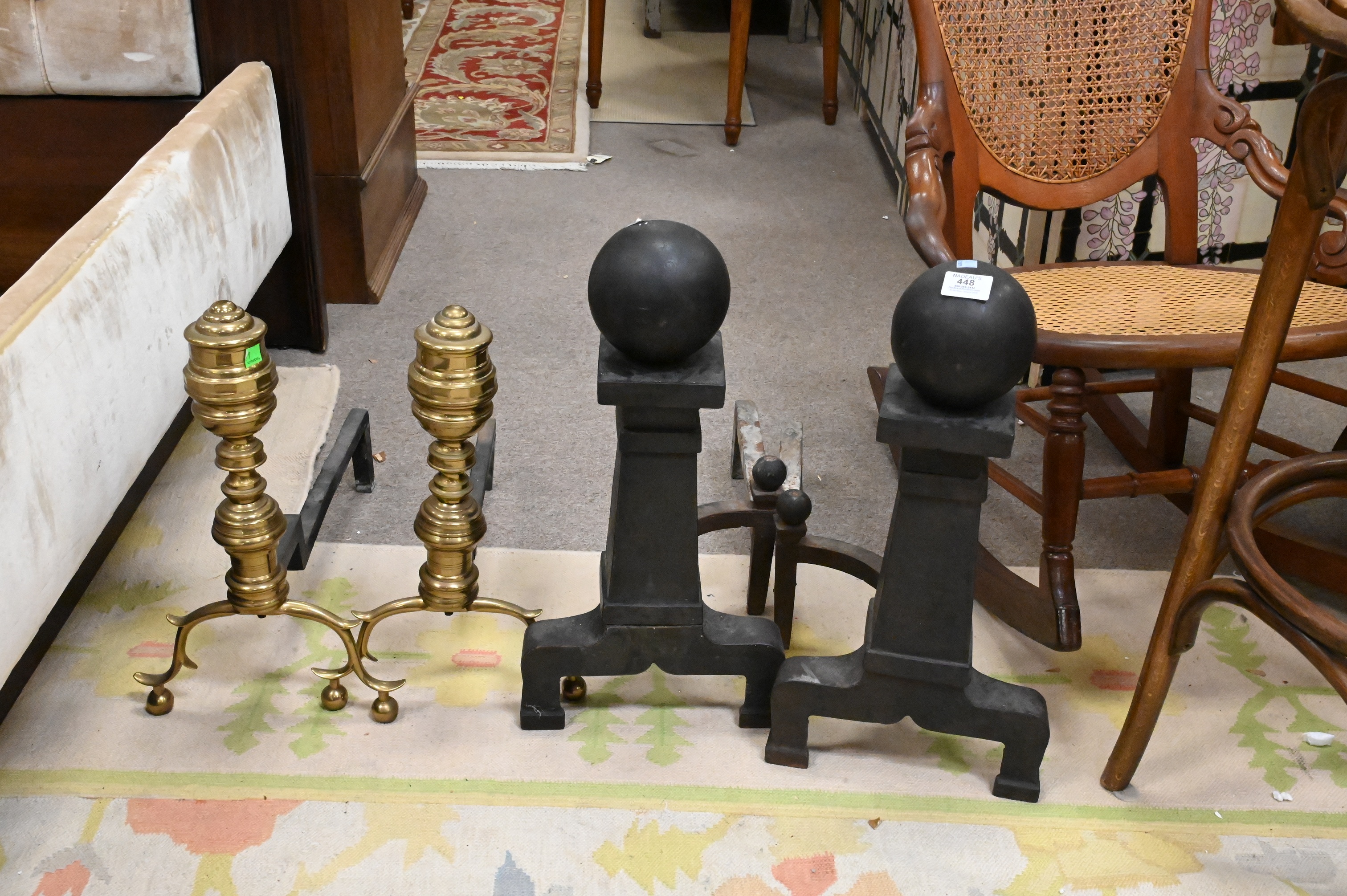Including a pair of cannon ball iron examples with spherical finials raised on square plinth bases, height 21 inches, and a pair of turned brass examples with stepped ball finials and arched legs